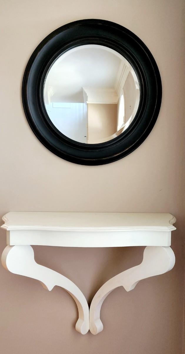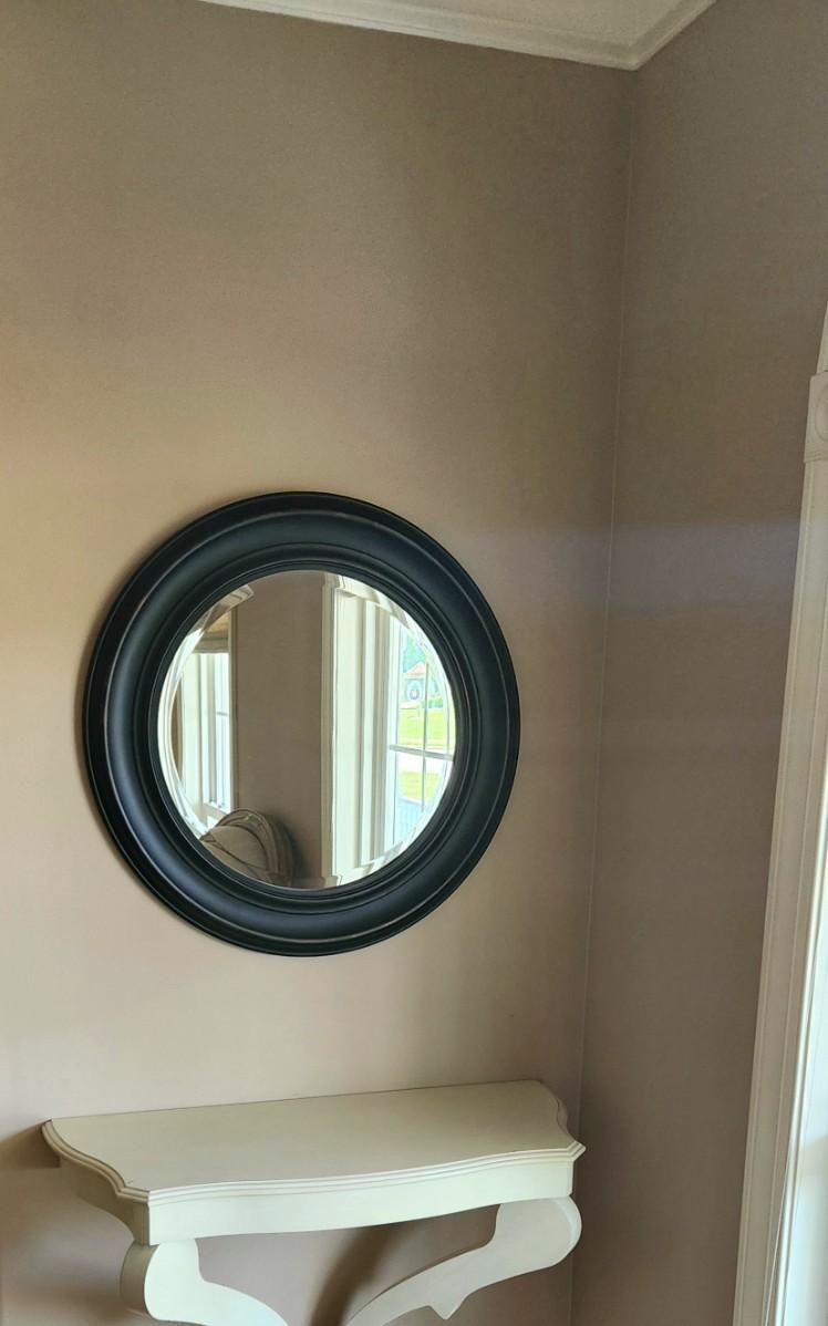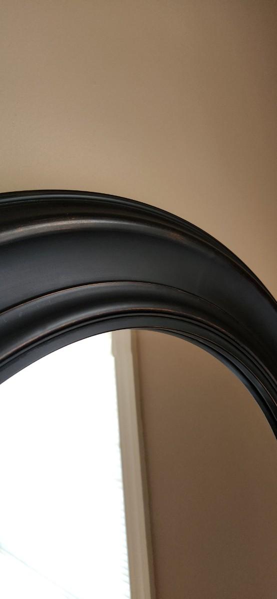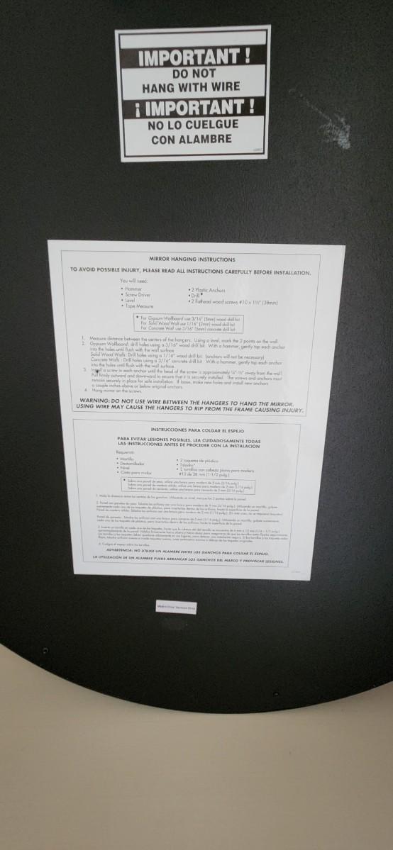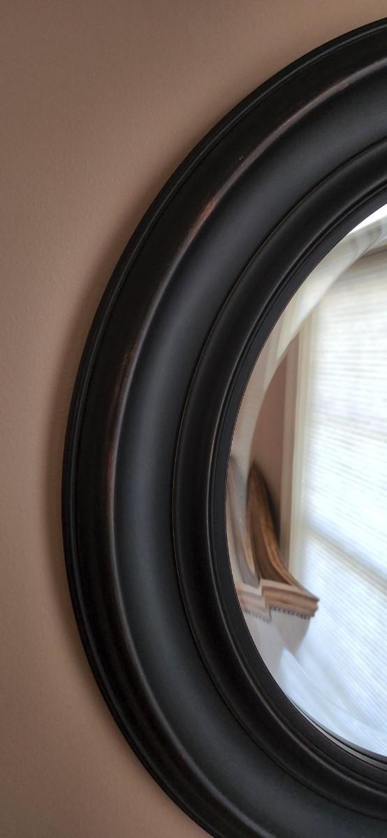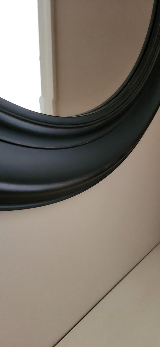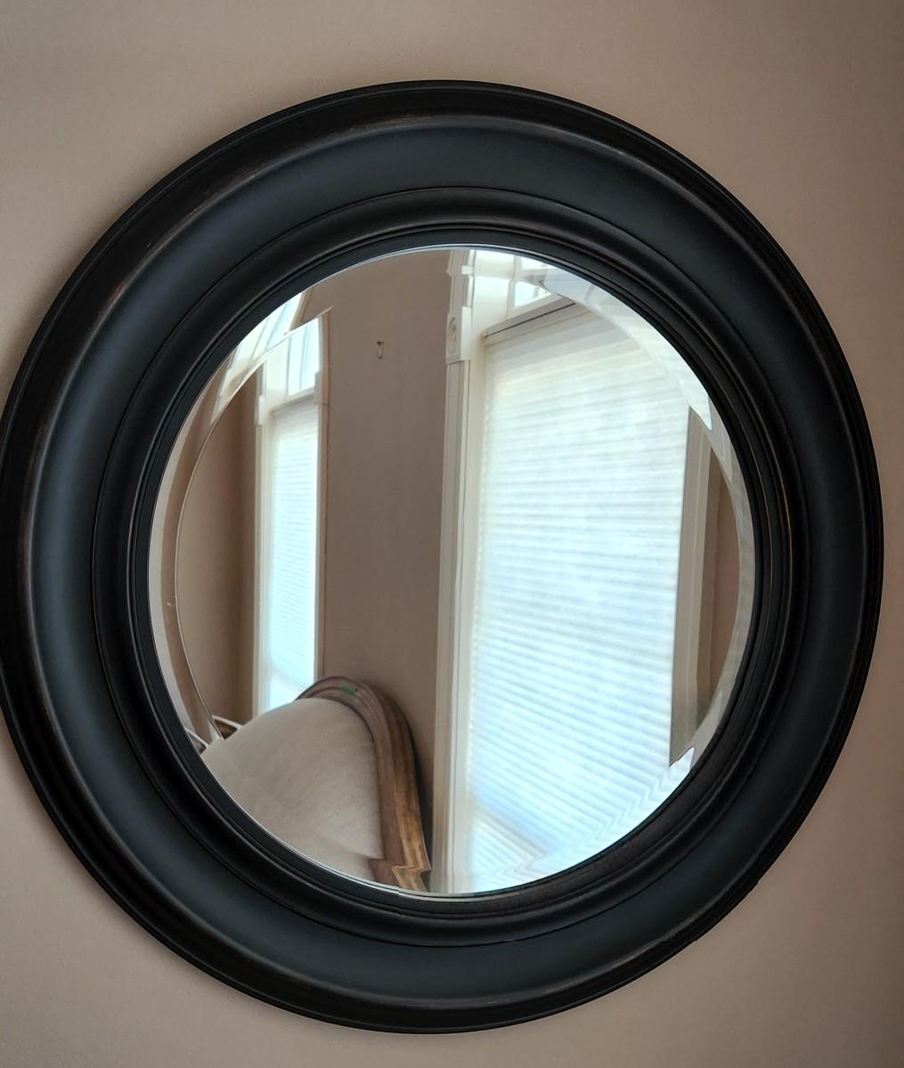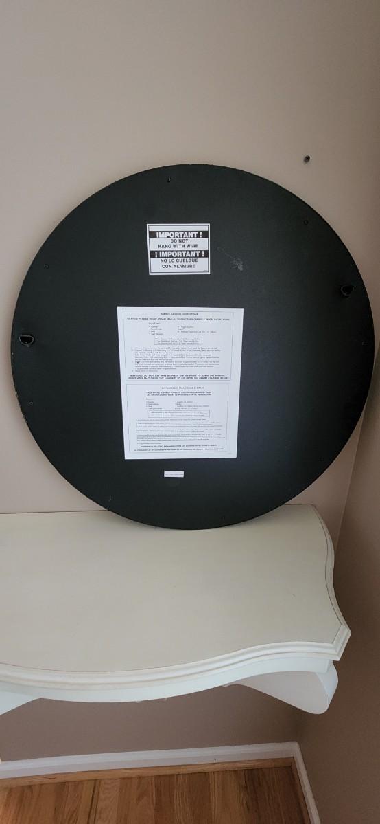 This is a 26" black plastic framed round mirror with two hooks on the back for double security. Please see all pictures as they are the best representation of the items. The pictures show condition, measurements if taken, and what is included in the lot. Due to the large amount that we photograph and the time frame, we are not always able to take measurements. All items unless noted, are pre-owned and have been used. If you purchased furniture, you must bring help. We do not allow one person to carry large furniture out on their own. Bring help, tools and a truck for the safety of our client’s homes, and your personal safety. Any damages that result to the property including walls, and floors due to moving of the furniture will be charged to the buyer. Company policy. Thank you.