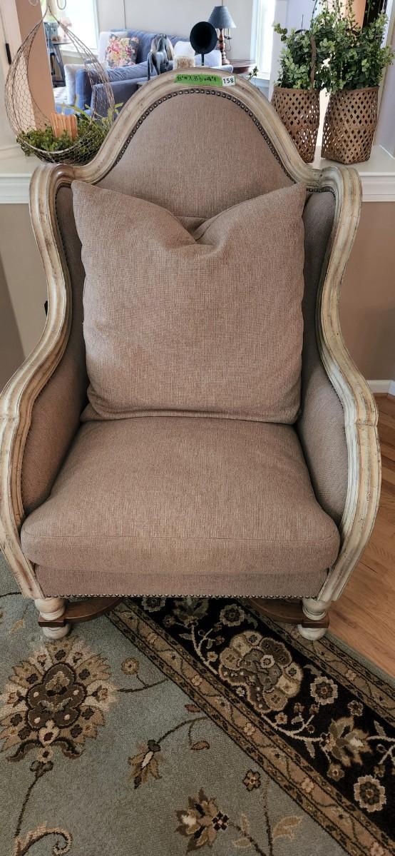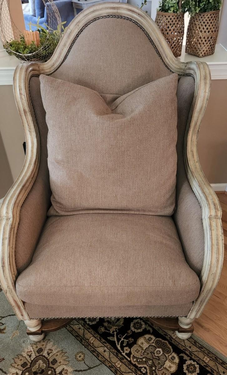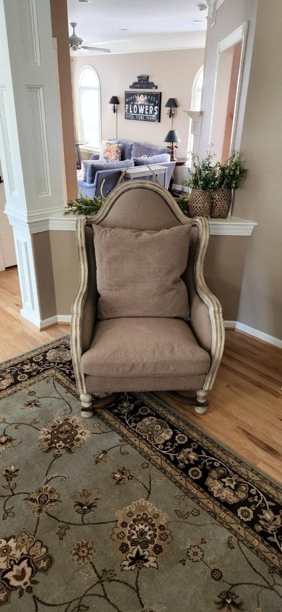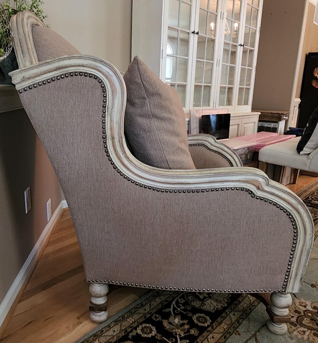This chair is so classy! It features front and back upholstery, nail head trim, and reversible cushions with removable covers. This is a solid piece of furniture! 33.5"W x 35" D x 46.5" H. Please see all pictures as they are the best representation of the items. The pictures show condition, measurements if taken, and what is included in the lot. Due to the large amount that we photograph and the time frame, we are not always able to take measurements. All items unless noted, are pre-owned and have been used. If you purchased furniture, you must bring help. We do not allow one person to carry large furniture out on their own. Bring help, tools and a truck for the safety of our client’s homes, and your personal safety. Any damages that result to the property including walls, and floors due to moving of the furniture will be charged to the buyer. Company policy. Thank you.