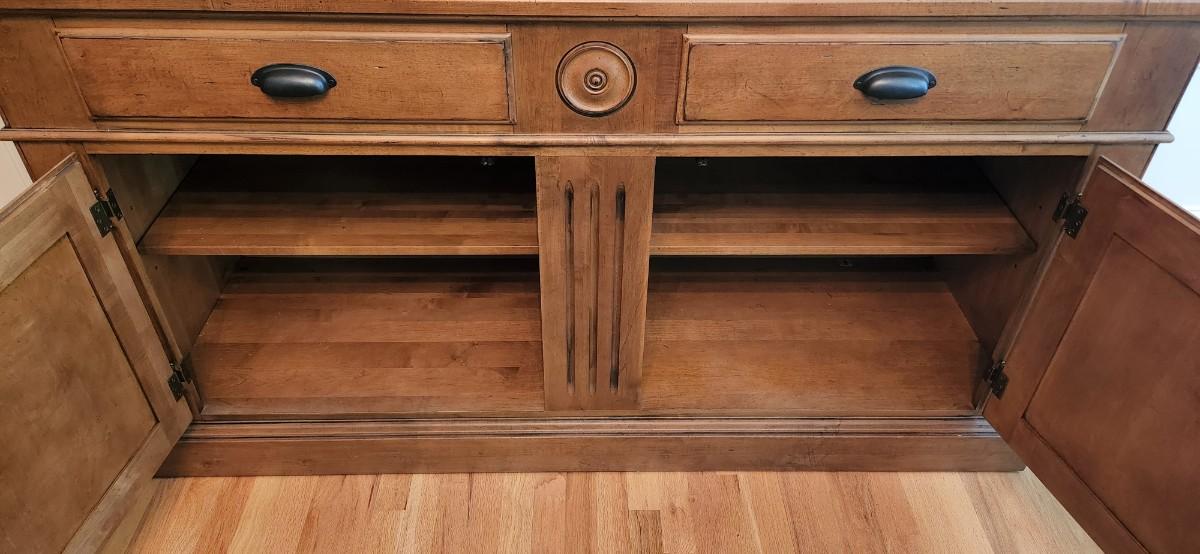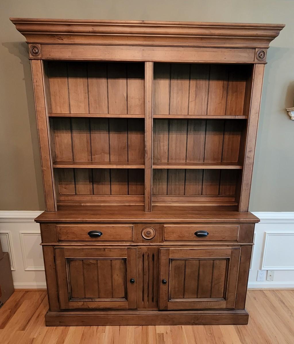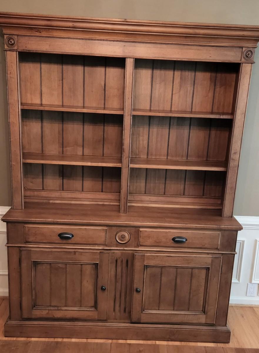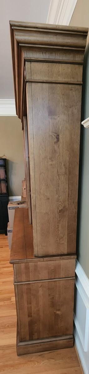 A beautiful, solid piece of furniture that's in great condition. Each shelf offer spots to display your China. The drawers are dovetailed and have felt bottoms. One drawer features a built-in silverware organizer. Top of hutch is removable for easier moving64 W x 19 D x 86 H. Please see all pictures as they are the best representation of the items. The pictures show condition, measurements if taken, and what is included in the lot. Due to the large amount that we photograph and the time frame, we are not always able to take measurements. All items unless noted, are pre-owned and have been used. If you purchased furniture, you must bring help. We do not allow one person to carry large furniture out on their own. Bring help, tools and a truck for the safety of our client’s homes, and your personal safety. Any damages that result to the property including walls, and floors due to moving of the furniture will be charged to the buyer. Company policy. Thank you.
