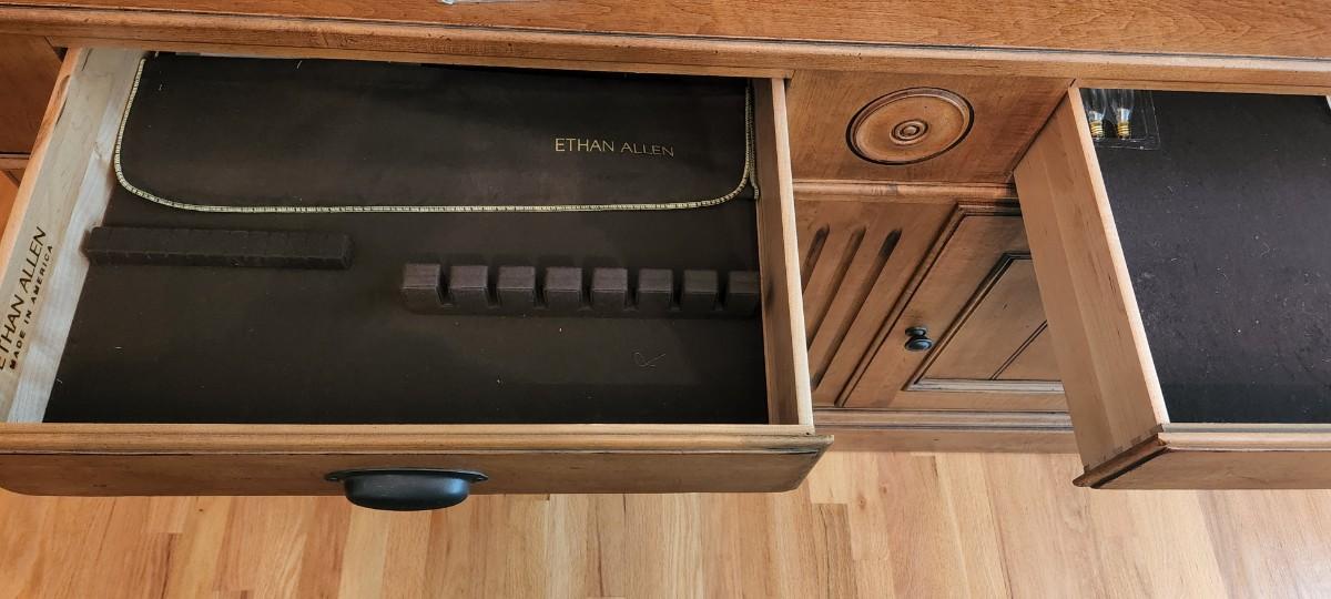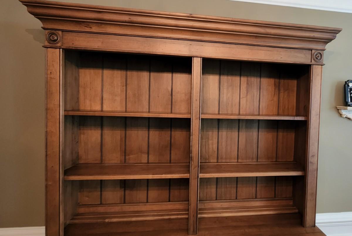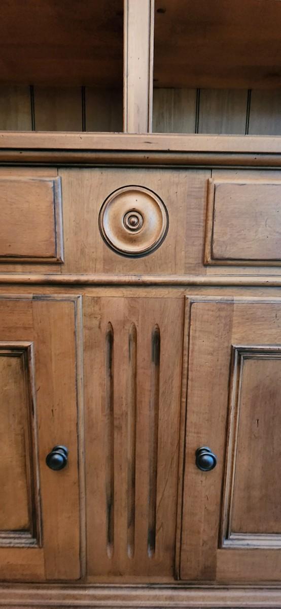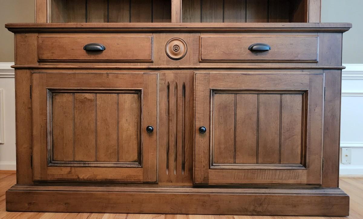 A beautiful, solid piece of furniture that's in great condition. Each shelf offer spots to display your China. The drawers are dovetailed and have felt bottoms. One drawer features a built-in silverware organizer. Top of hutch is removable for easier moving64 W x 19 D x 86 H. Please see all pictures as they are the best representation of the items. The pictures show condition, measurements if taken, and what is included in the lot. Due to the large amount that we photograph and the time frame, we are not always able to take measurements. All items unless noted, are pre-owned and have been used. If you purchased furniture, you must bring help. We do not allow one person to carry large furniture out on their own. Bring help, tools and a truck for the safety of our client’s homes, and your personal safety. Any damages that result to the property including walls, and floors due to moving of the furniture will be charged to the buyer. Company policy. Thank you.