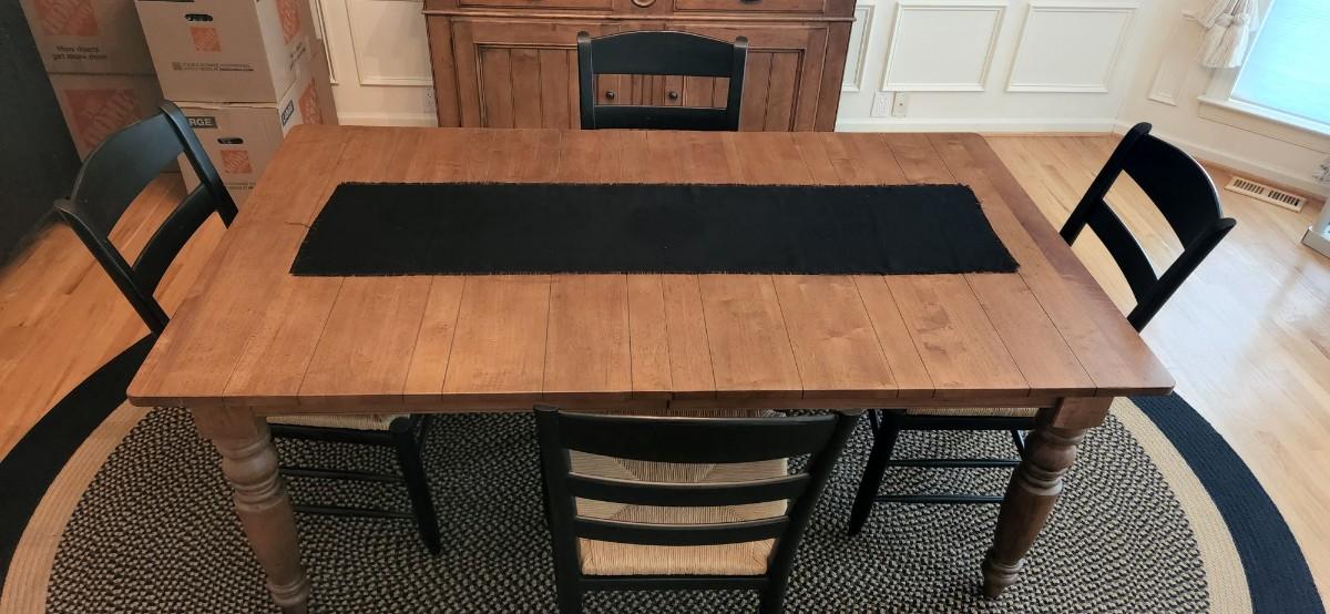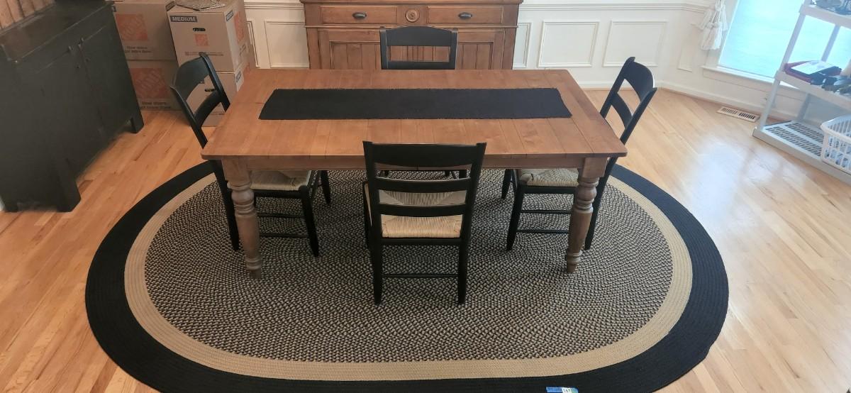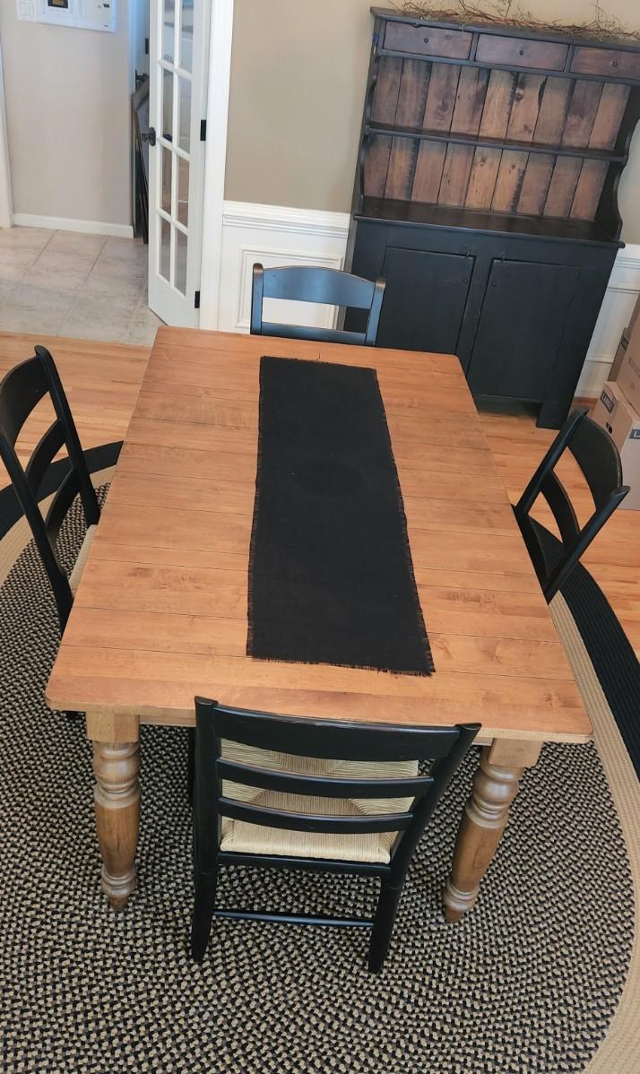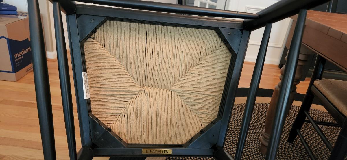 You are bidding on a stunning, timeless Ethan Allen dining set.. Each chair has a rush seats and have the Ethan Allen plaque on the bottom. The leg are attached with four bolts for maximum stability. The table has an option to add a leaf which would easily slides extends and locks. Table measurements: 72W x 41D x 30H. Please see all pictures as they are the best representation of the items. The pictures show condition, measurements if taken, and what is included in the lot. Due to the large amount that we photograph and the time frame, we are not always able to take measurements. All items unless noted, are pre-owned and have been used. If you purchased furniture, you must bring help. We do not allow one person to carry large furniture out on their own. Bring help, tools and a truck for the safety of our client’s homes, and your personal safety. Any damages that result to the property including walls, and floors due to moving of the furniture will be charged to the buyer. Company policy. Thank you.
