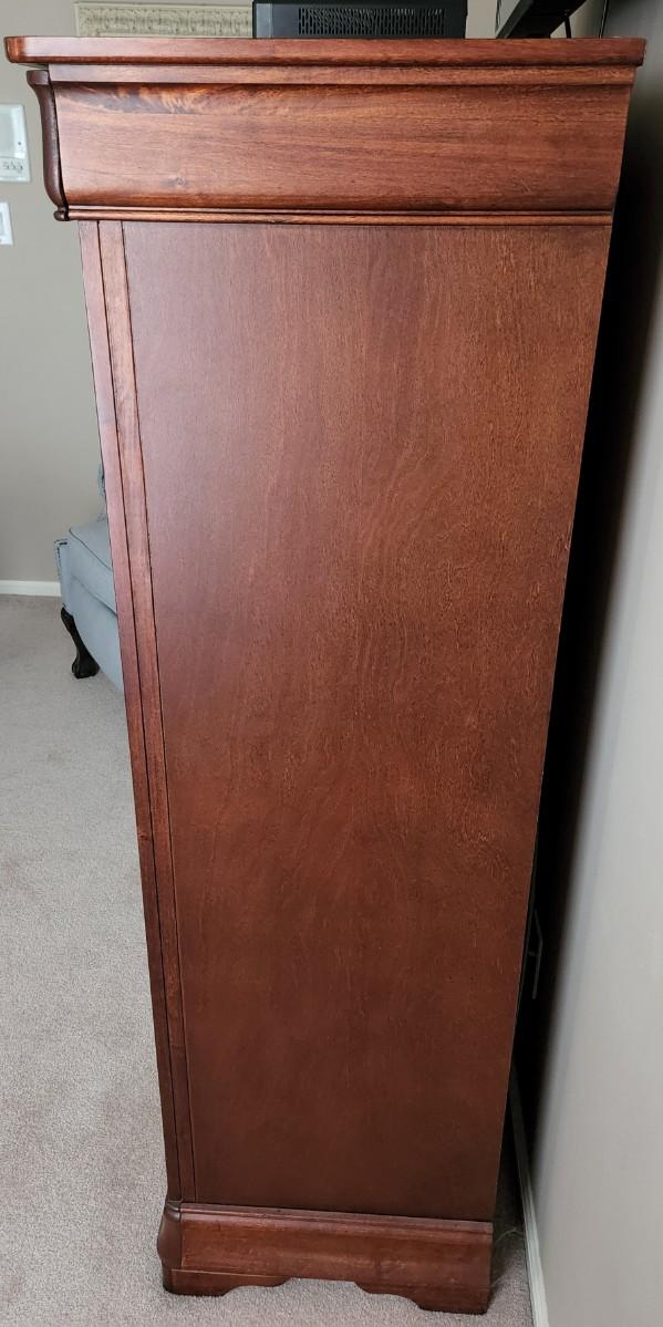 It measures: 41W x 19.5D x 61H. Bring help when picking the item up. It is on a top floor with a spiral staircase. Please see all pictures as they are the best representation of the items. The pictures show condition, measurements if taken, and what is included in the lot. Due to the large amount that we photograph and the time frame, we are not always able to take measurements. All items unless noted, are pre-owned and have been used. If you purchased furniture, you must bring help. We do not allow one person to carry large furniture out on their own. Bring help, tools and a truck for the safety of our client’s homes, and your personal safety. Any damages that result to the property including walls, and floors due to moving of the furniture will be charged to the buyer. Company policy. Thank you.