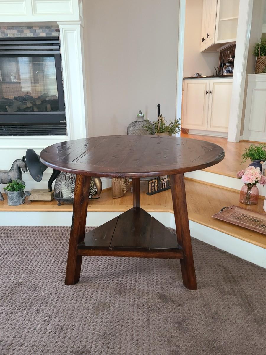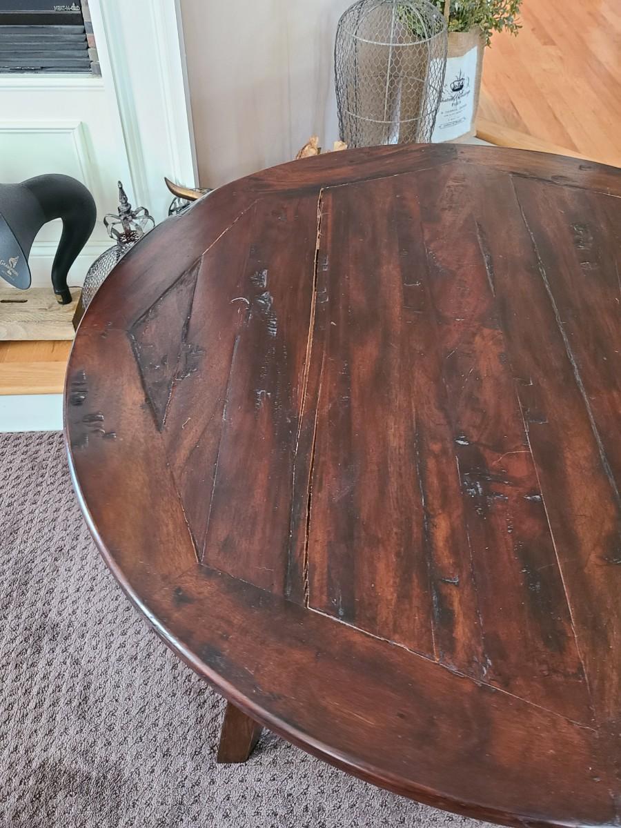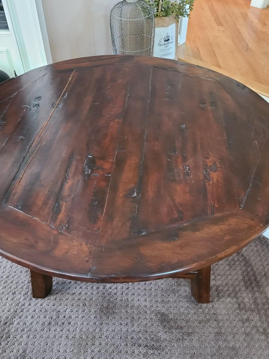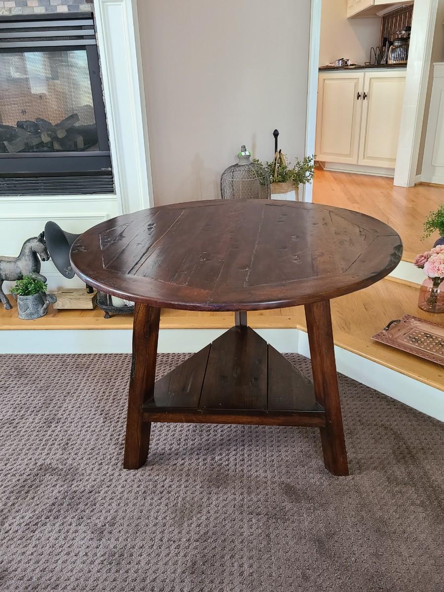 This piece is wood made in Indonesia. Can be used as small dining nook table, oversized end table, or entryway table. This does have a split in wood on top. Still functional. Please see all pictures as they are the best representation of the items. The pictures show condition, measurements if taken, and what is included in the lot. Due to the large amount that we photograph and the time frame, we are not always able to take measurements. All items unless noted, are pre-owned and have been used. If you purchased furniture, you must bring help. We do not allow one person to carry large furniture out on their own. Bring help, tools and a truck for the safety of our client’s homes, and your personal safety. Any damages that result to the property including walls, and floors due to moving of the furniture will be charged to the buyer. Company policy. Thank you.