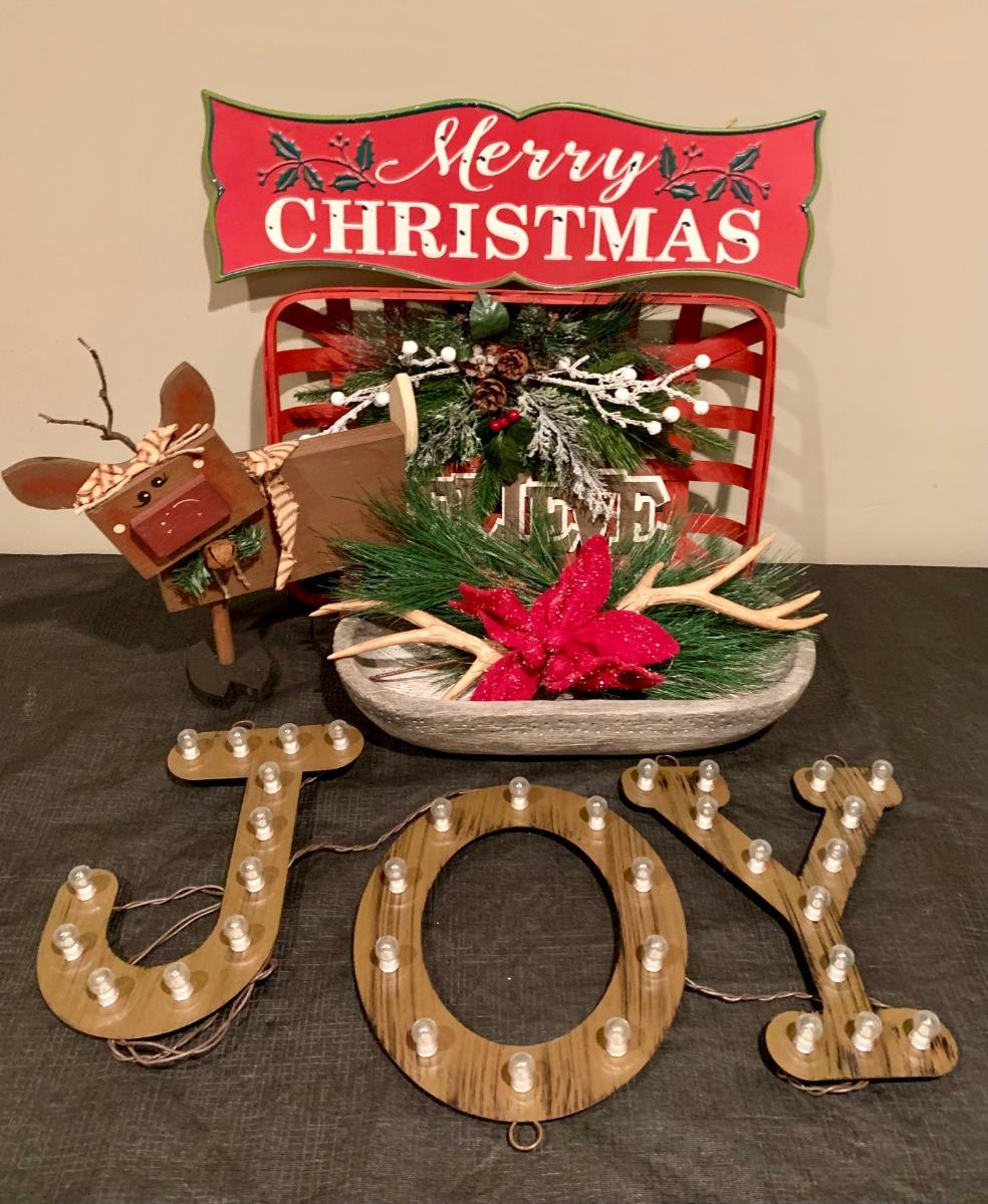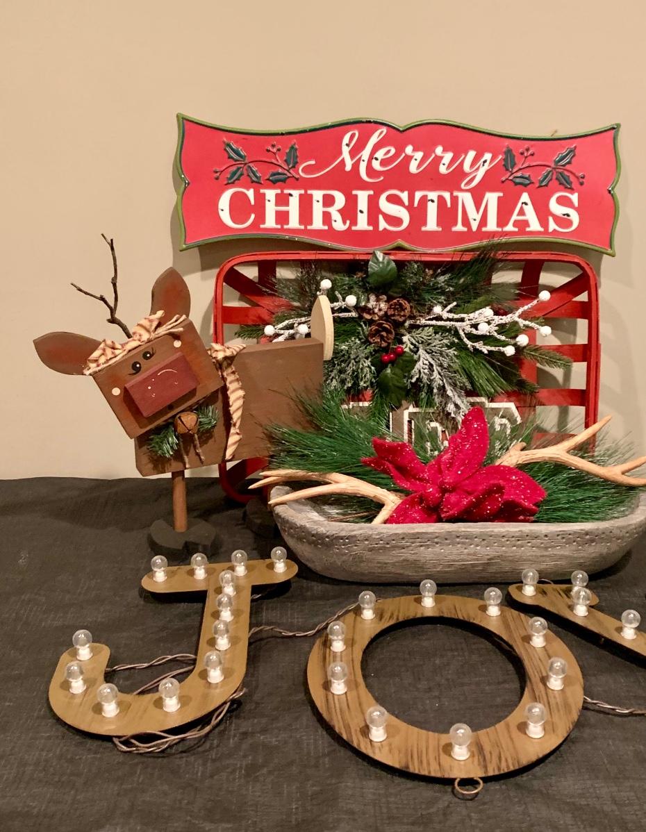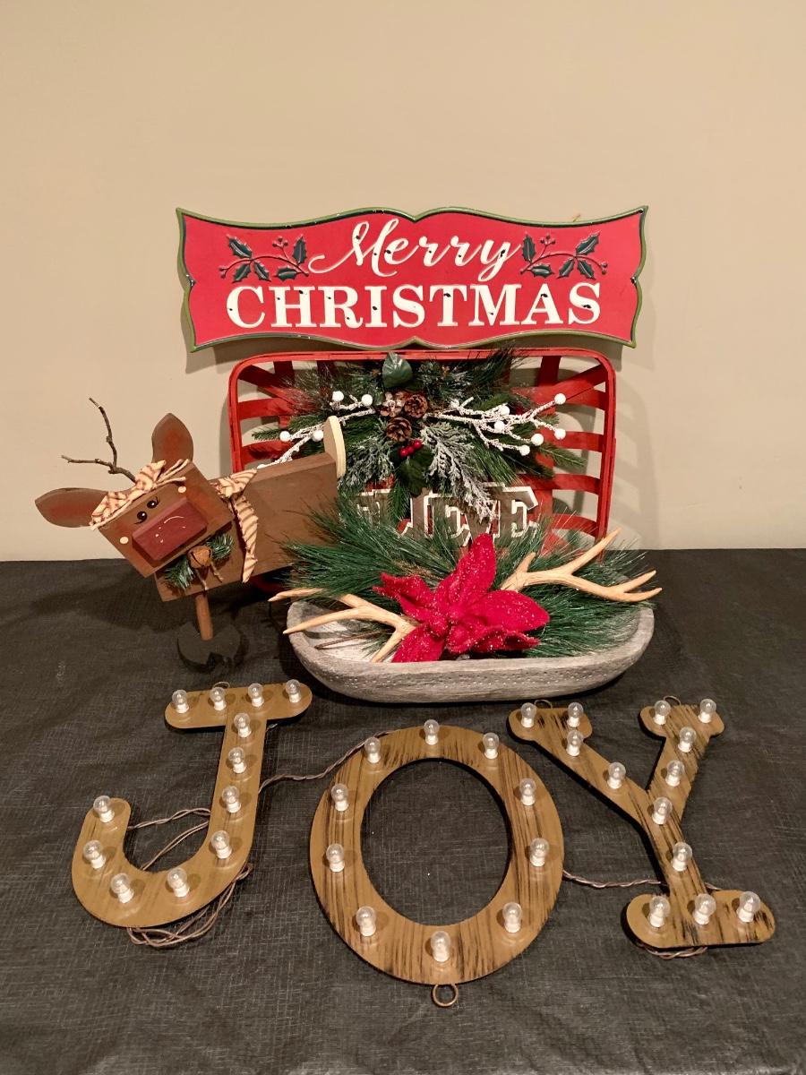 Lot R00101: Christmas Decor with Light Up J*O*Y Letters, Wooden Reindeer & More