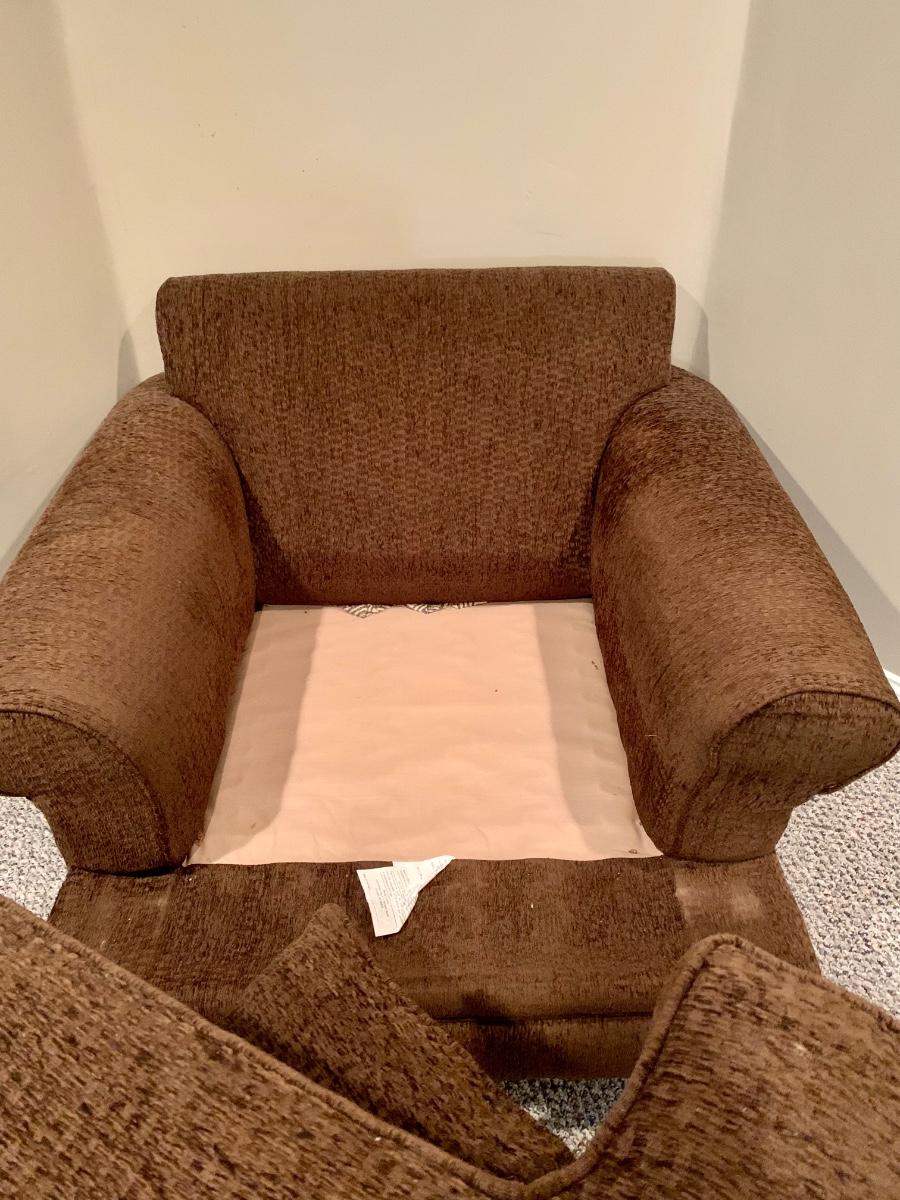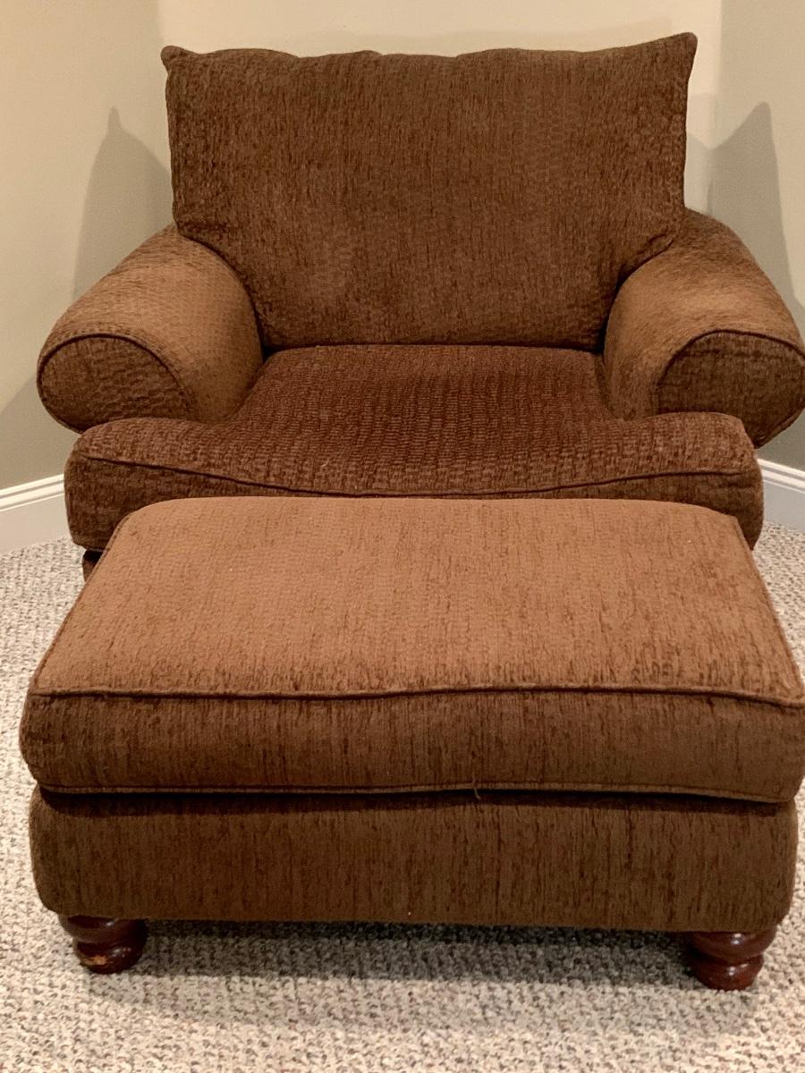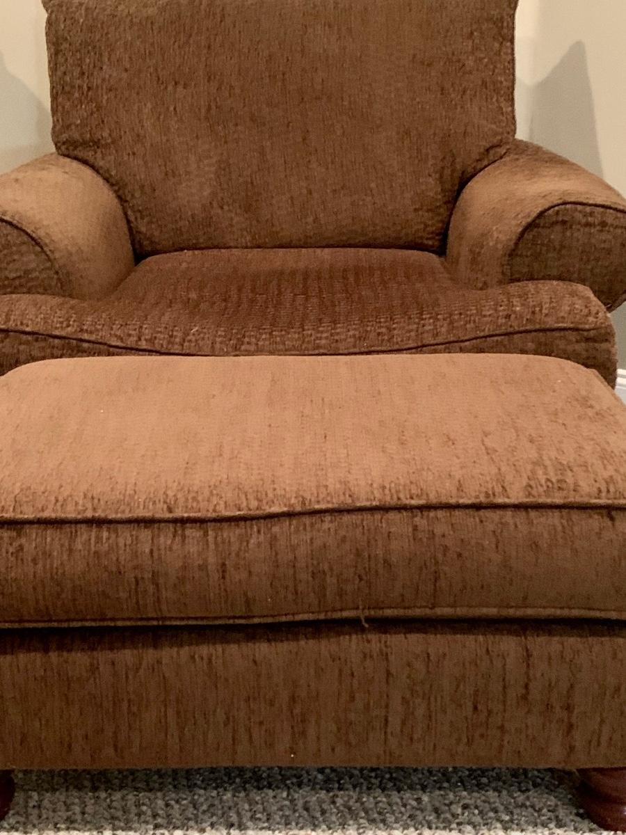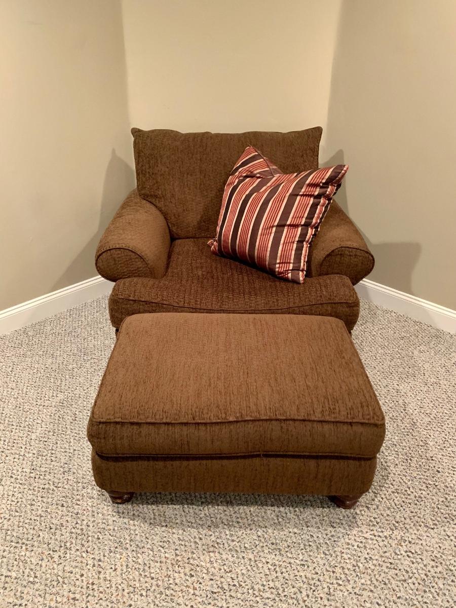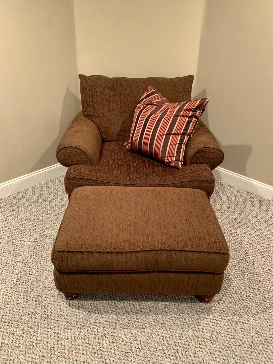 Gently used brown chair with matching ottoman & pillow