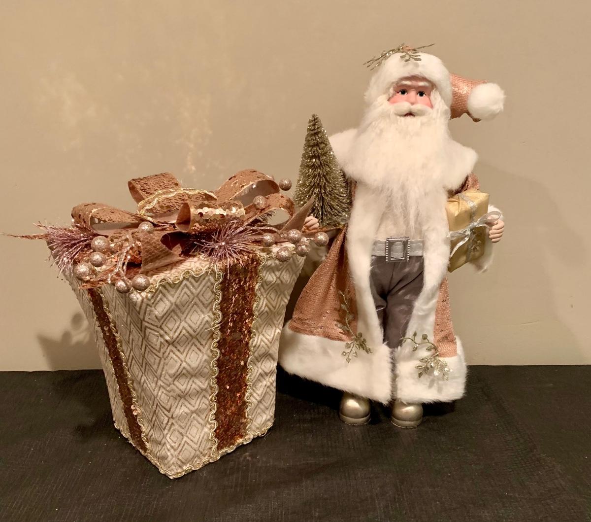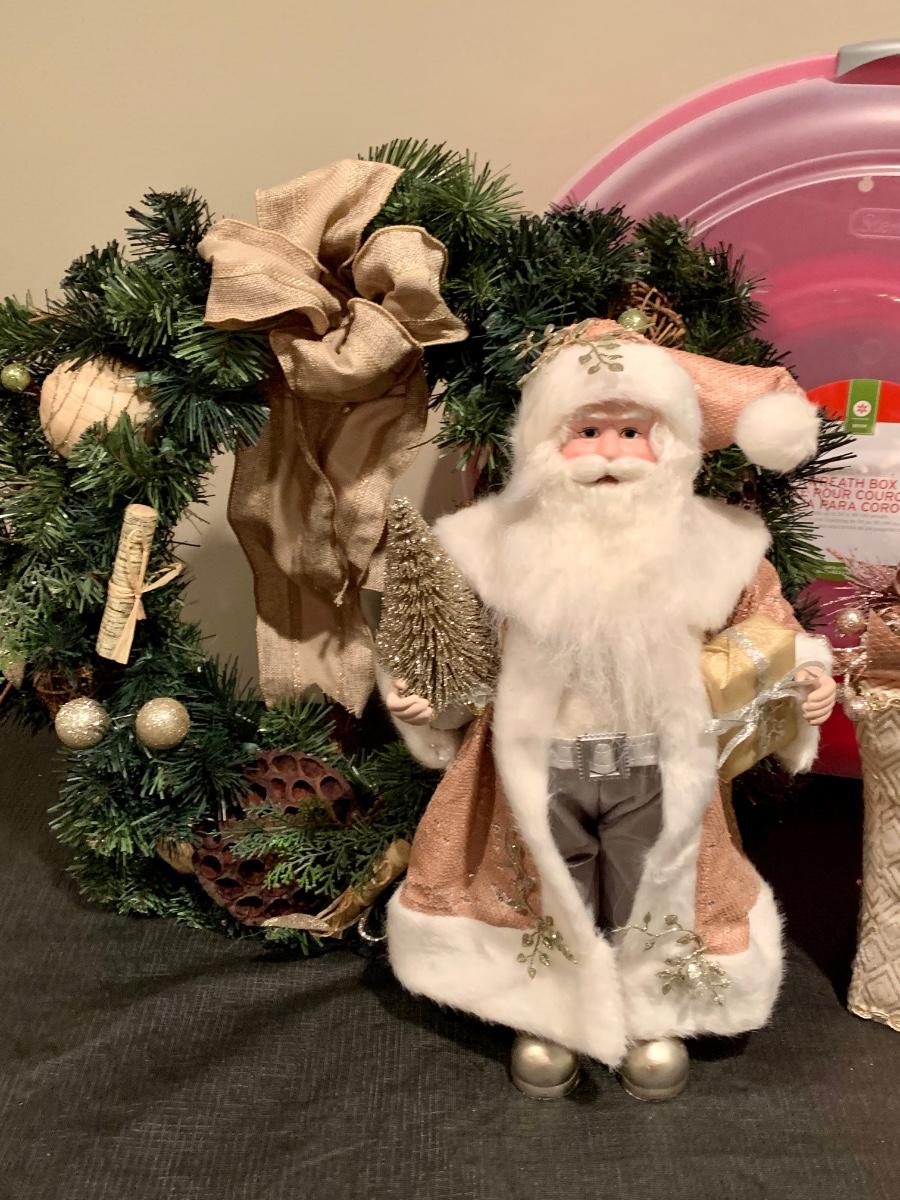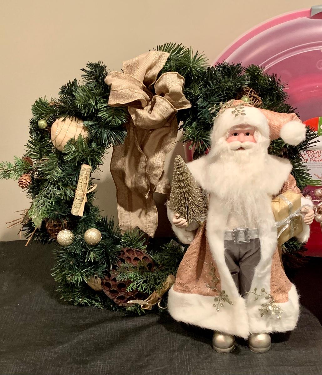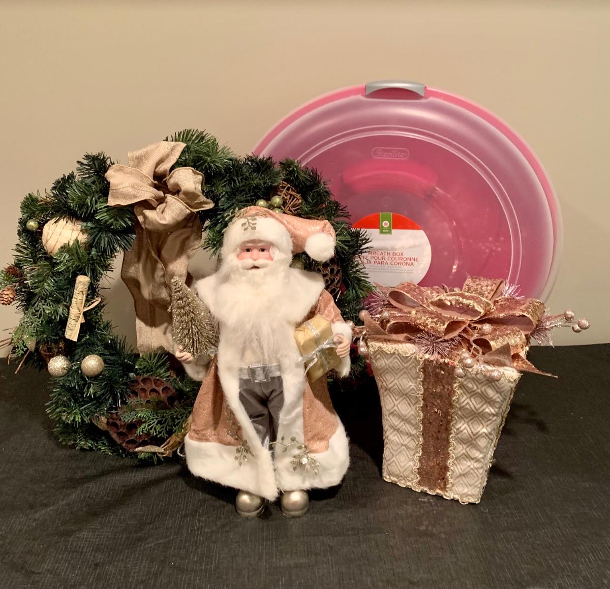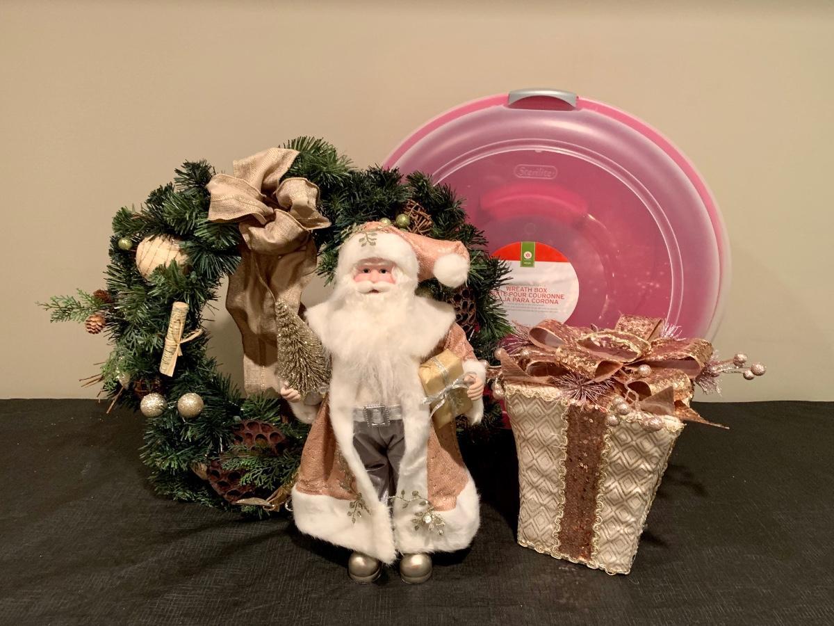 Lot R00105: Coordinating Christmas Decor: Wreath w/Storage, Santa & Faux Gift