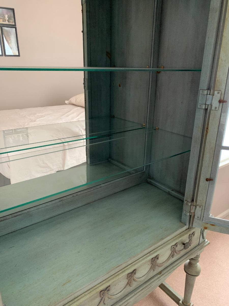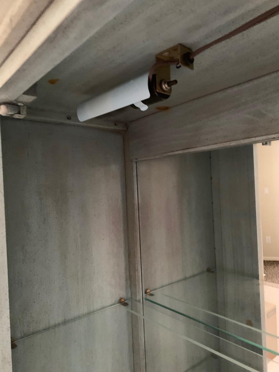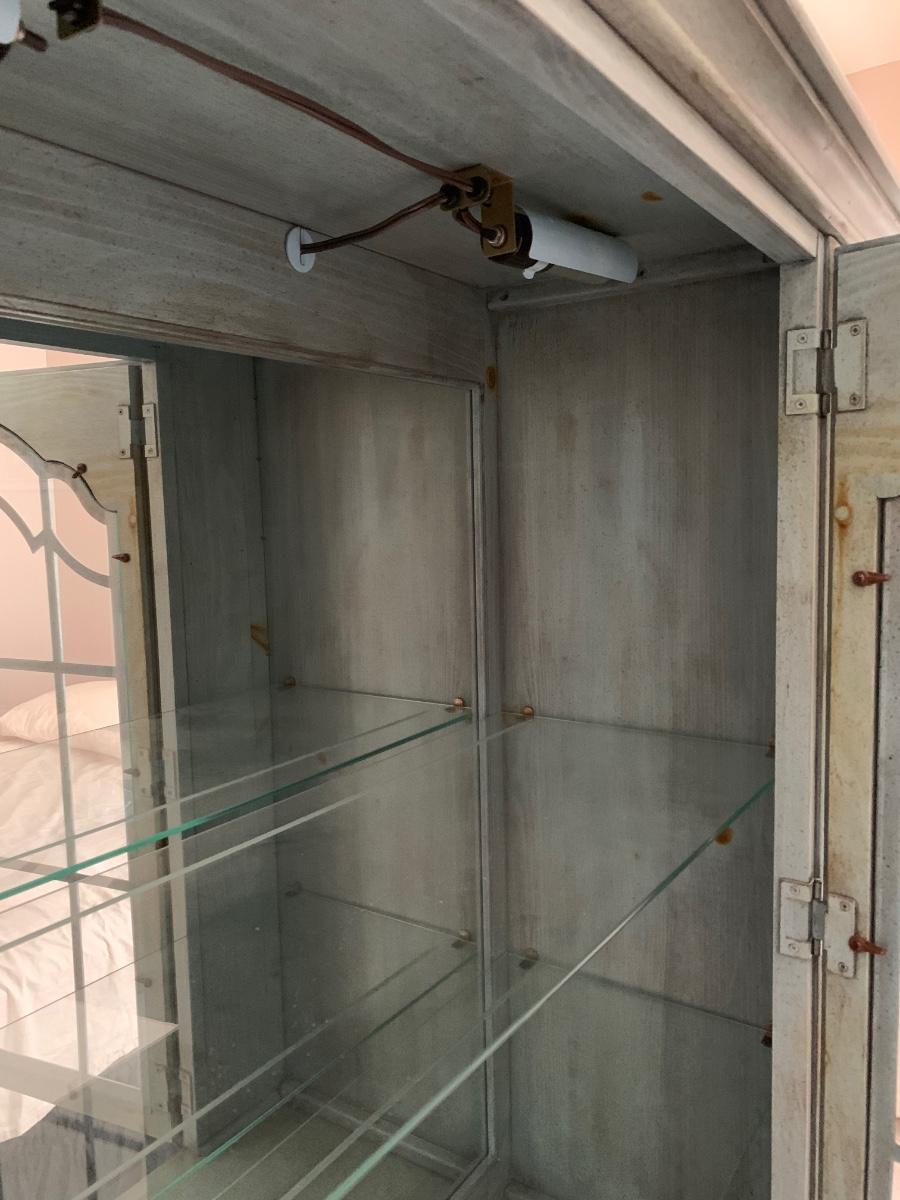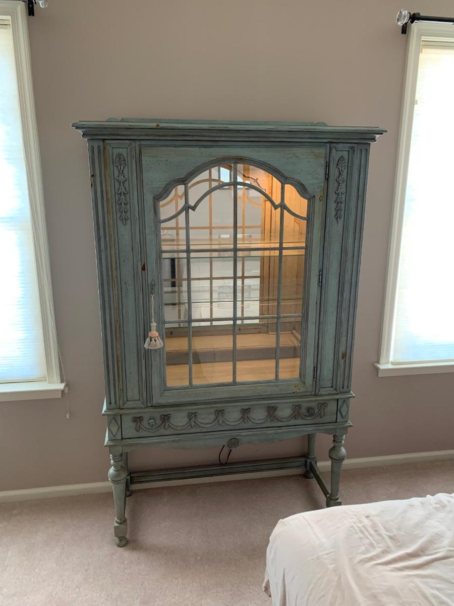 Beautiful lighted cabinet with a mirrored back and glass shelves.