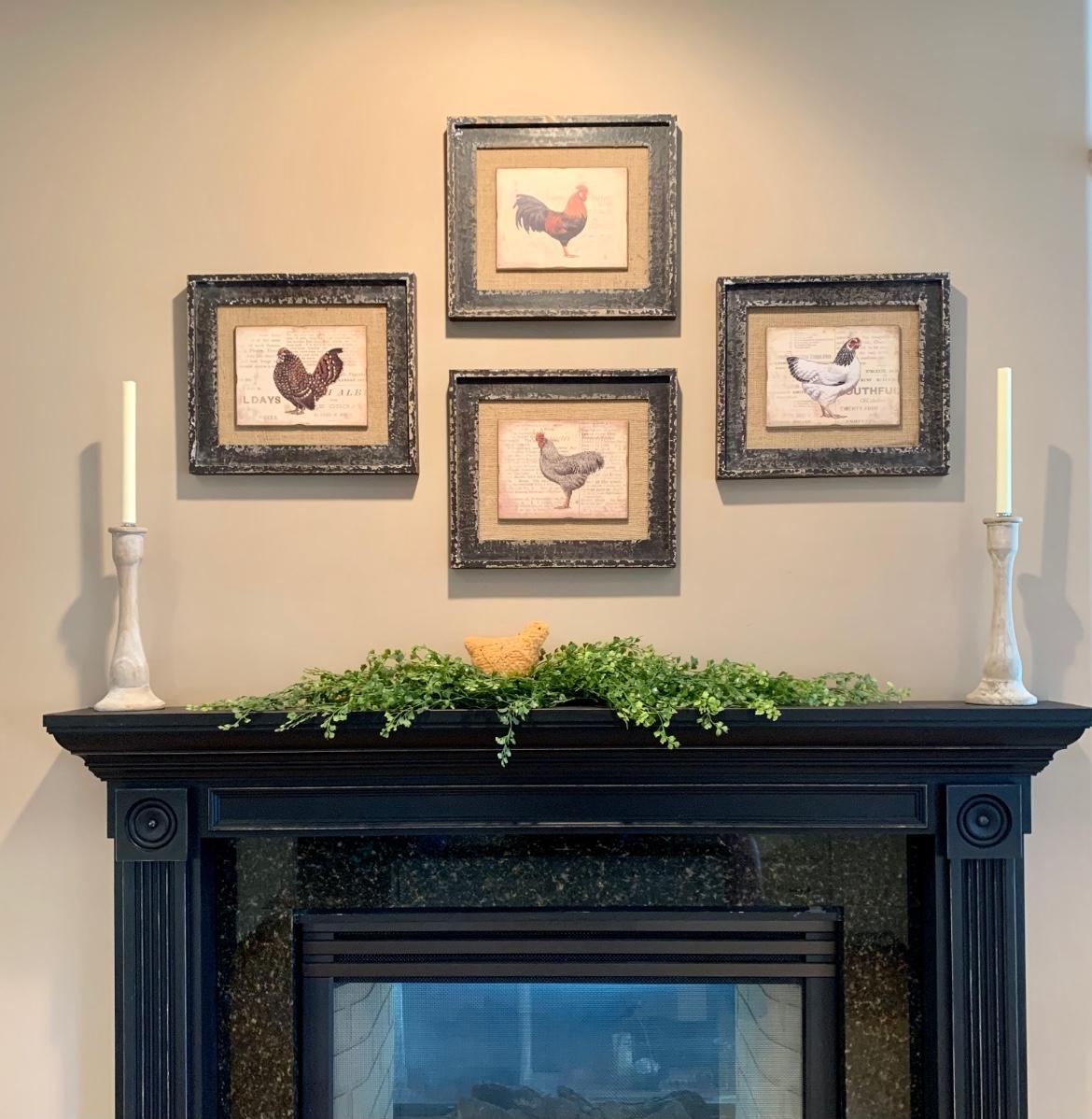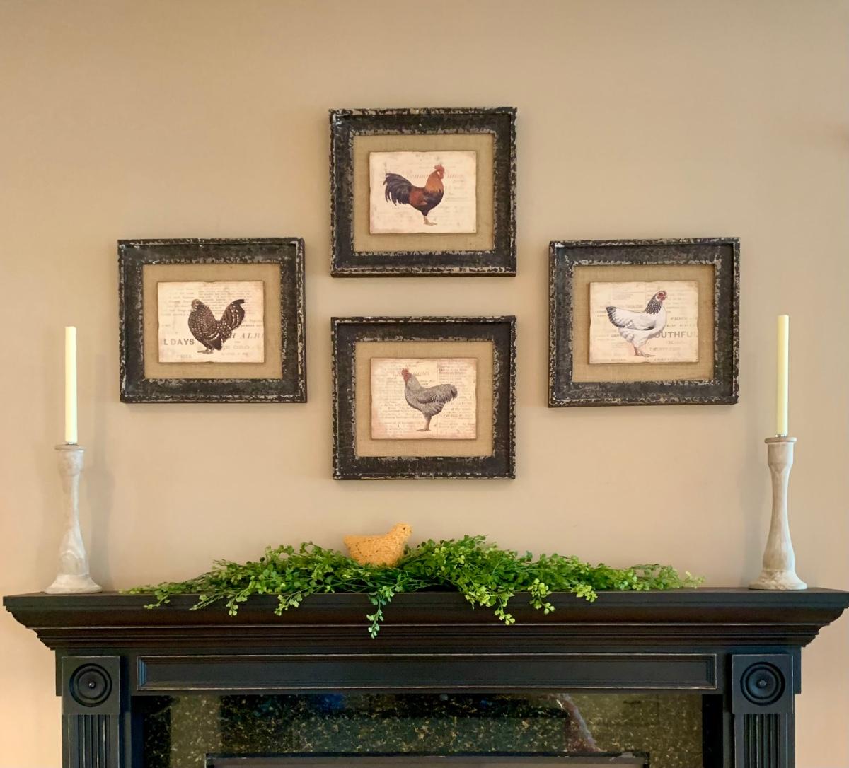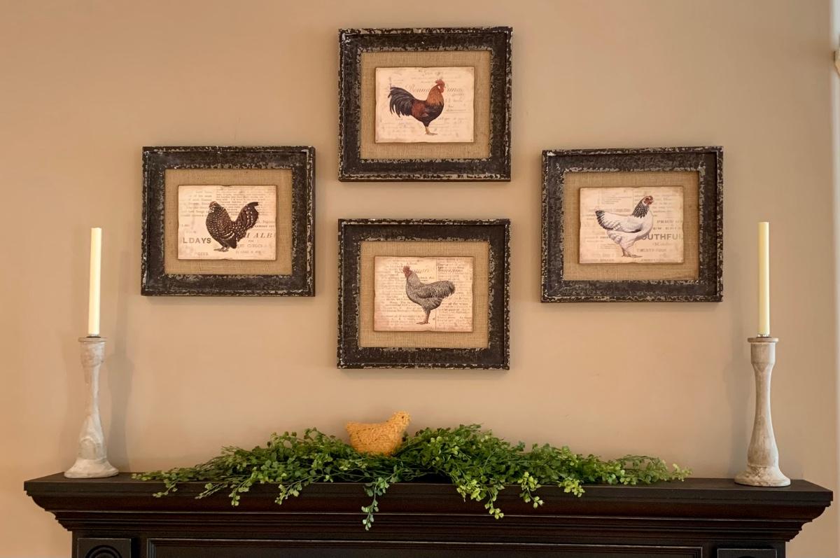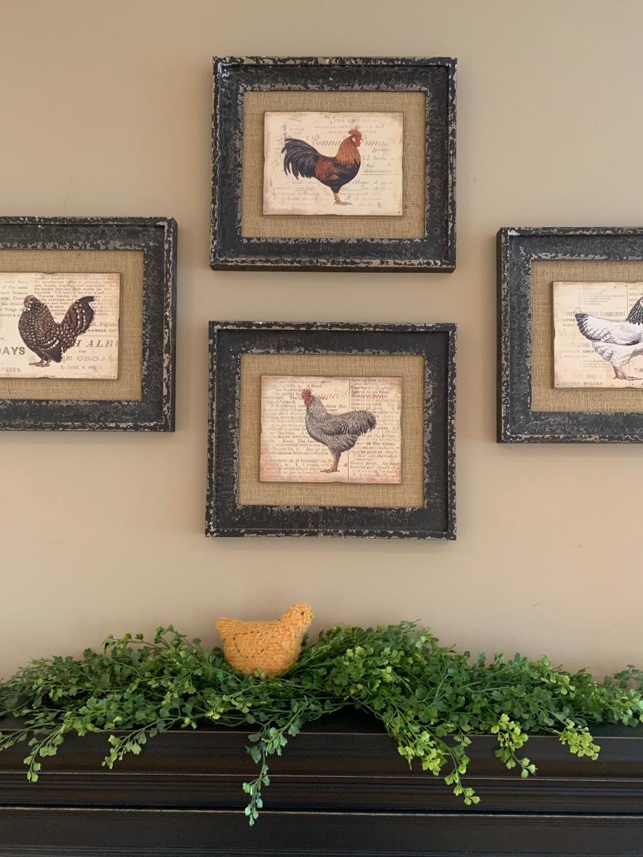 set of 4 rooster prints 15 x 13, candle sticks, faux greenery & a little yellow chck