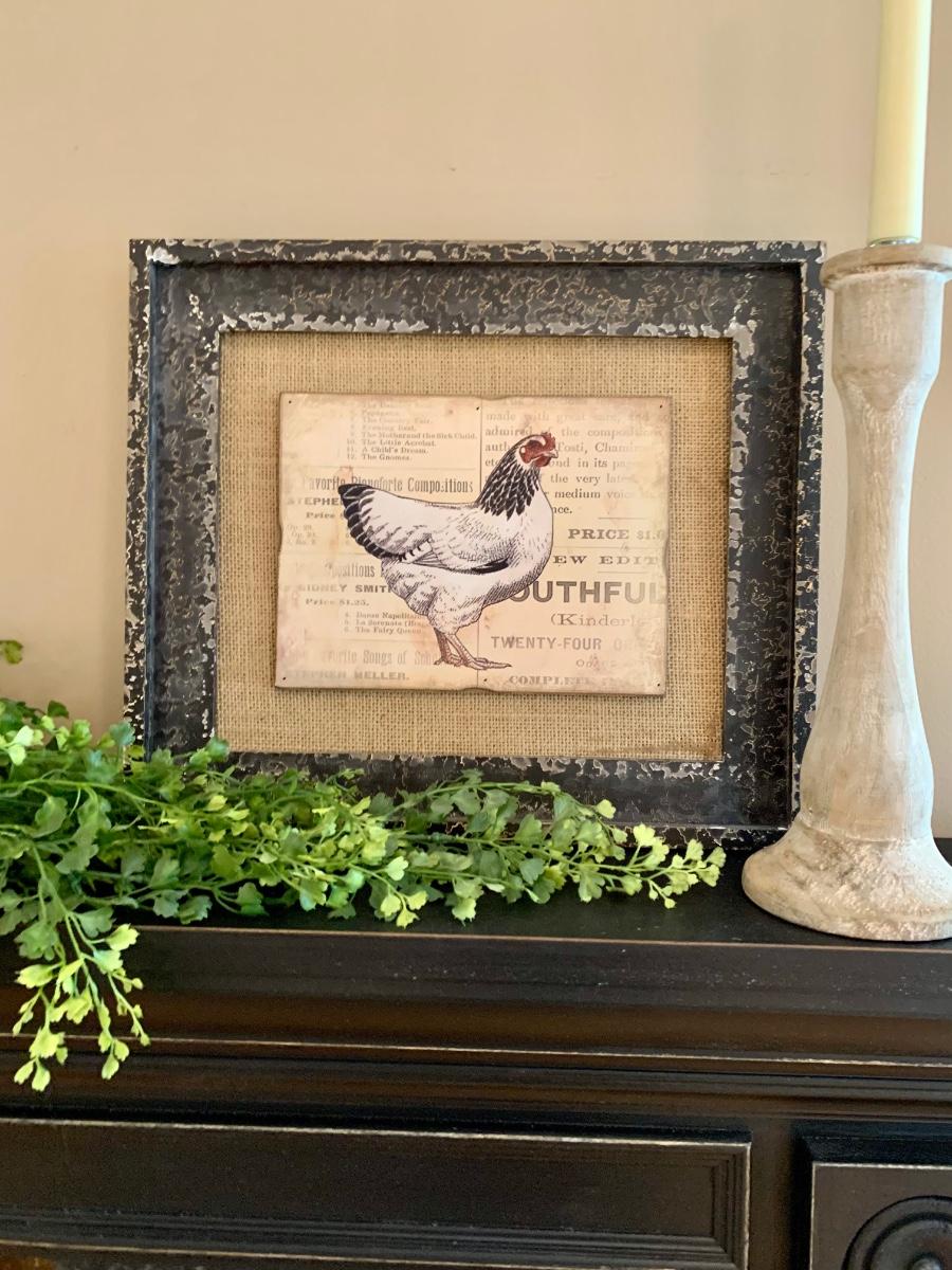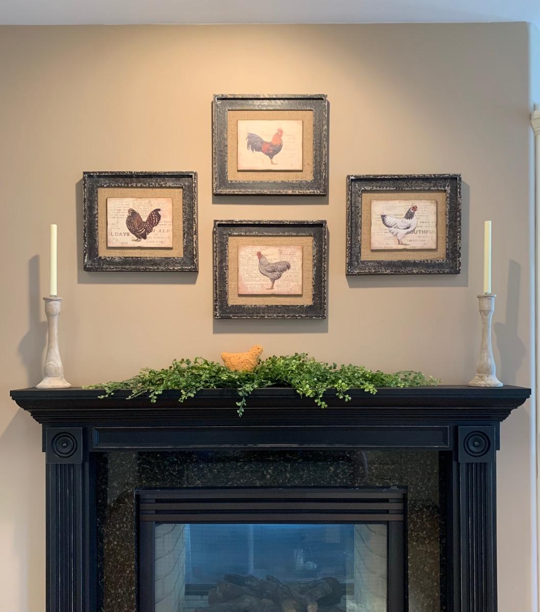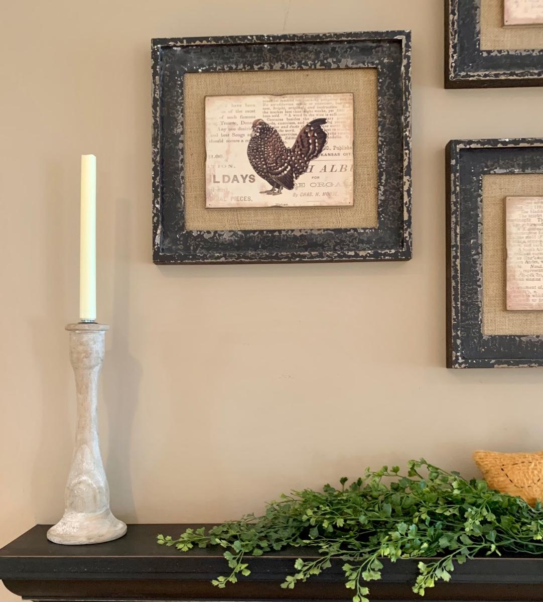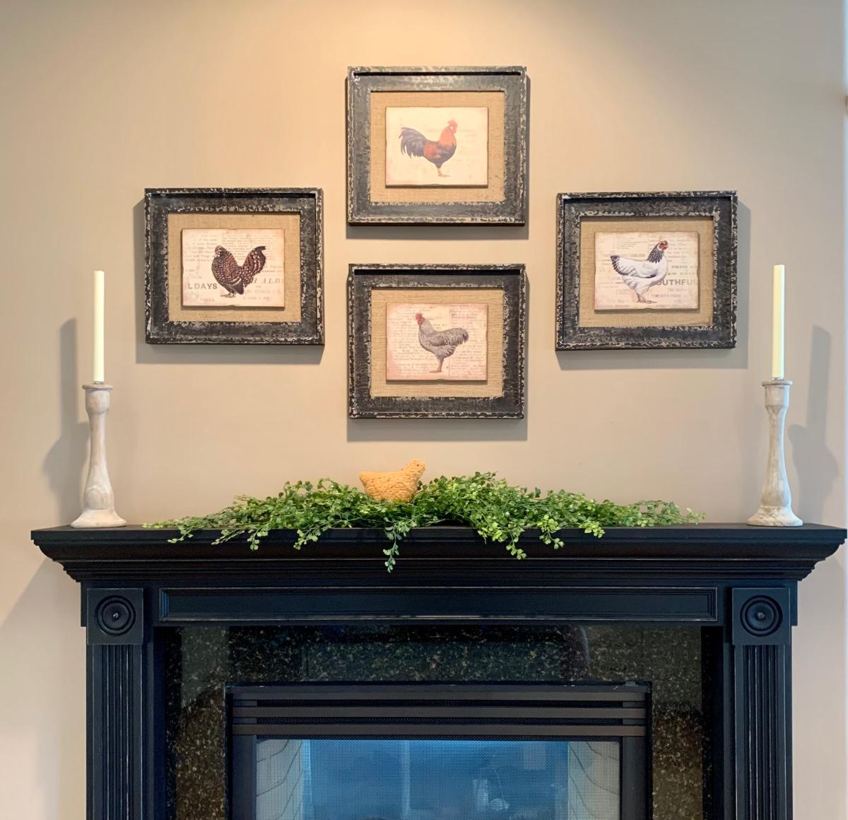 set of 4 rooster prints 15 x 13, candle sticks, faux greenery & a little yellow chck