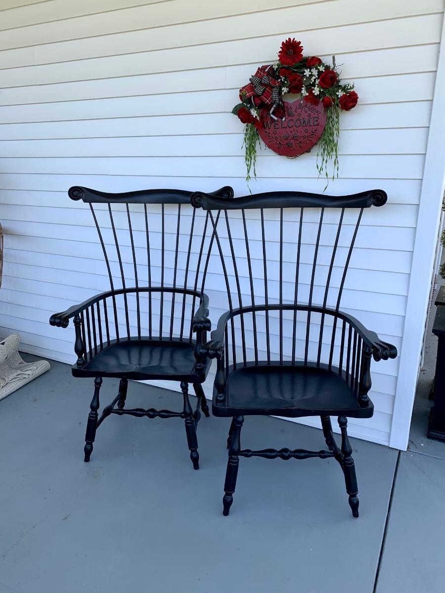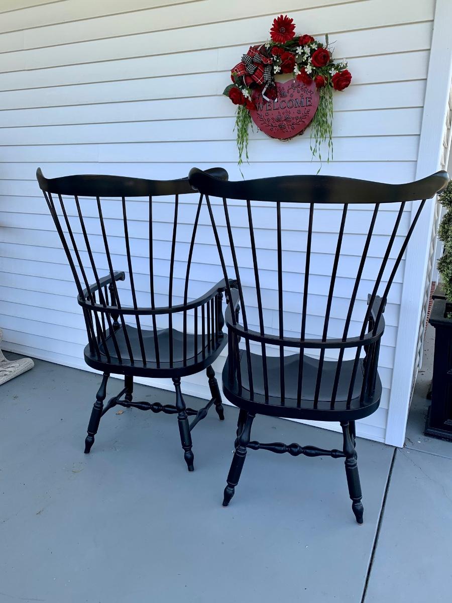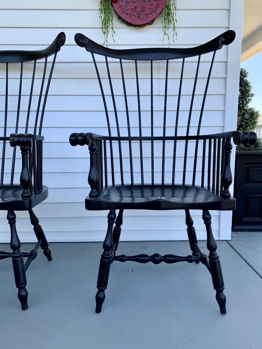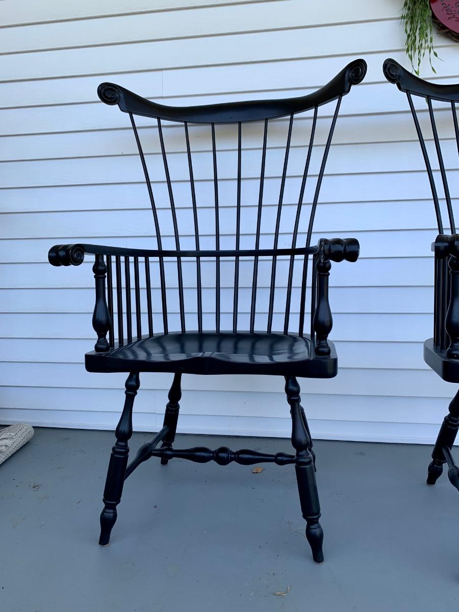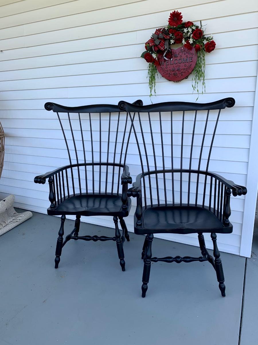 Built to last, pair of Ethan Allen arm chairs in a black finish. Not only are the sturdy but comfortable wiwth an overall height of 48inches