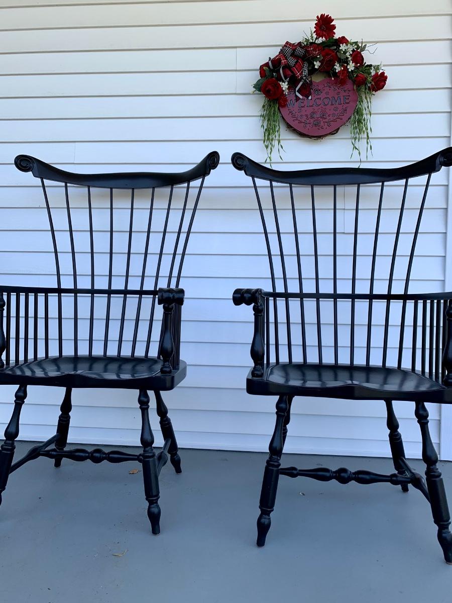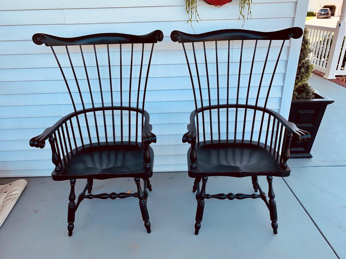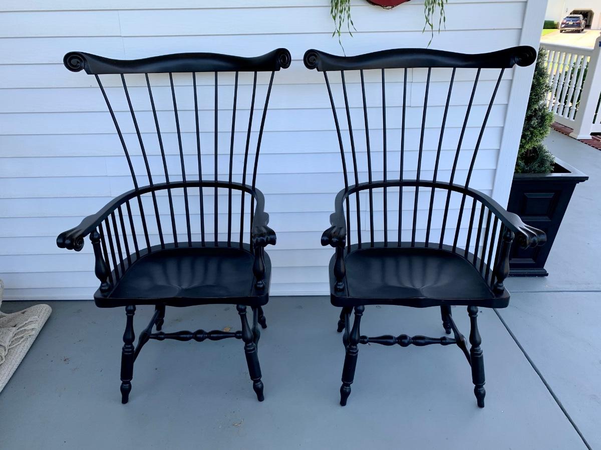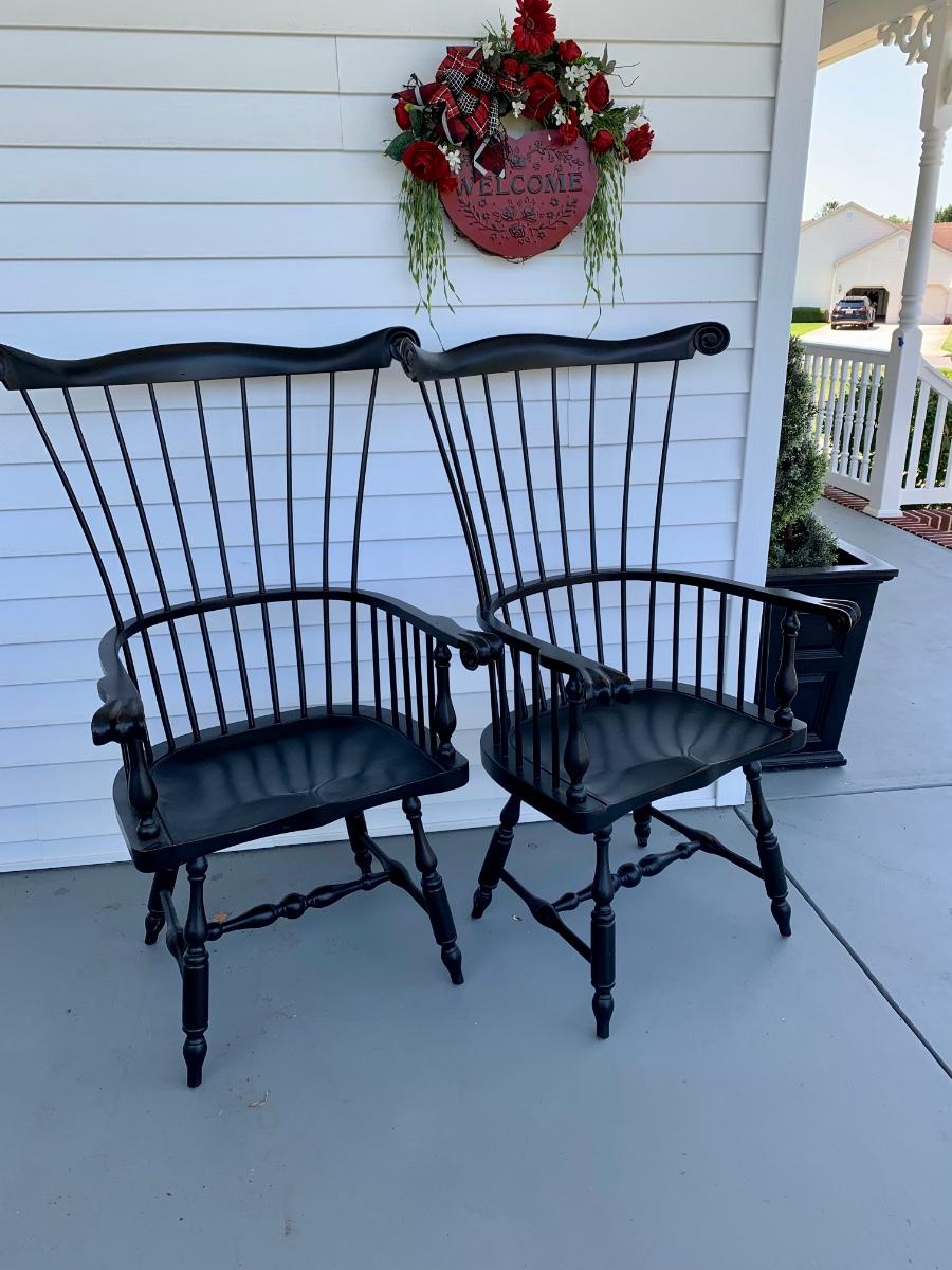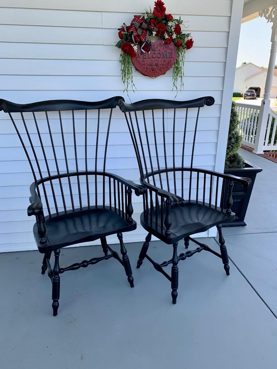 Built to last, pair of Ethan Allen arm chairs in a black finish. Not only are the sturdy but comfortable wiwth an overall height of 48inches