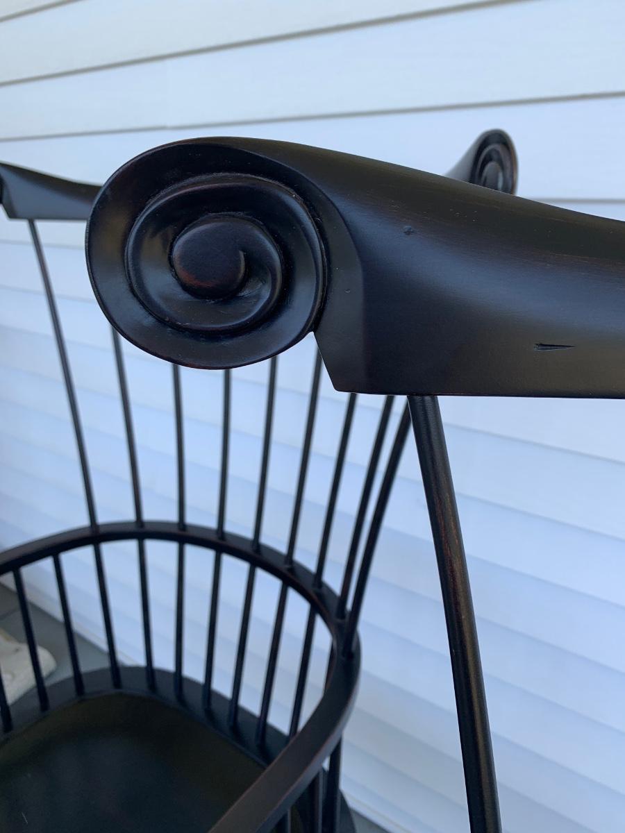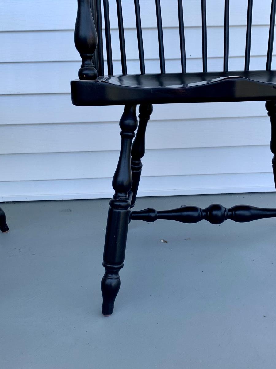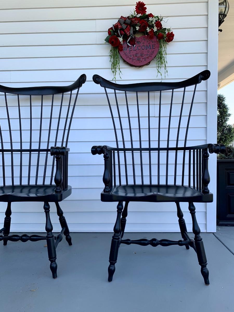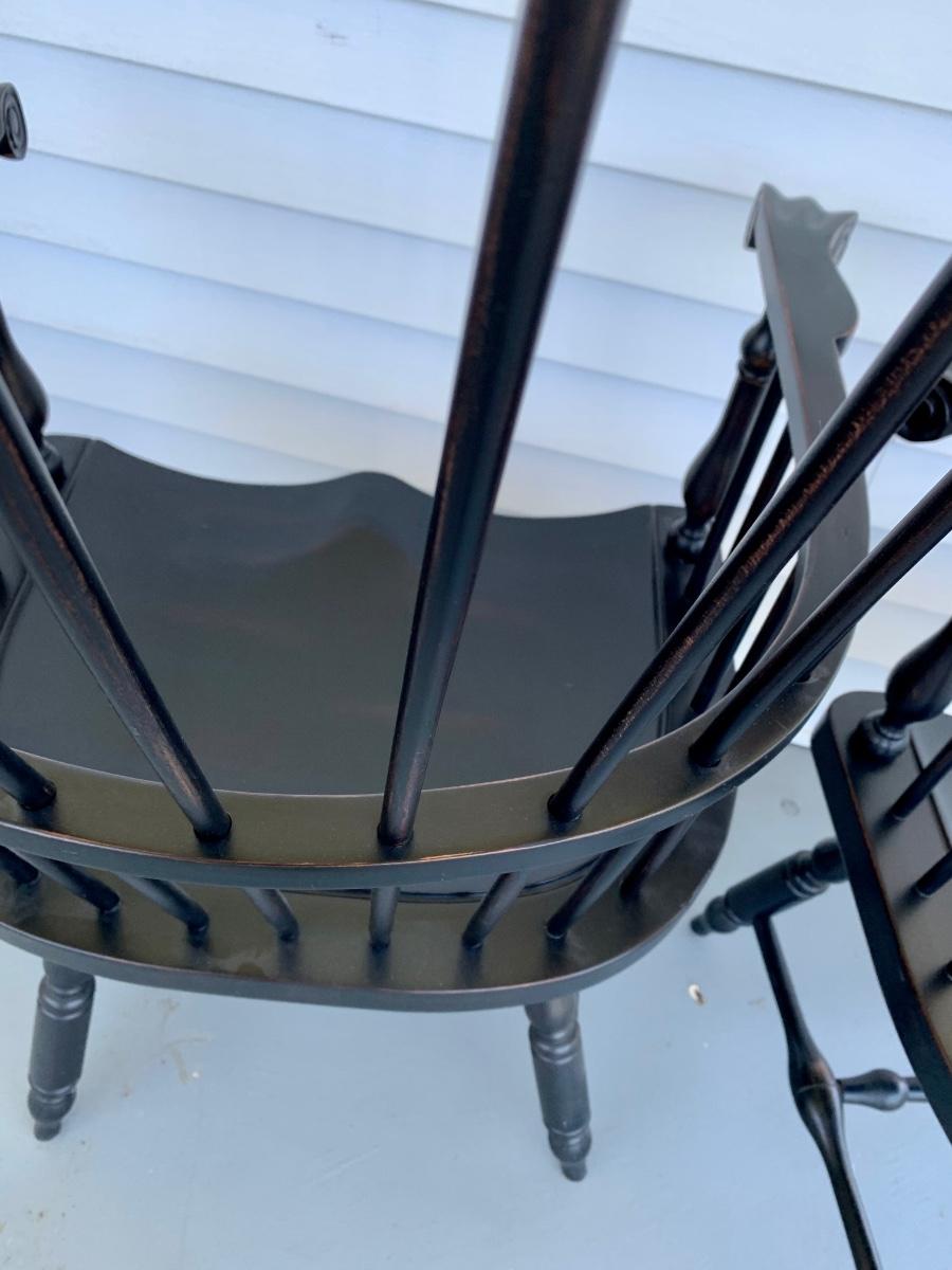 Built to last, pair of Ethan Allen arm chairs in a black finish. Not only are the sturdy but comfortable wiwth an overall height of 48inches