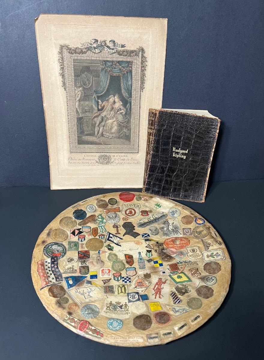 LOT 11: Vintage Decor - Handcrafted Advertising Labels Decoupaged Disc, Rudyard Kipling Book & Victorian Print