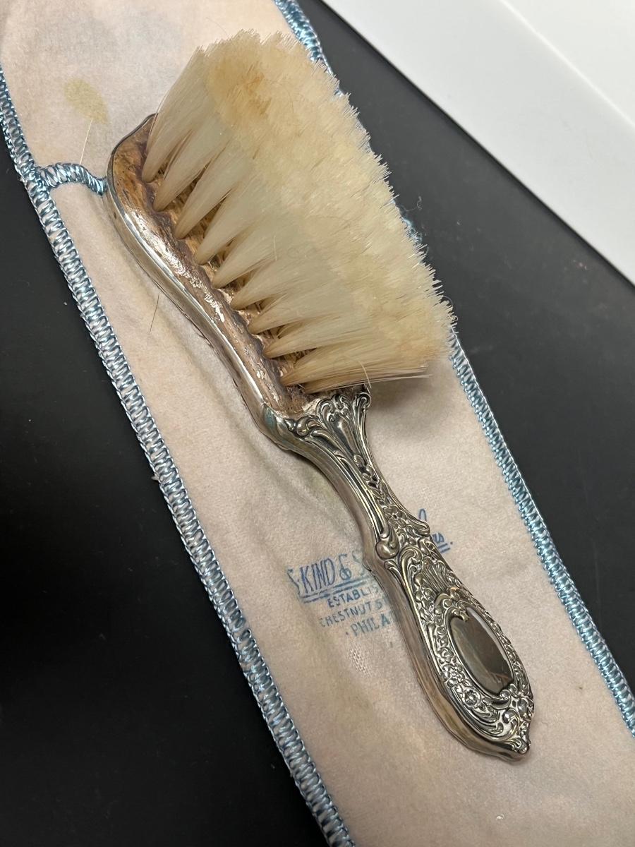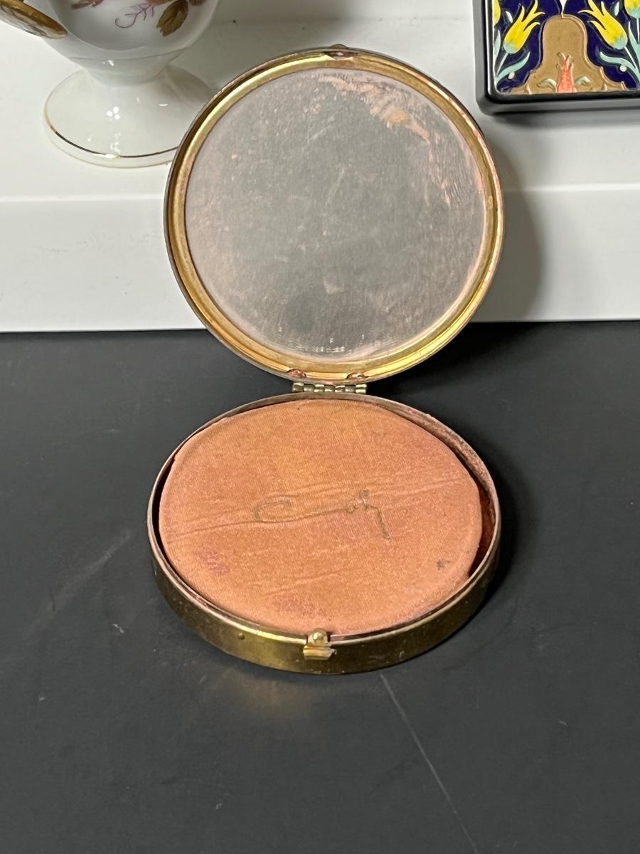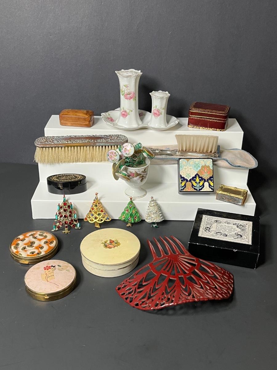 LOT 15: Mixed Lot of Vintage Items - Austria double hat pin holder, Gorham Sterling brush, Jewelry, Compacts, Make-Up & More