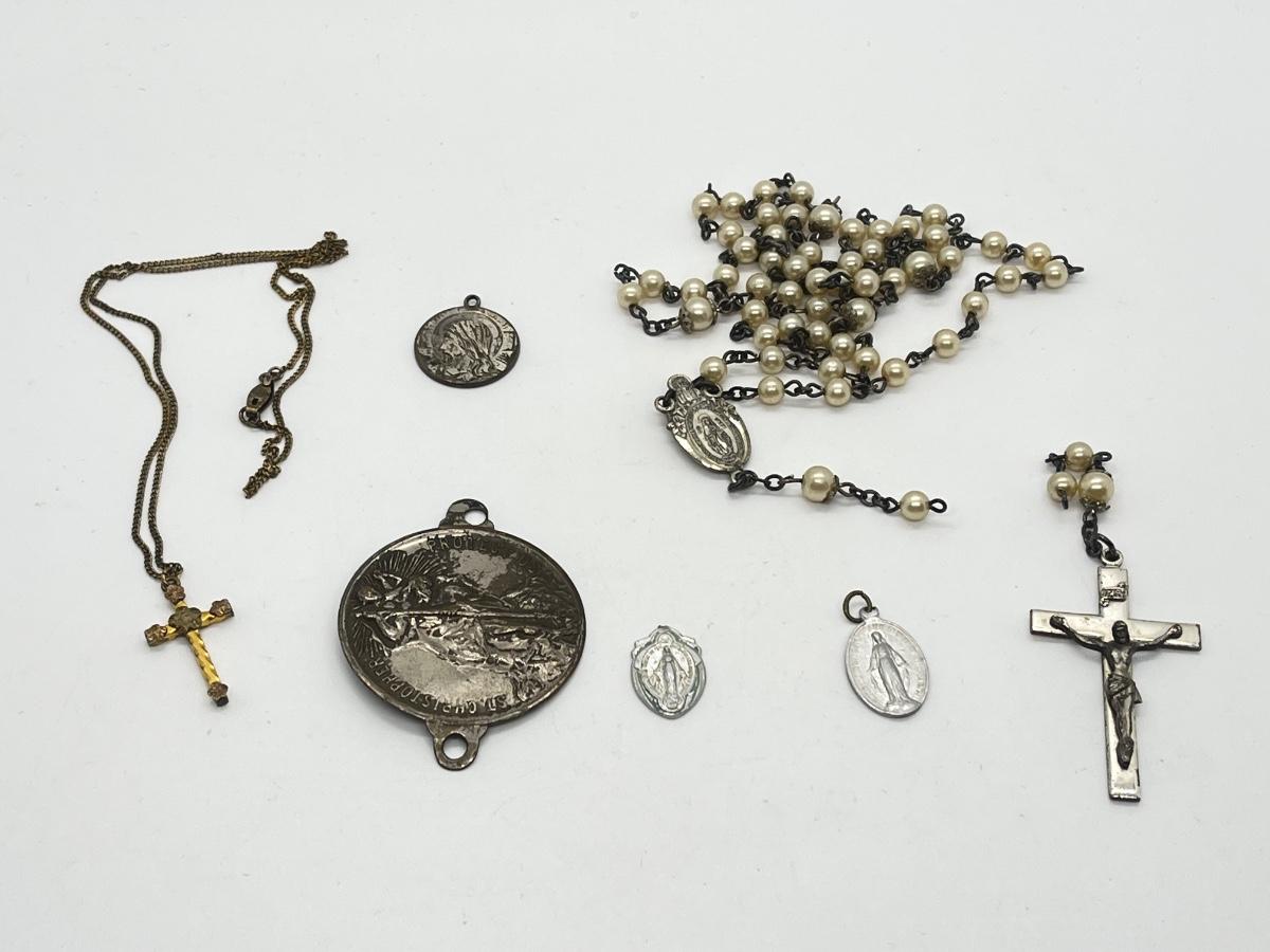 Religious Jewelry - Goldtone Cross on 18" Chain, 28" Rosary w/Sterling Cross (unattached) & More. Please see all pictures as they are the best representation of the items. The pictures show condition, measurements if taken, and what is included in the lot. Due to the large amount that we photograph and the time frame, we are not always able to take measurements. All items unless noted, are pre-owned and have been used. If you purchased furniture, you must bring help. We do not allow one person to carry large furniture out on their own. Bring help, tools and a truck for the safety of our client’s homes, and your personal safety. Any damages that result to the property including walls, and floors due to moving of the furniture will be charged to the buyer. Company policy. Thank you.