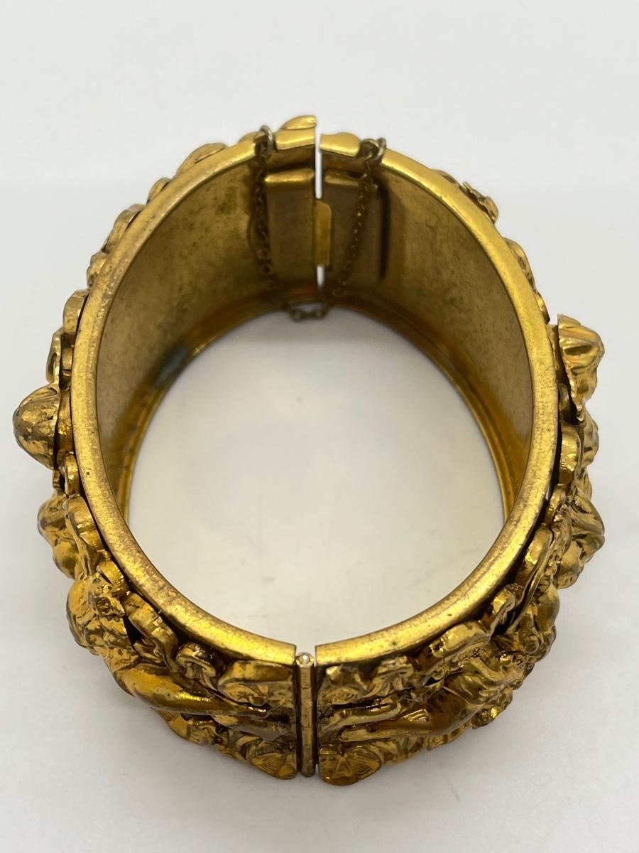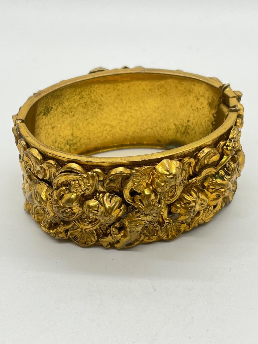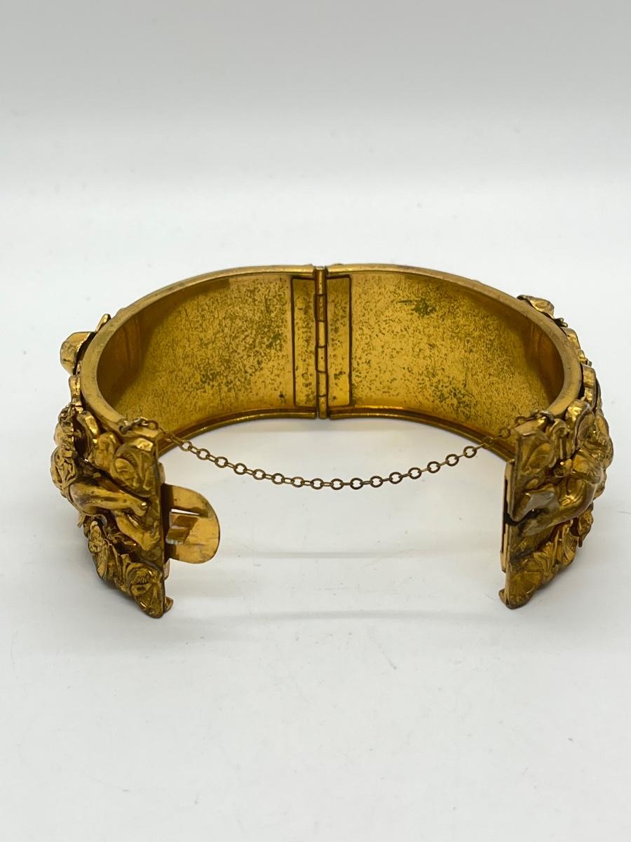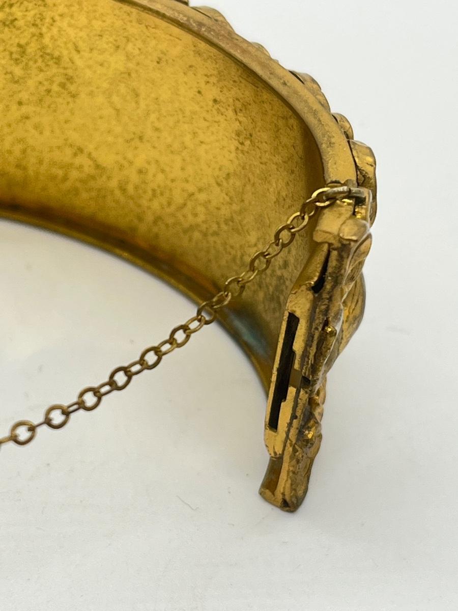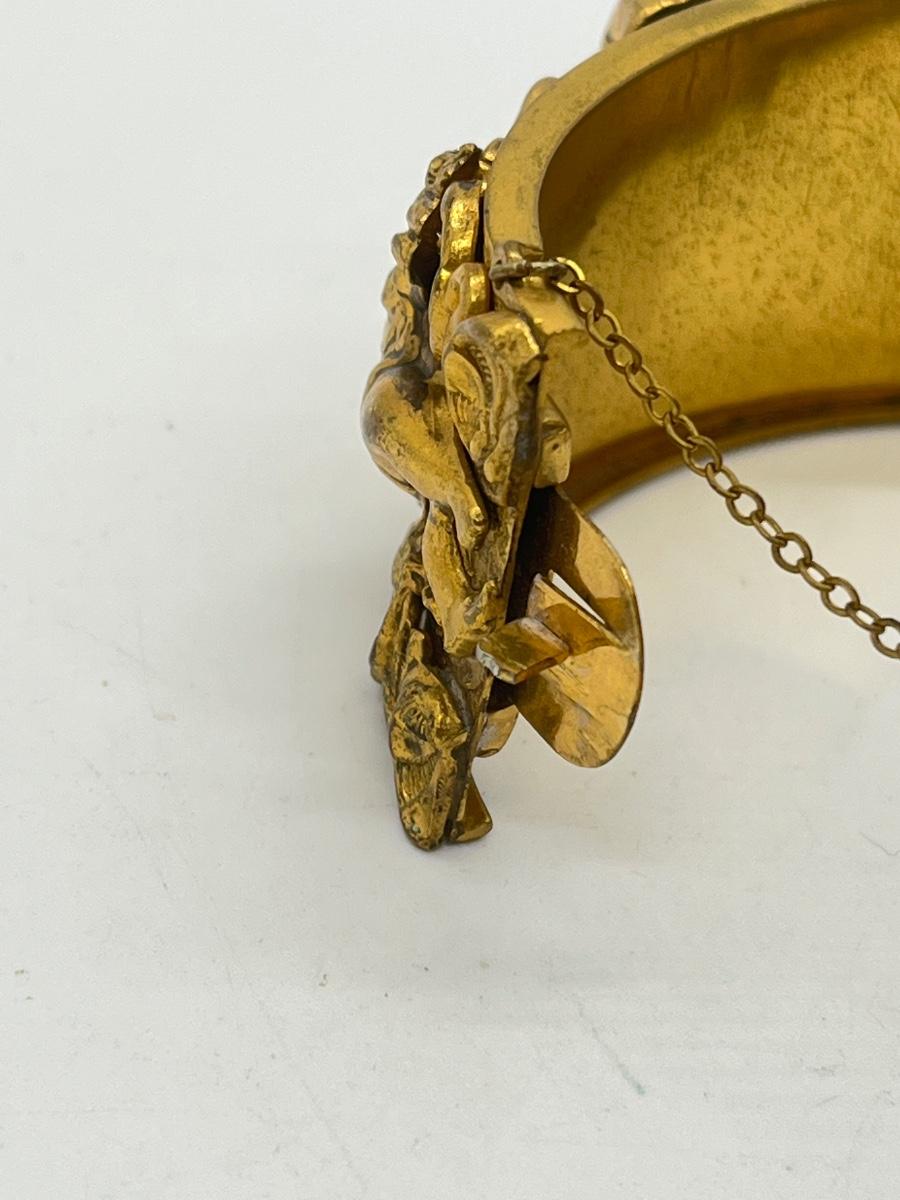 LOT 30: Vintage Ornate Goldtone Hinged Cuff Bracelet with saftey chain