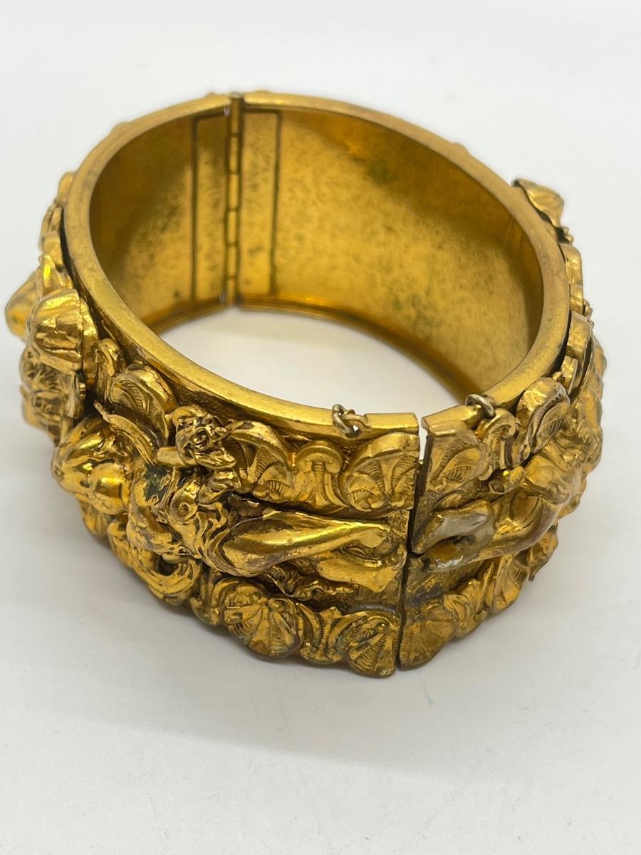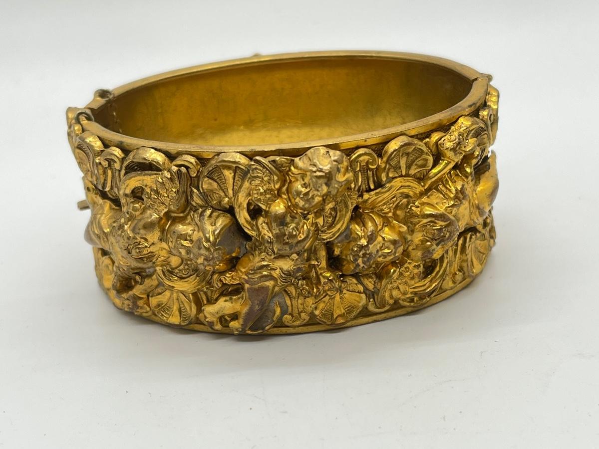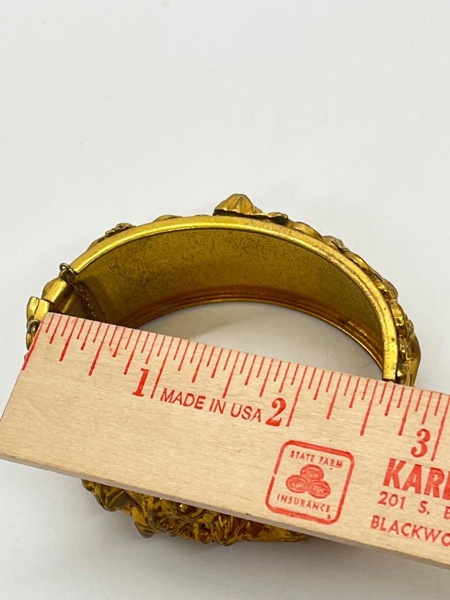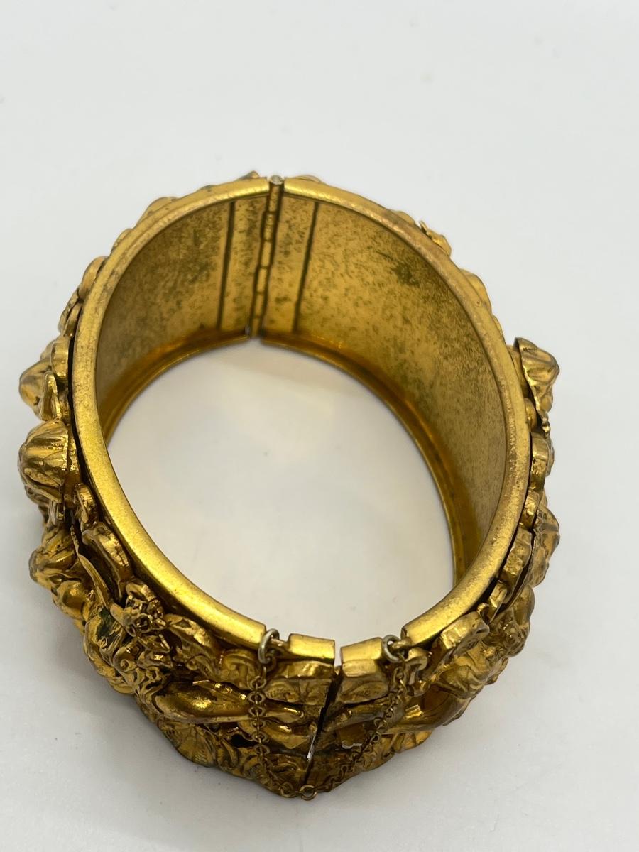LOT 30: Vintage Ornate Goldtone Hinged Cuff Bracelet with saftey chain