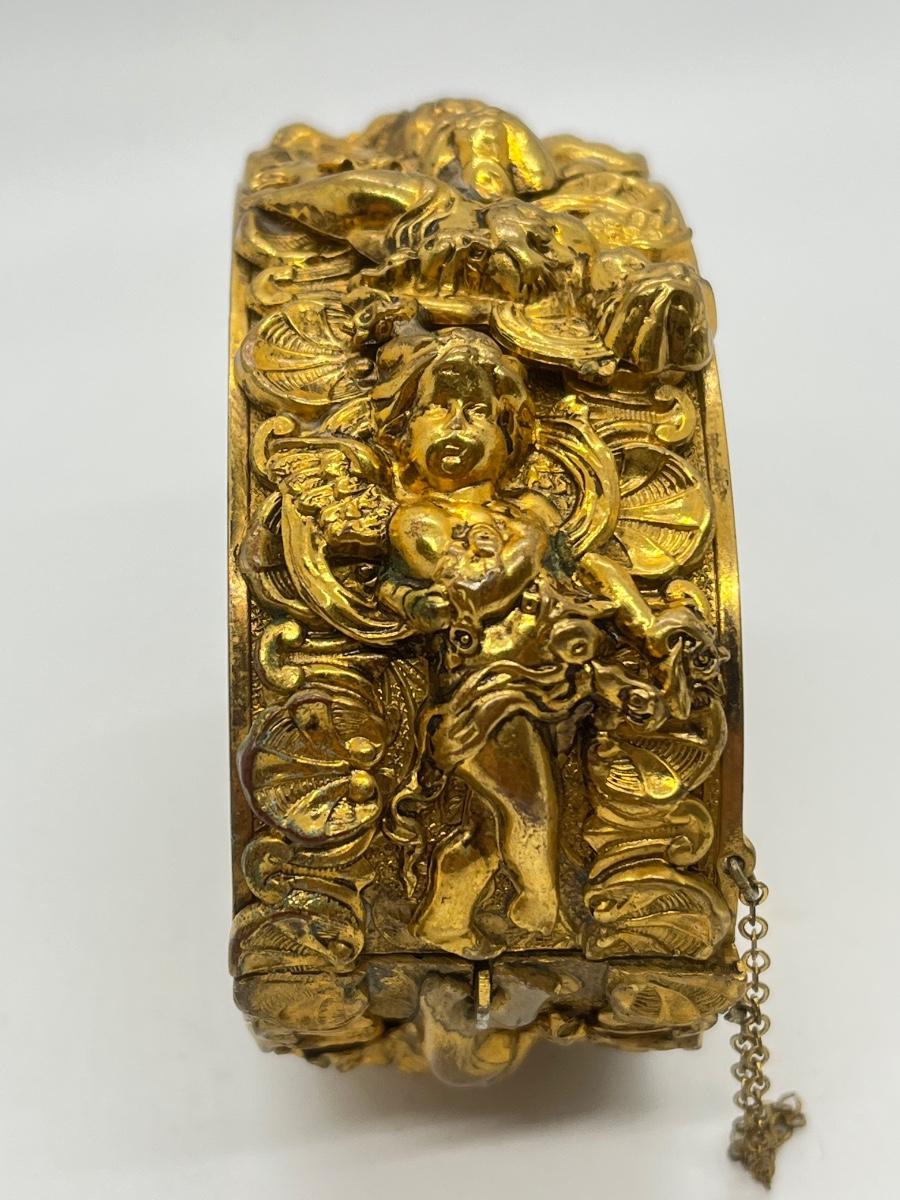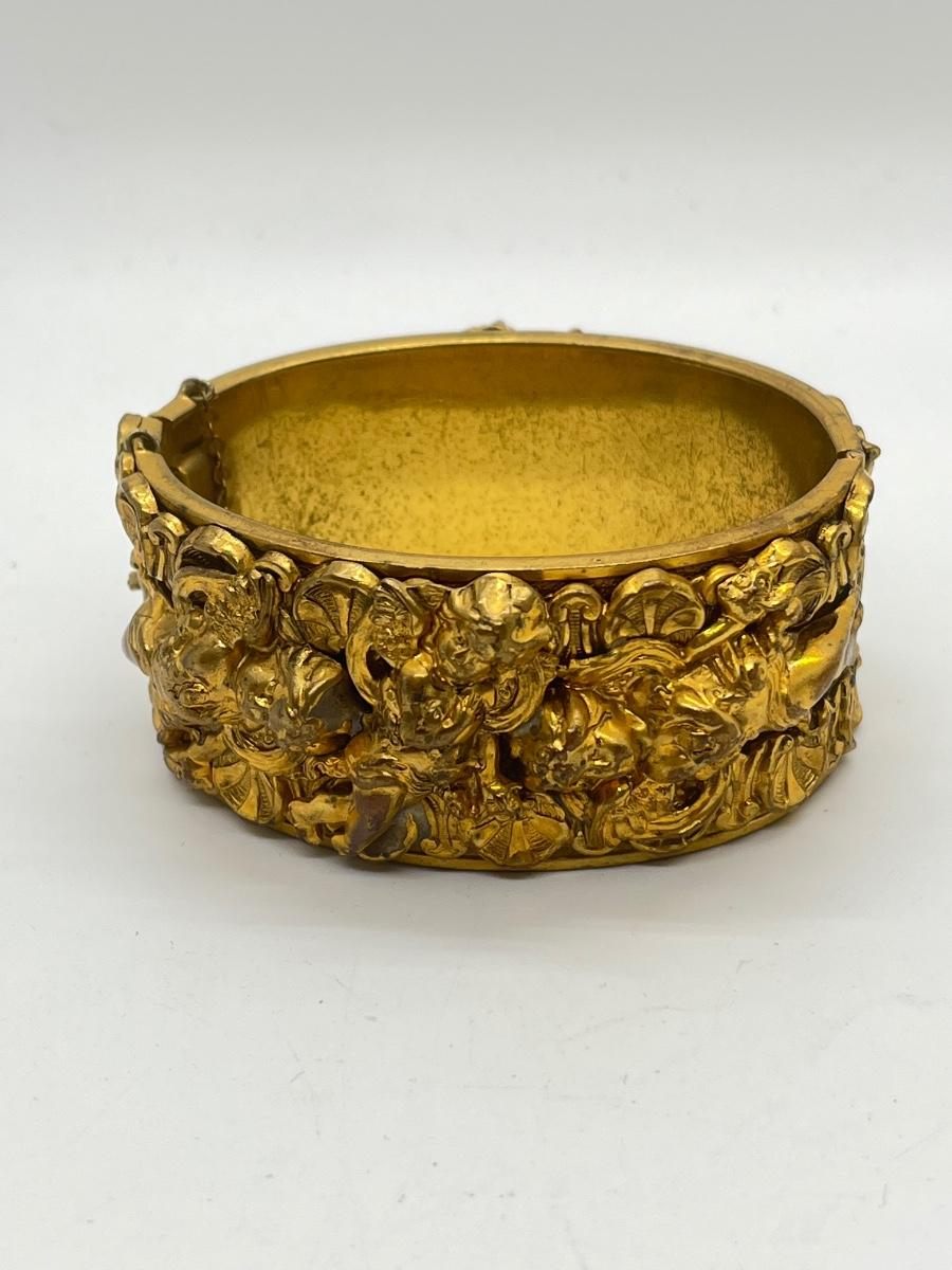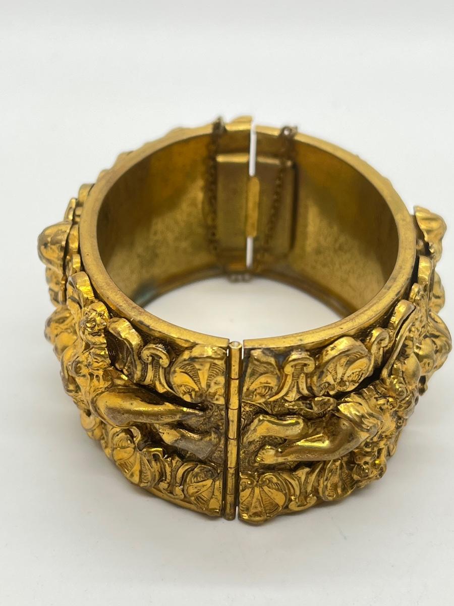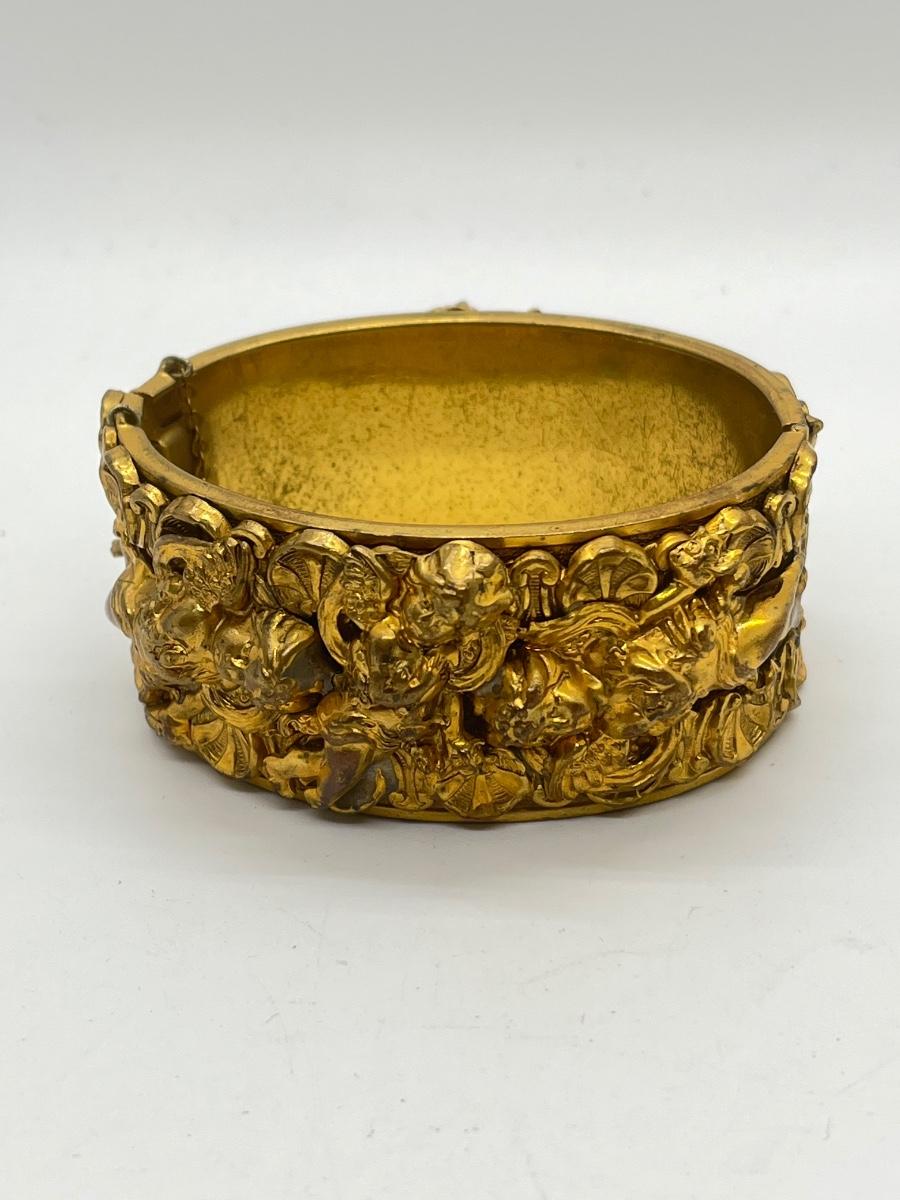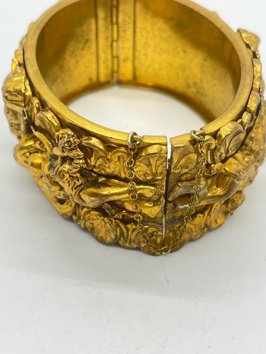 LOT 30: Vintage Ornate Goldtone Hinged Cuff Bracelet with saftey chain