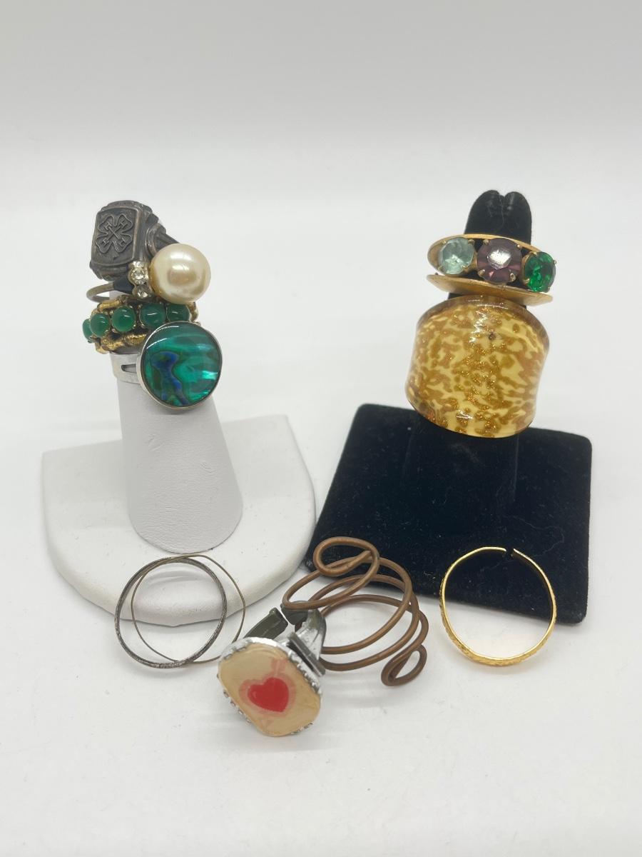 Vintage Fashion Rings - Glass size 9, 3 gem aqua purple green size 8, green stones size 7, faux pearl size 6, gold/silver intertwined size 8. The rest are adjustable. Please see all pictures as they are the best representation of the items. The pictures show condition, measurements if taken, and what is included in the lot. Due to the large amount that we photograph and the time frame, we are not always able to take measurements. All items unless noted, are pre-owned and have been used. If you purchased furniture, you must bring help. We do not allow one person to carry large furniture out on their own. Bring help, tools and a truck for the safety of our client’s homes, and your personal safety. Any damages that result to the property including walls, and floors due to moving of the furniture will be charged to the buyer. Company policy. Thank you.