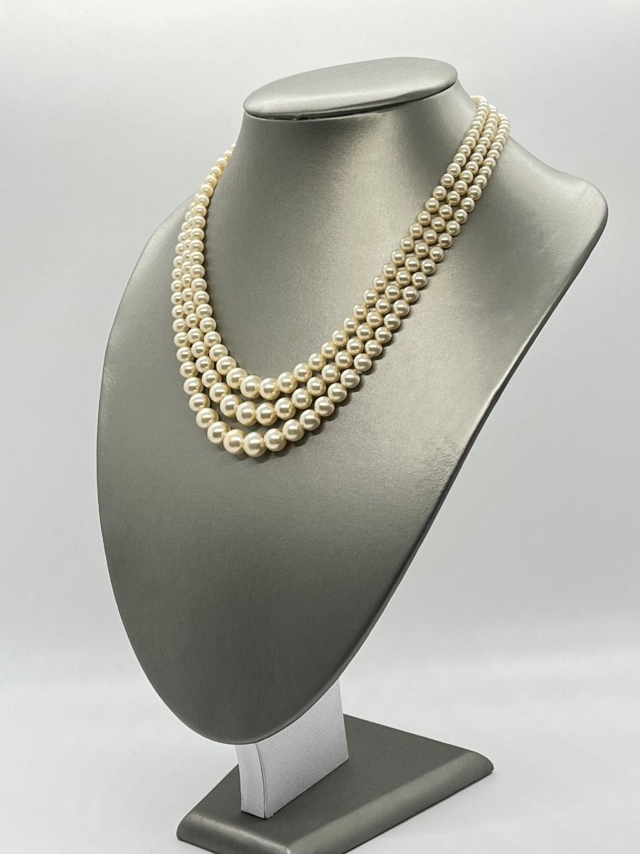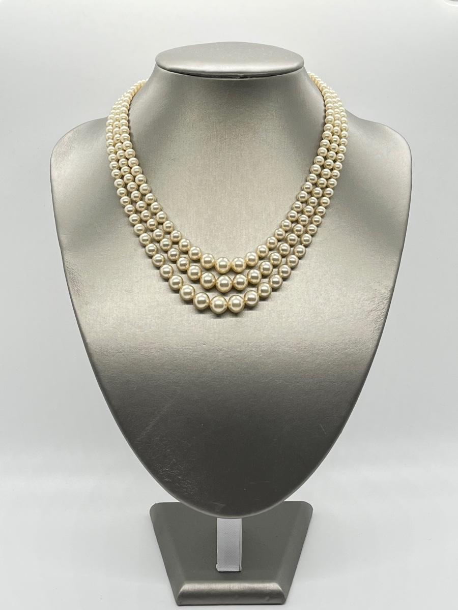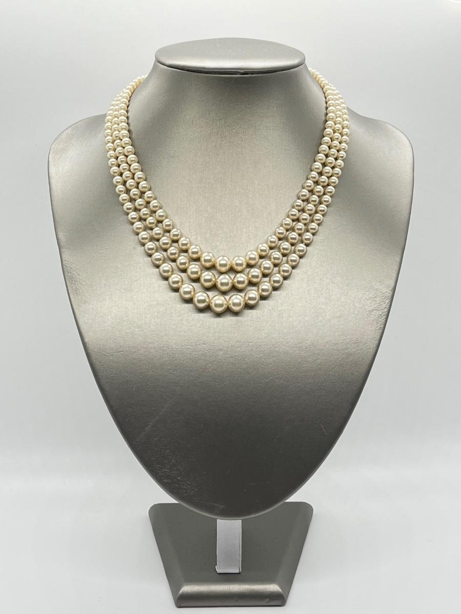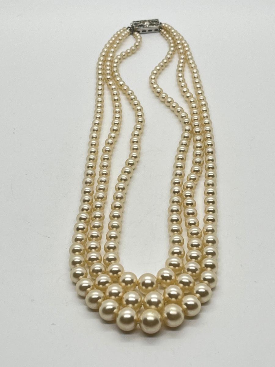 Faux Pearl Three Strand Vintage 17" Necklace. Please see all pictures as they are the best representation of the items. The pictures show condition, measurements if taken, and what is included in the lot. Due to the large amount that we photograph and the time frame, we are not always able to take measurements. All items unless noted, are pre-owned and have been used. If you purchased furniture, you must bring help. We do not allow one person to carry large furniture out on their own. Bring help, tools and a truck for the safety of our client’s homes, and your personal safety. Any damages that result to the property including walls, and floors due to moving of the furniture will be charged to the buyer. Company policy. Thank you.