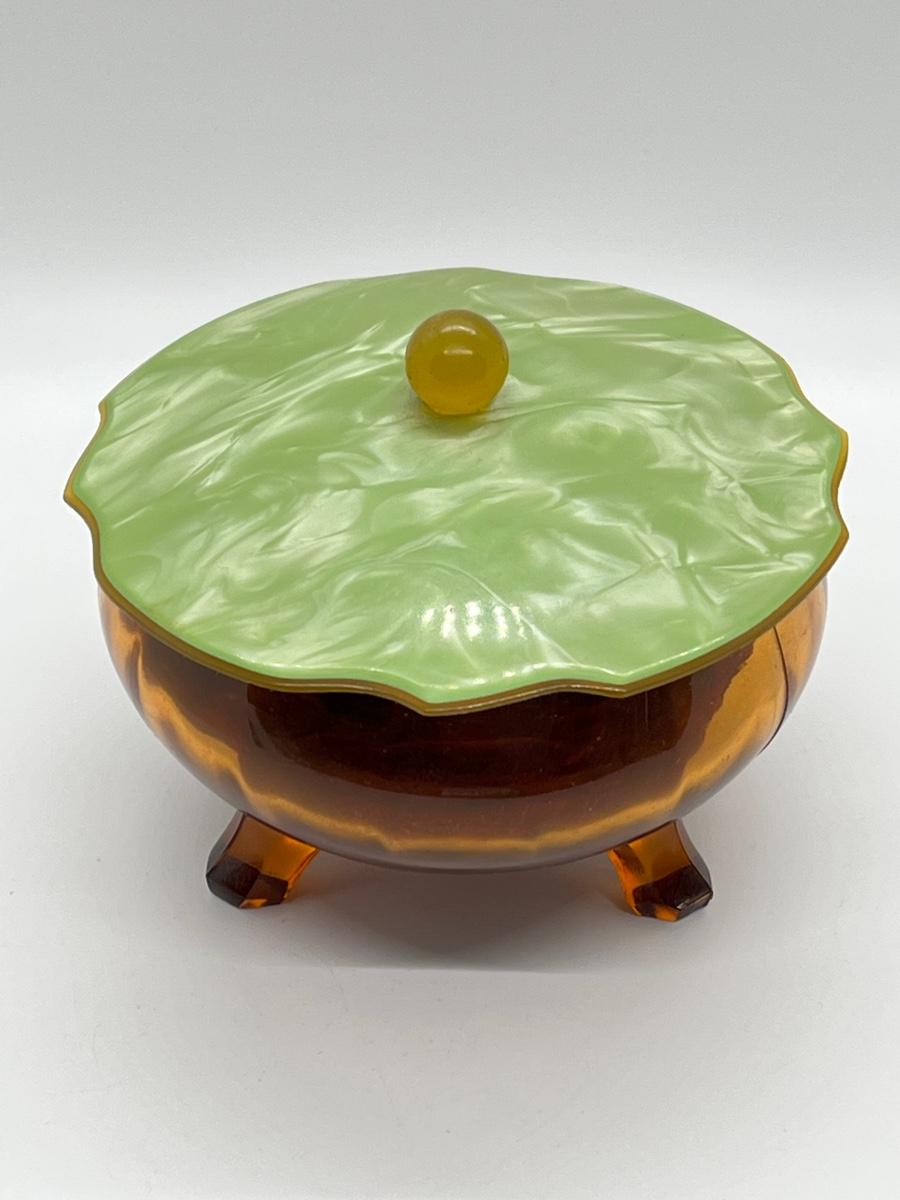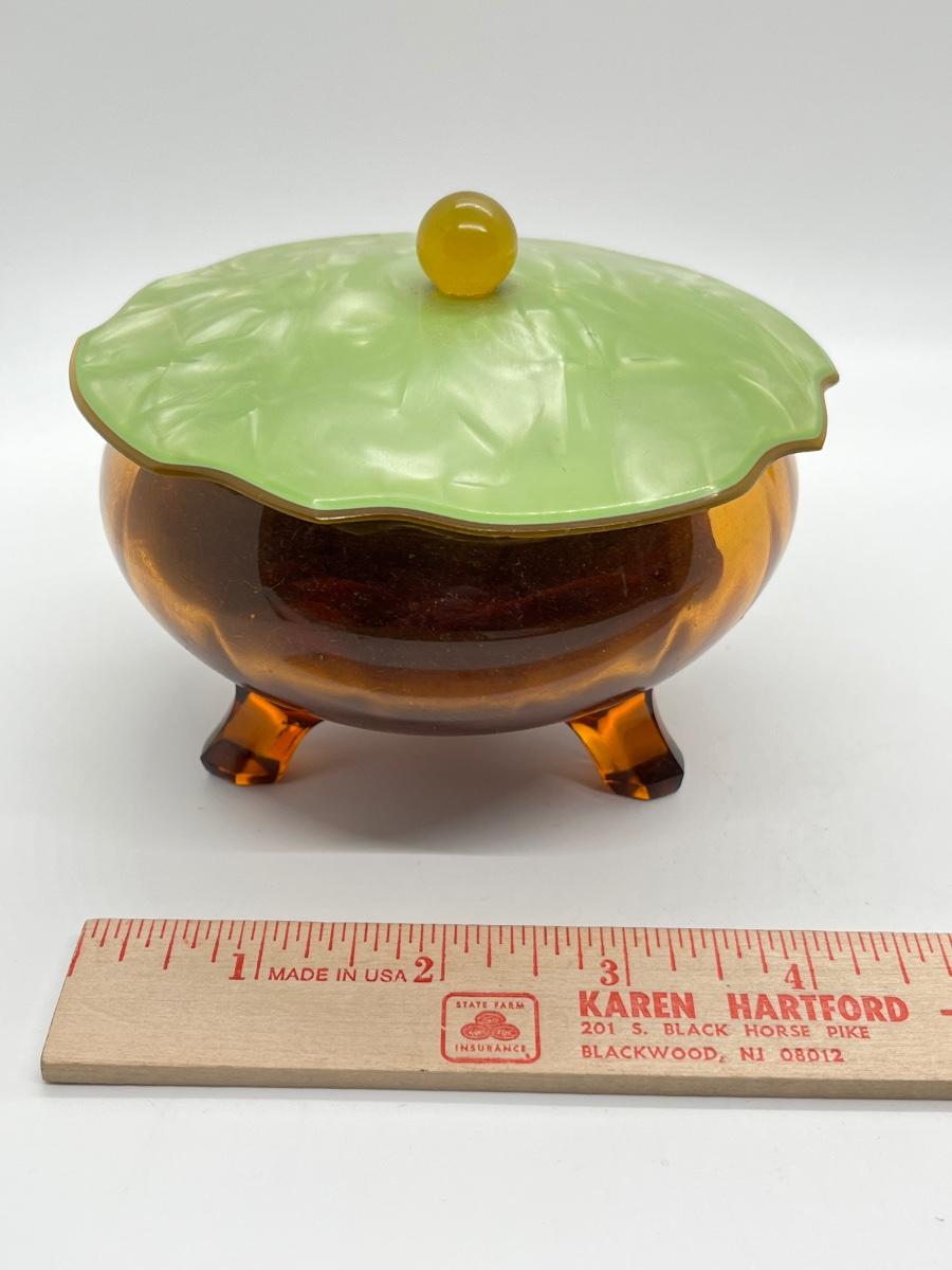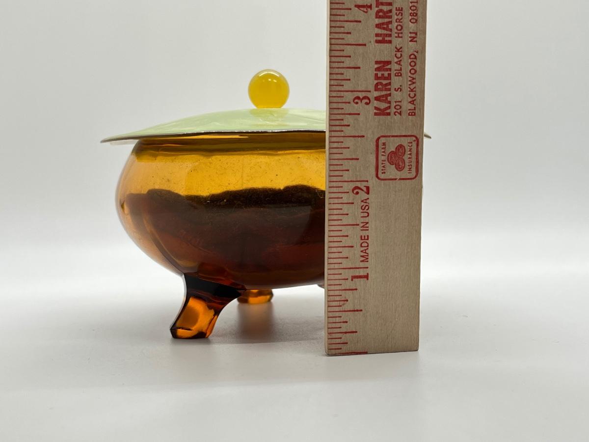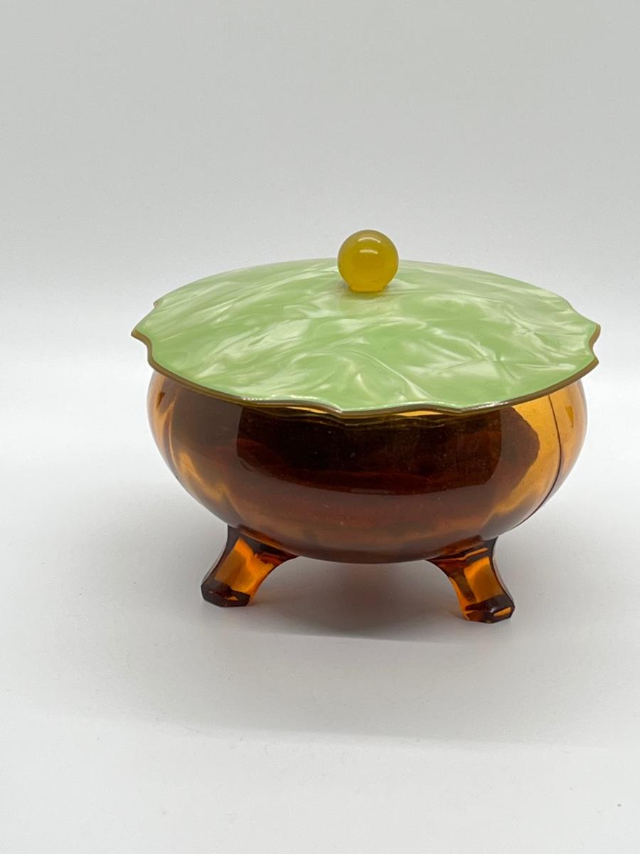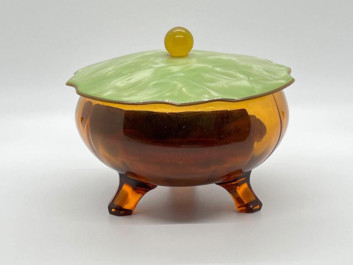 LOT 111: 1930's Art Deco Trinket Dish - Amber Glass with Pearlized Celloid Lid