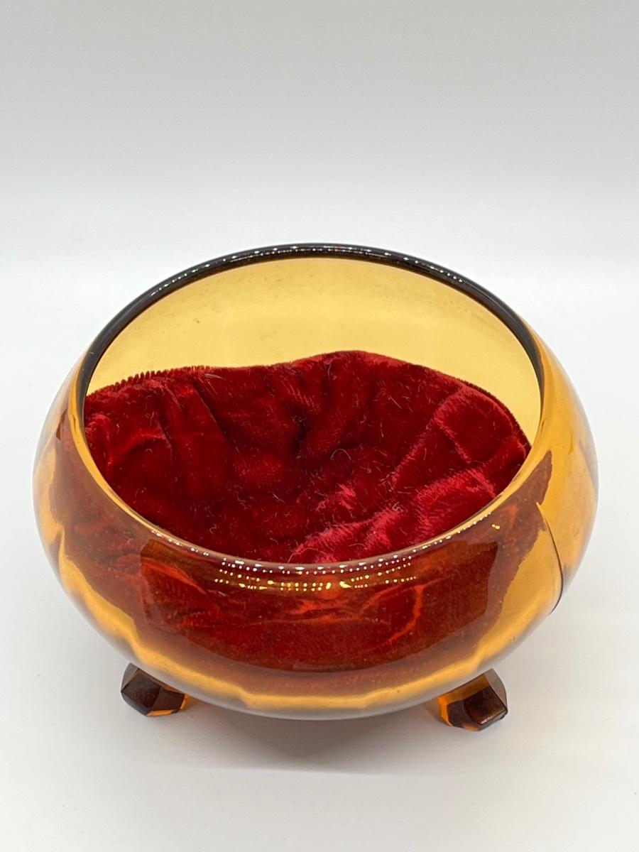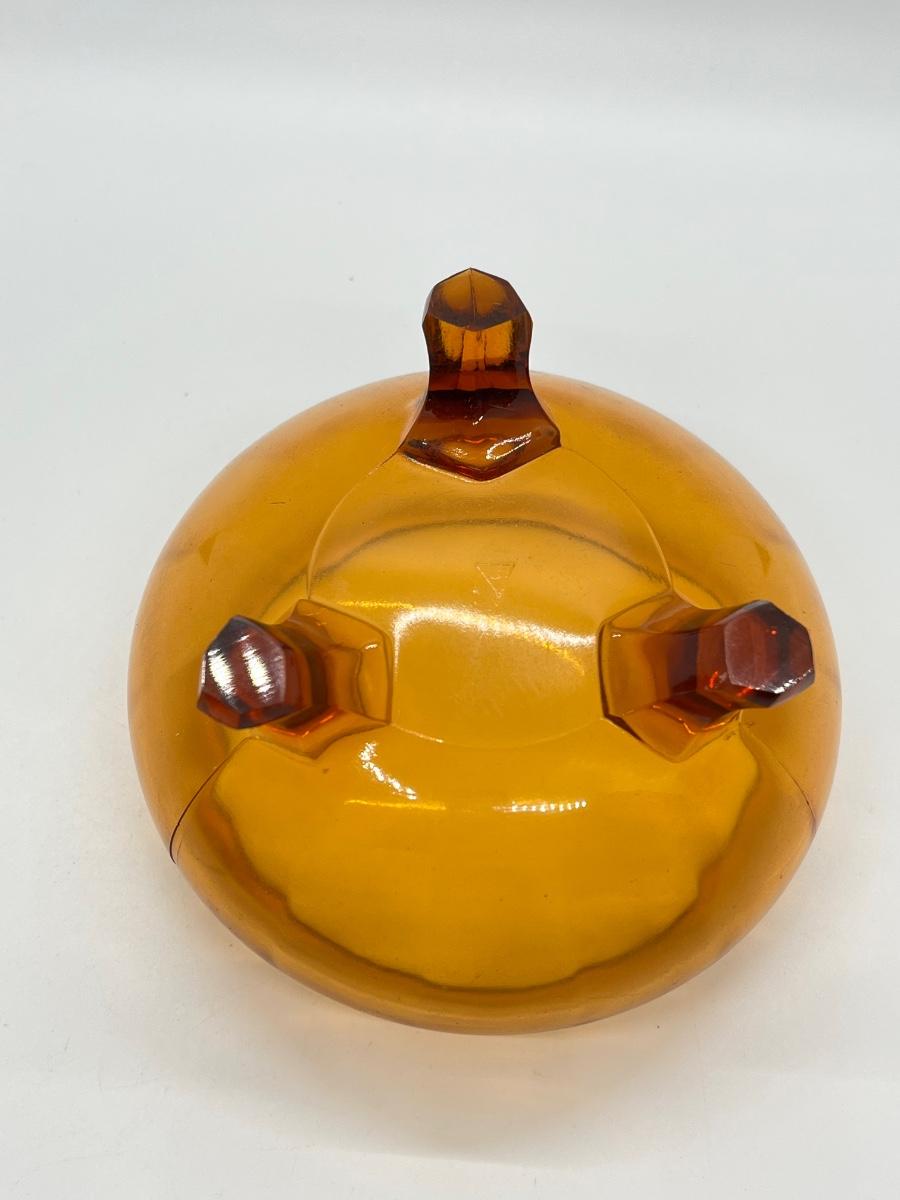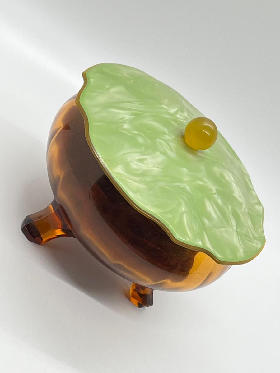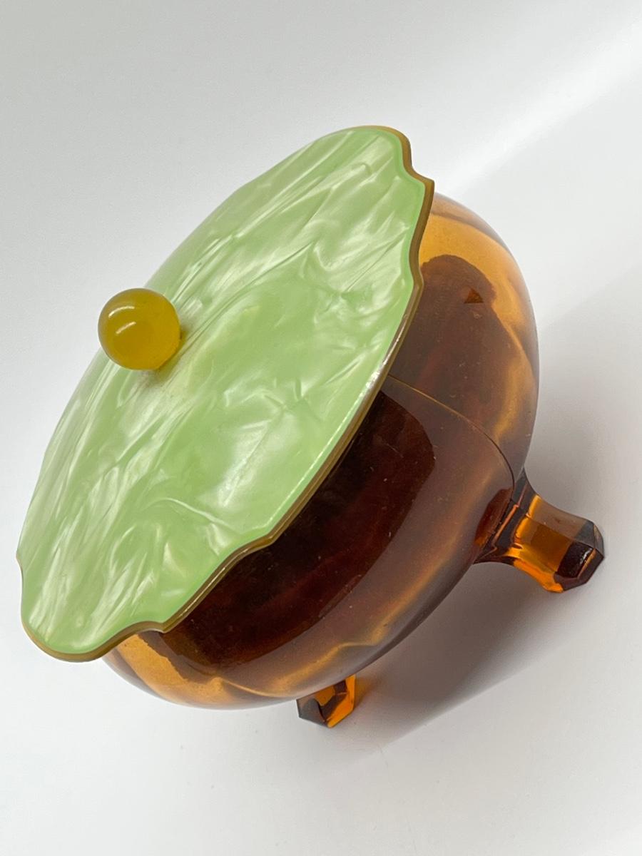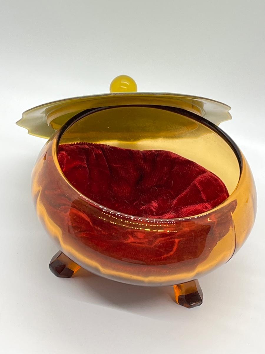 LOT 111: 1930's Art Deco Trinket Dish - Amber Glass with Pearlized Celloid Lid
