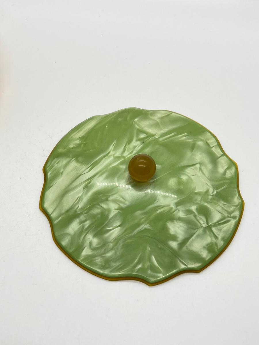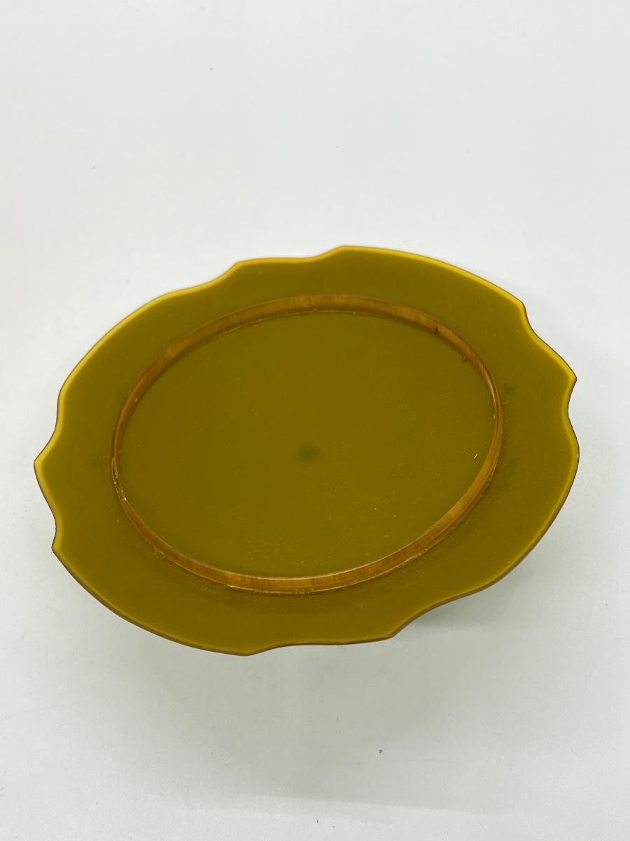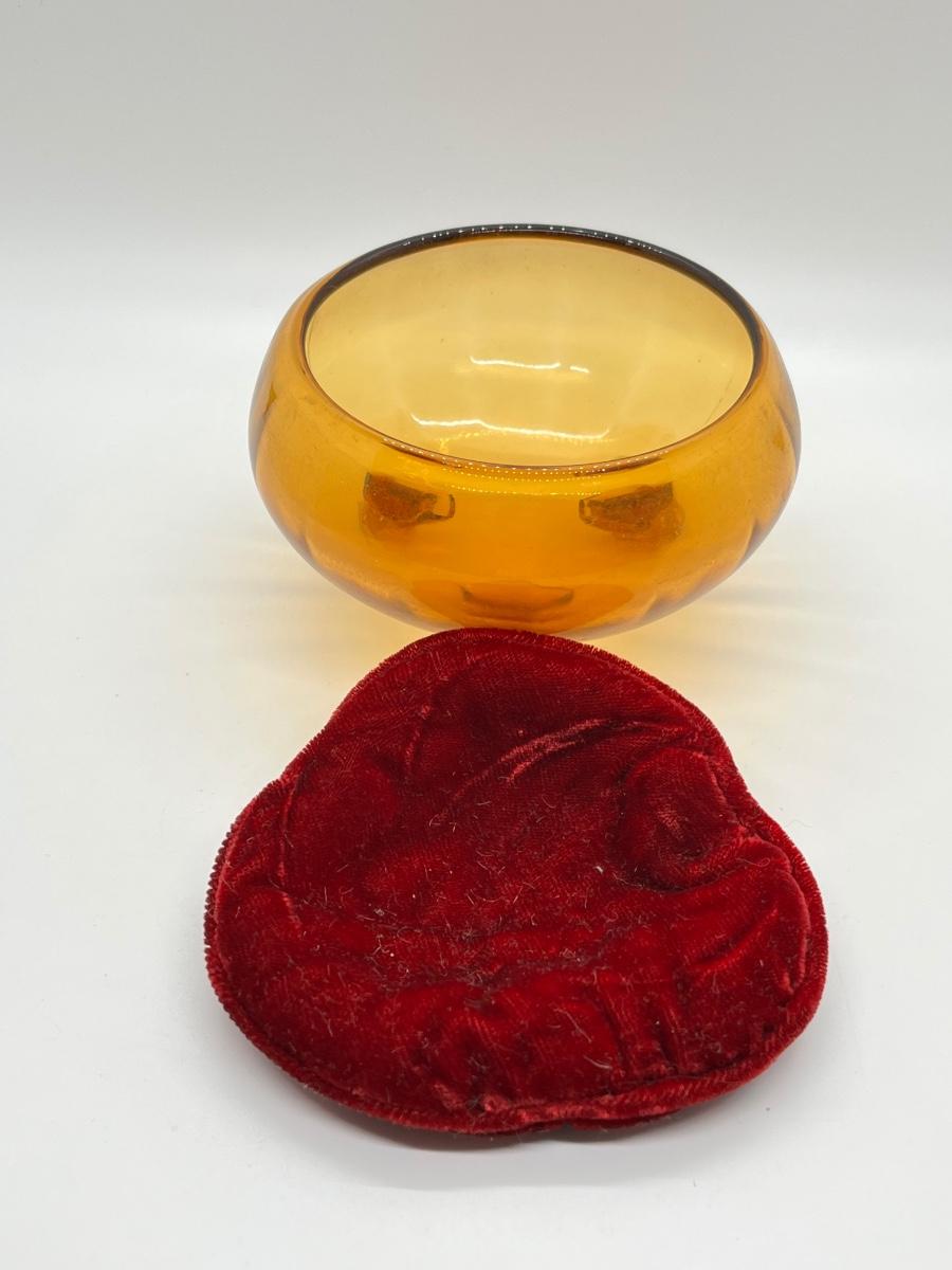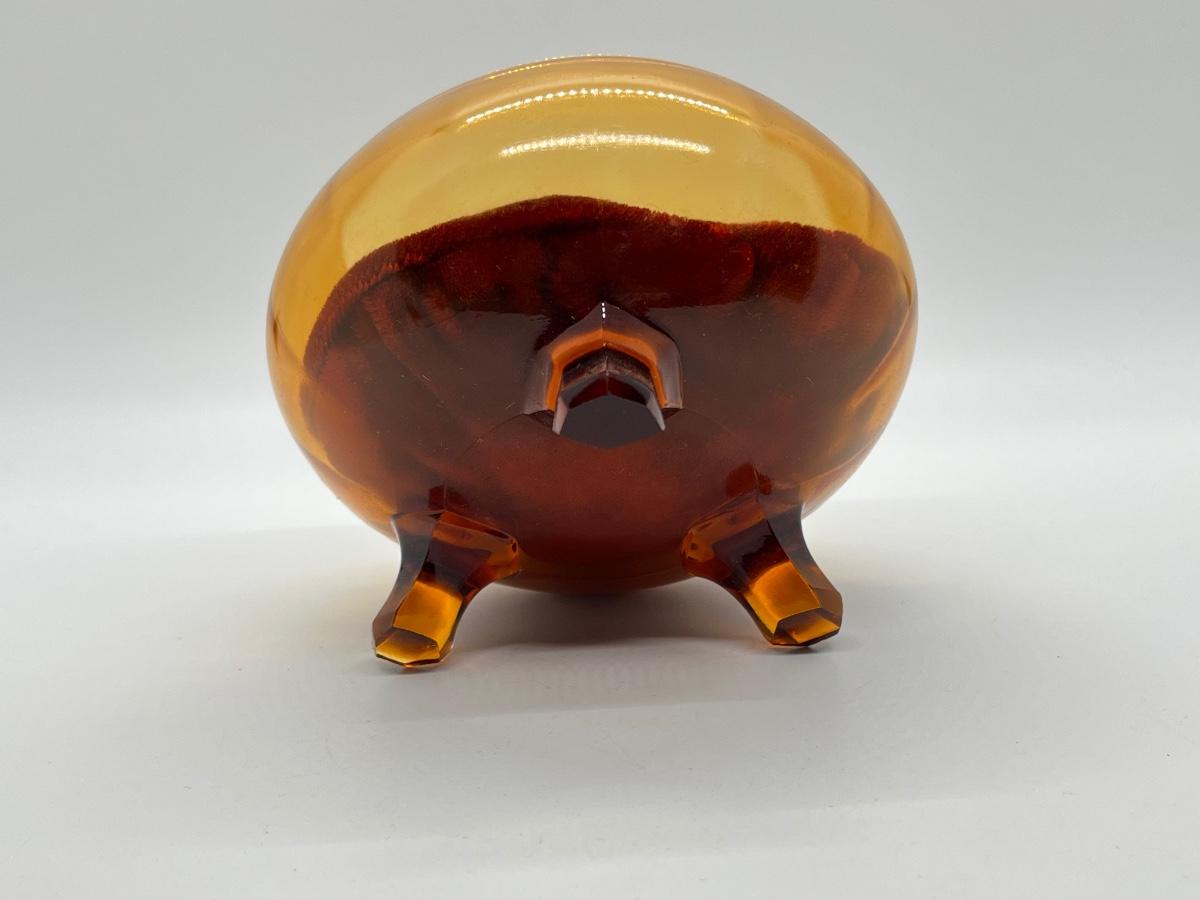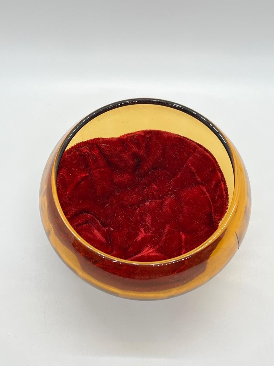 LOT 111: 1930's Art Deco Trinket Dish - Amber Glass with Pearlized Celloid Lid