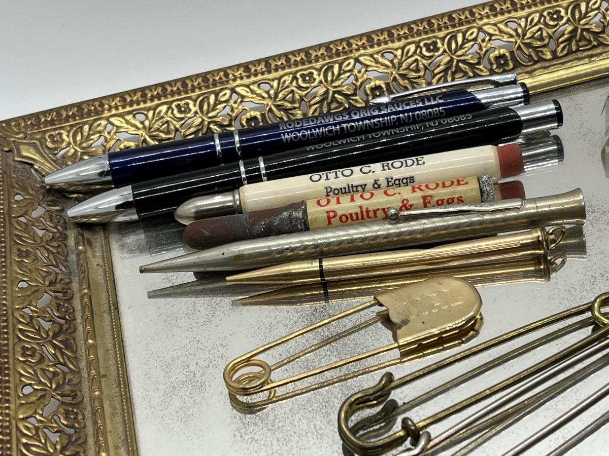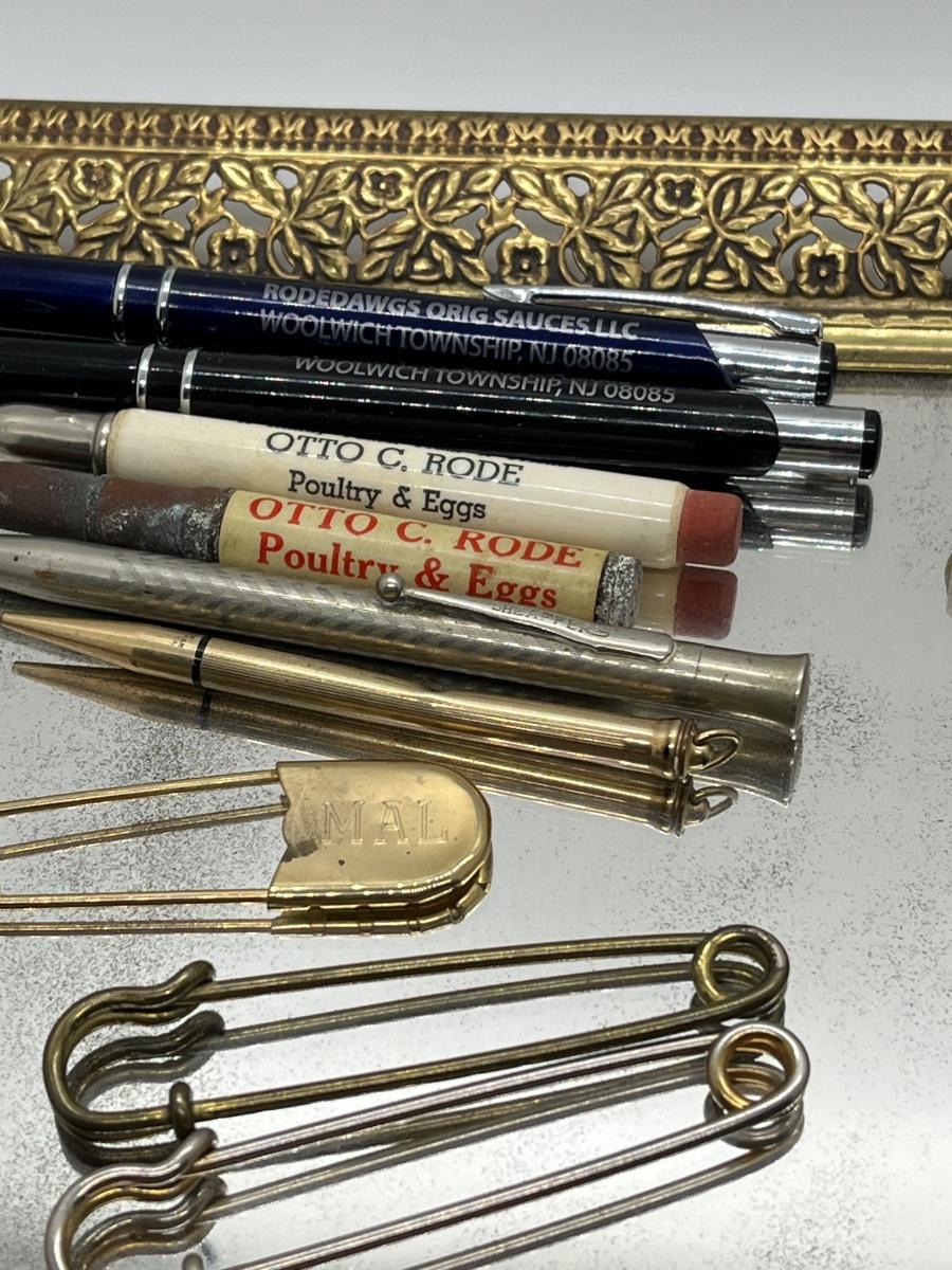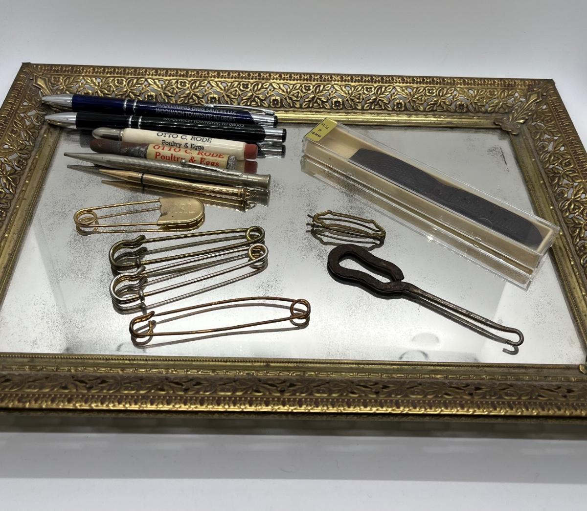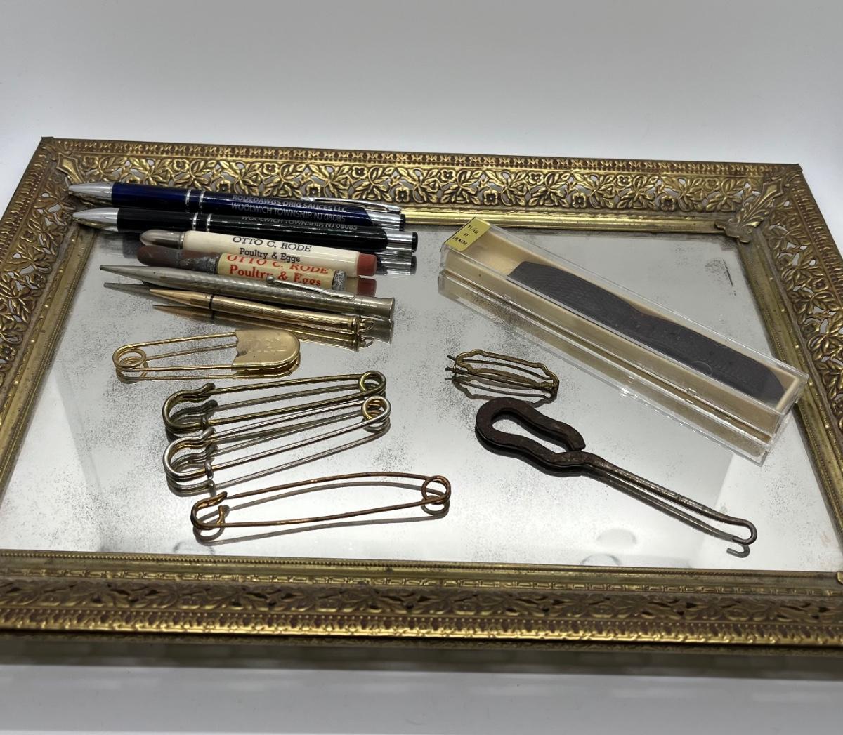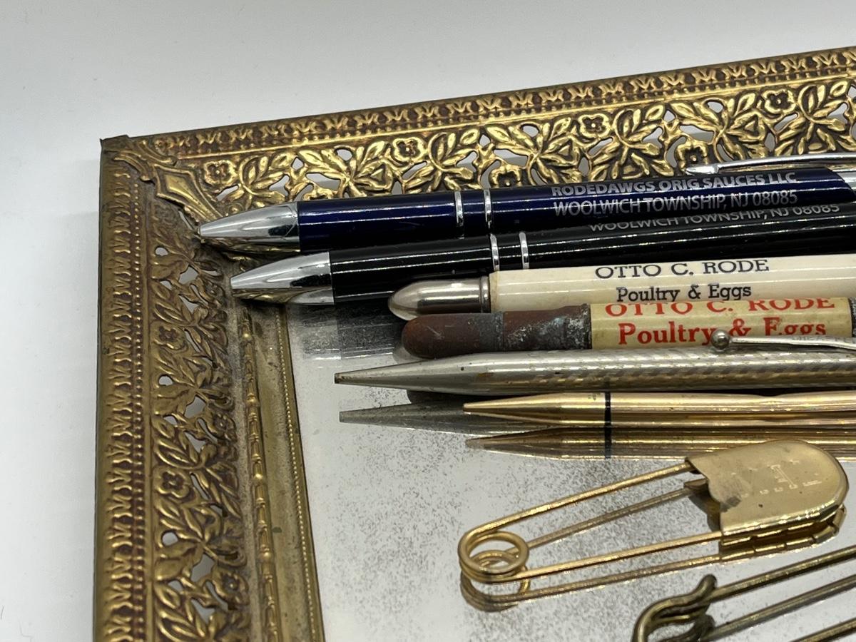 LOT 114: Vintage Odds, Ends, Pencils and Pens w/ Mirrored Tray