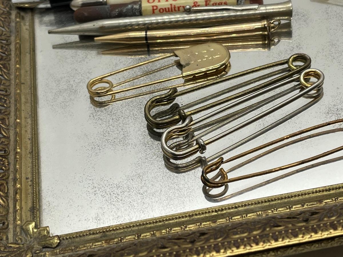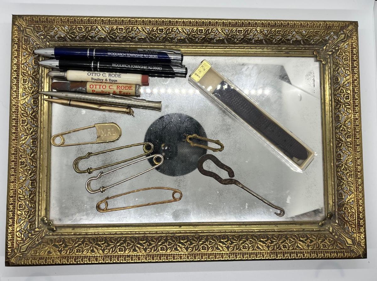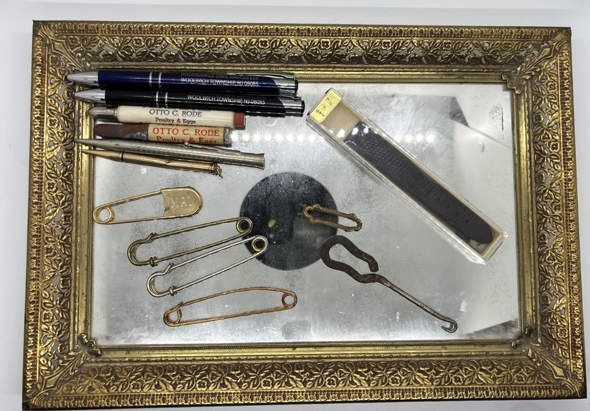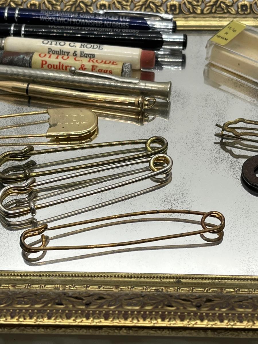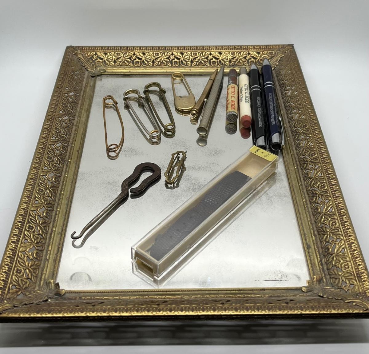 LOT 114: Vintage Odds, Ends, Pencils and Pens w/ Mirrored Tray