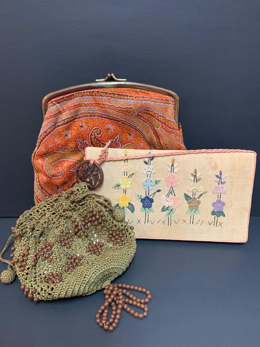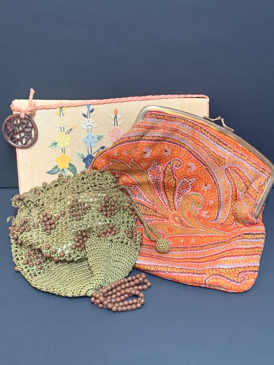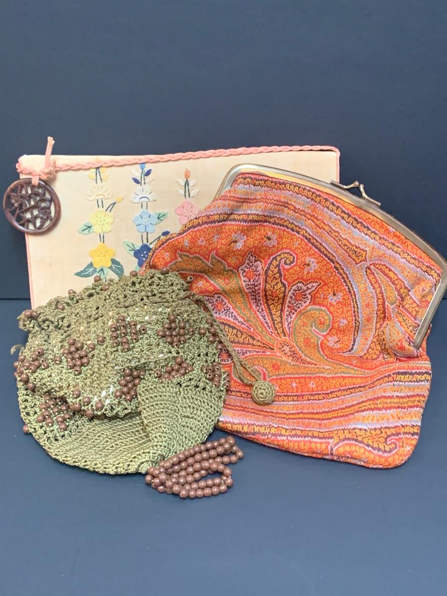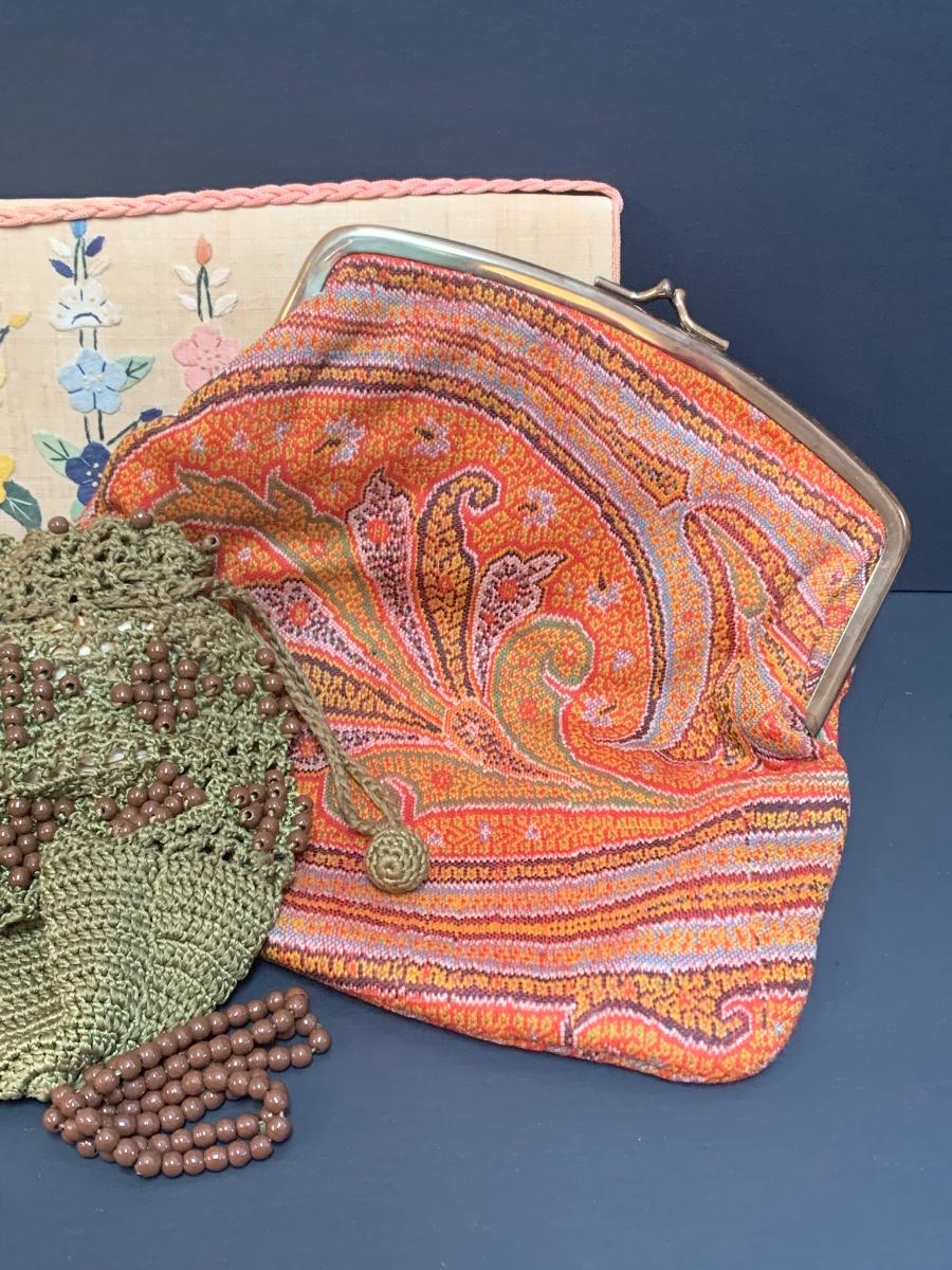 Collection of 3 small vintage clutch size purses: macramé olive green with wood bead accents, vibrant orange with a paisley like print and a light peach in color with a floral design.