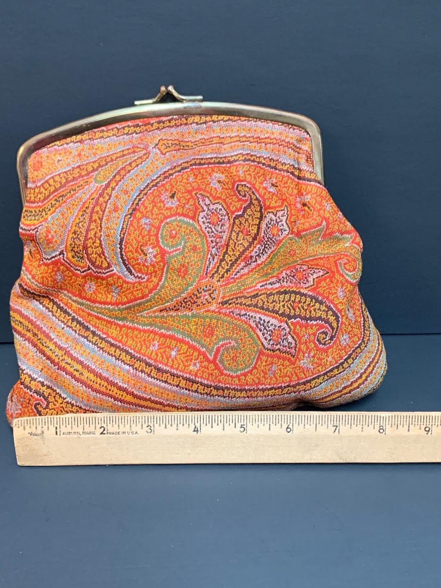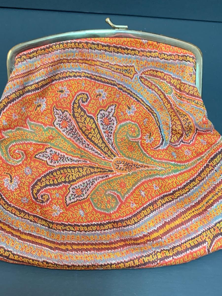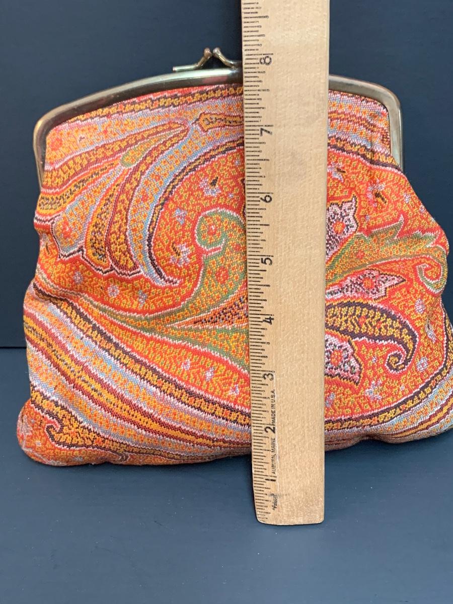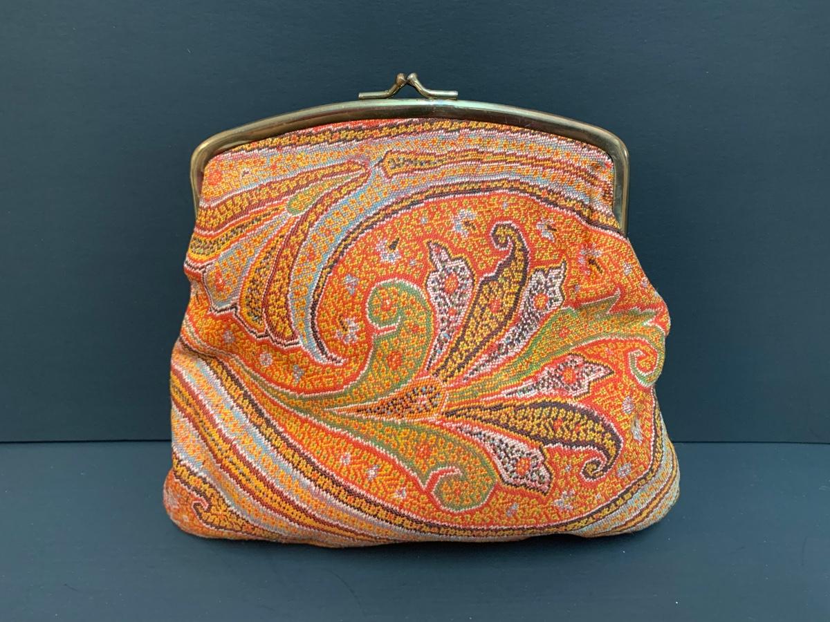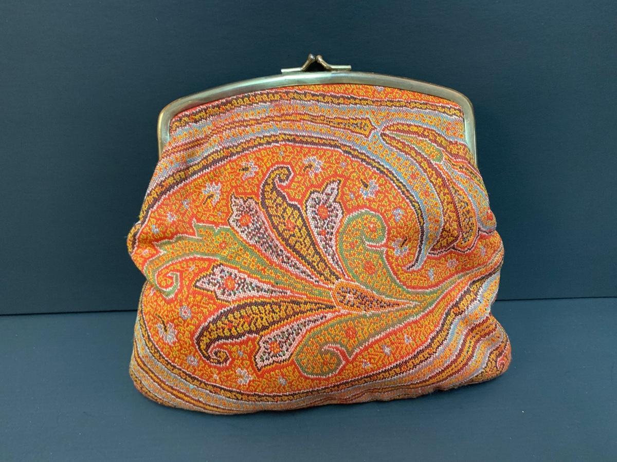 Collection of 3 small vintage clutch size purses: macramé olive green with wood bead accents, vibrant orange with a paisley like print and a light peach in color with a floral design.