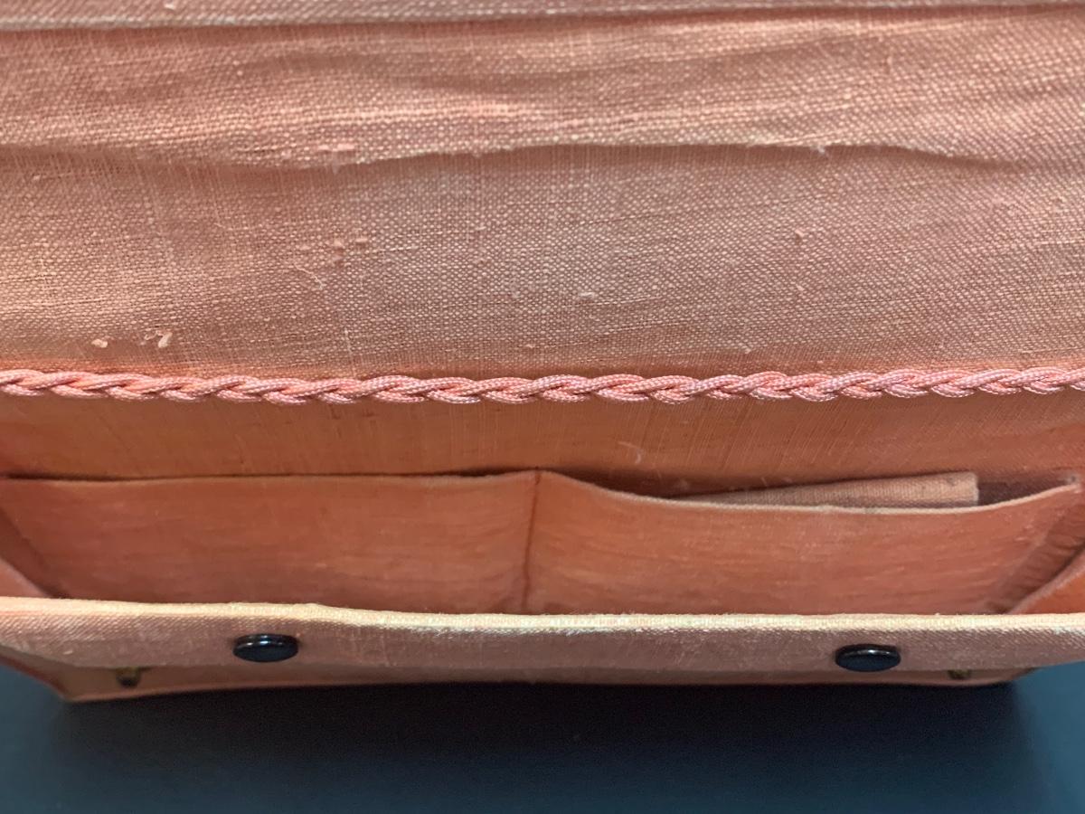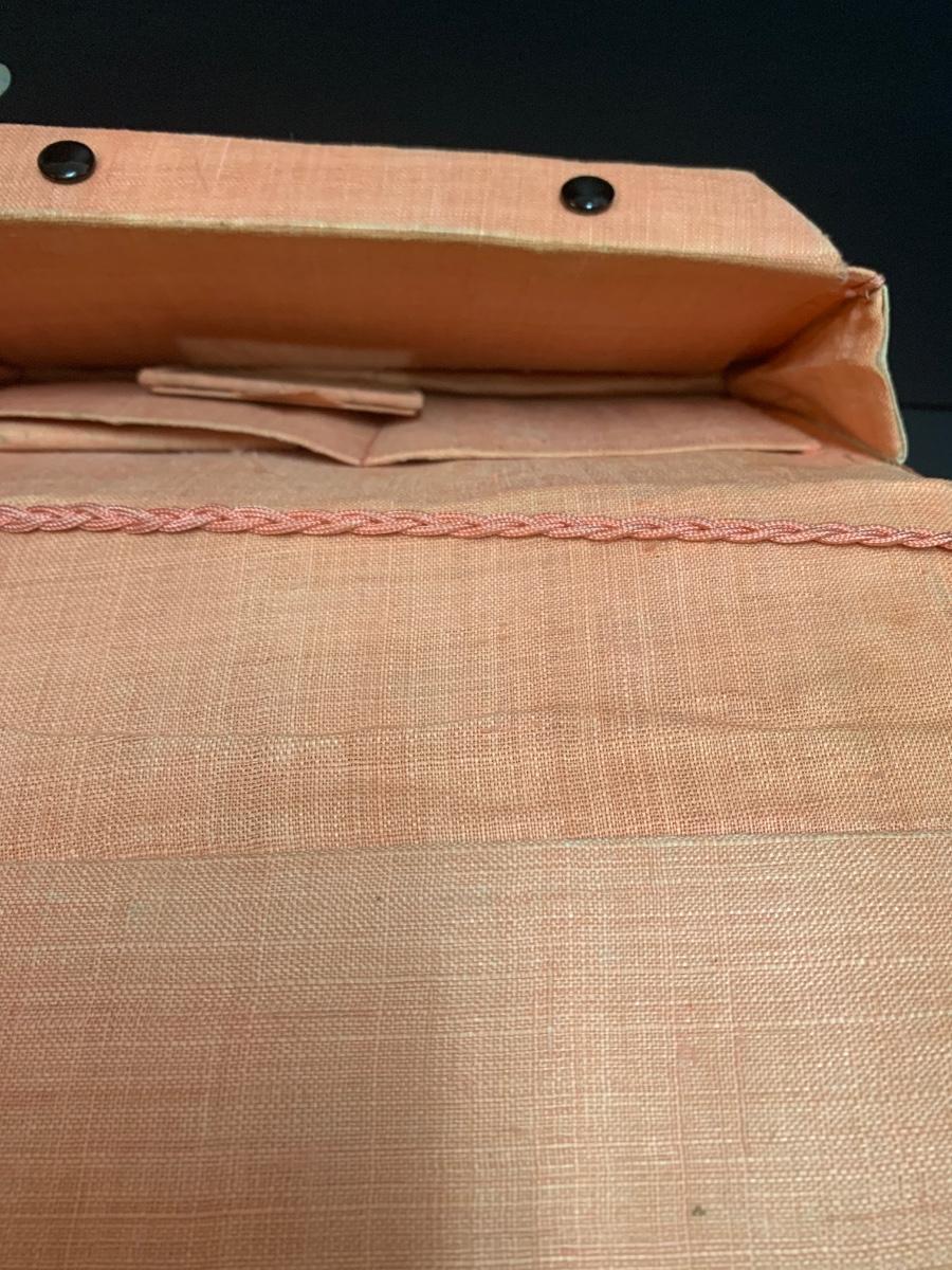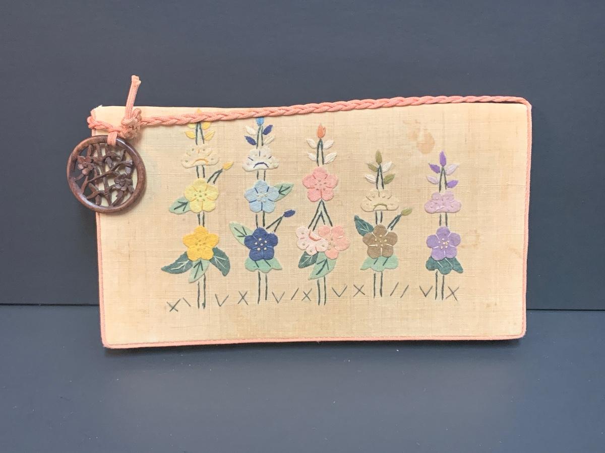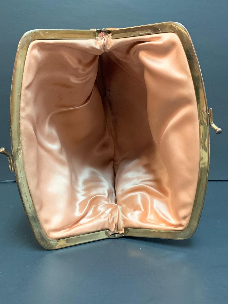 Collection of 3 small vintage clutch size purses: macramé olive green with wood bead accents, vibrant orange with a paisley like print and a light peach in color with a floral design.