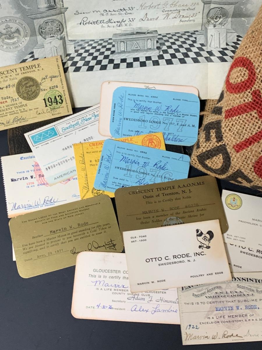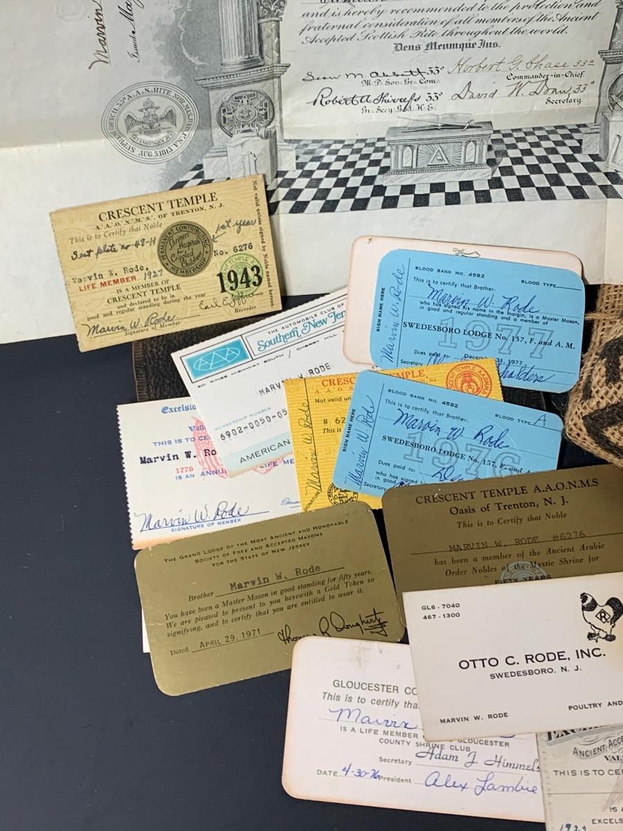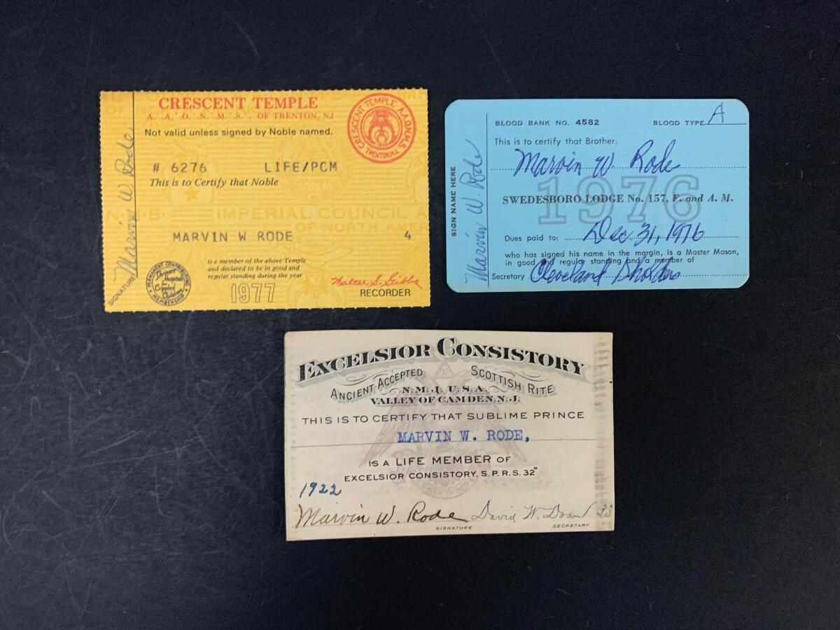Collection of Marvin W. Rode Masonic Acceptance & I.D. Cards along with Otto