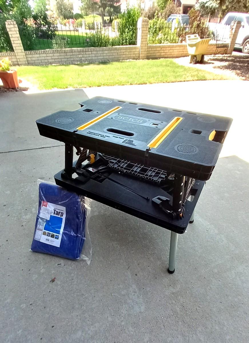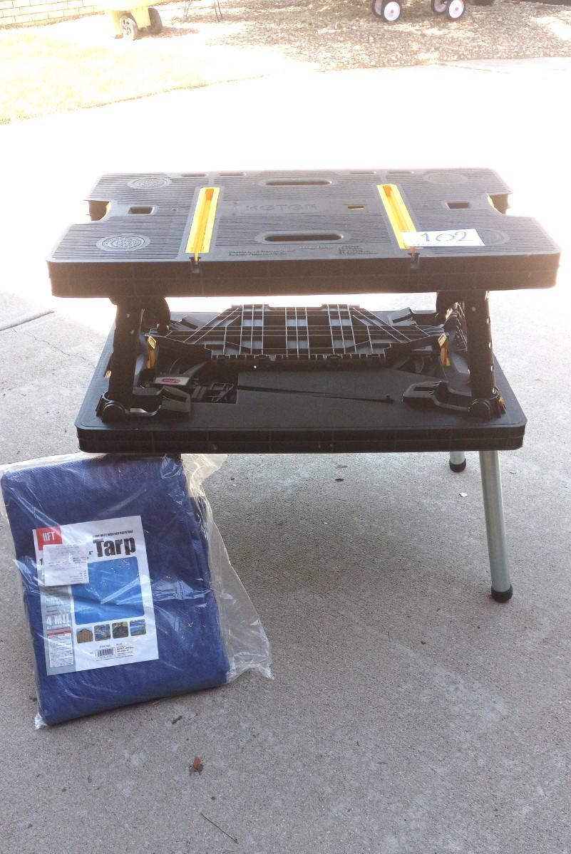KETER FOLDING WORKTABLE 33X21 AND NEW LIGHT DUTY WATERPROOF TARP 10X12