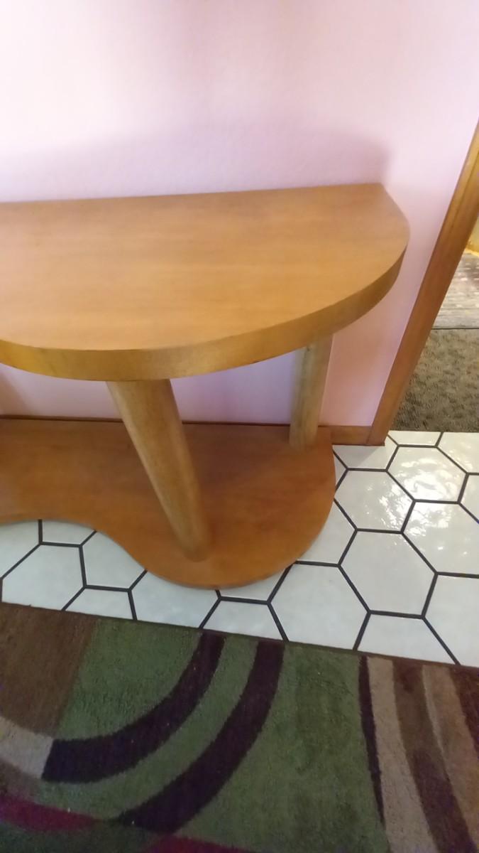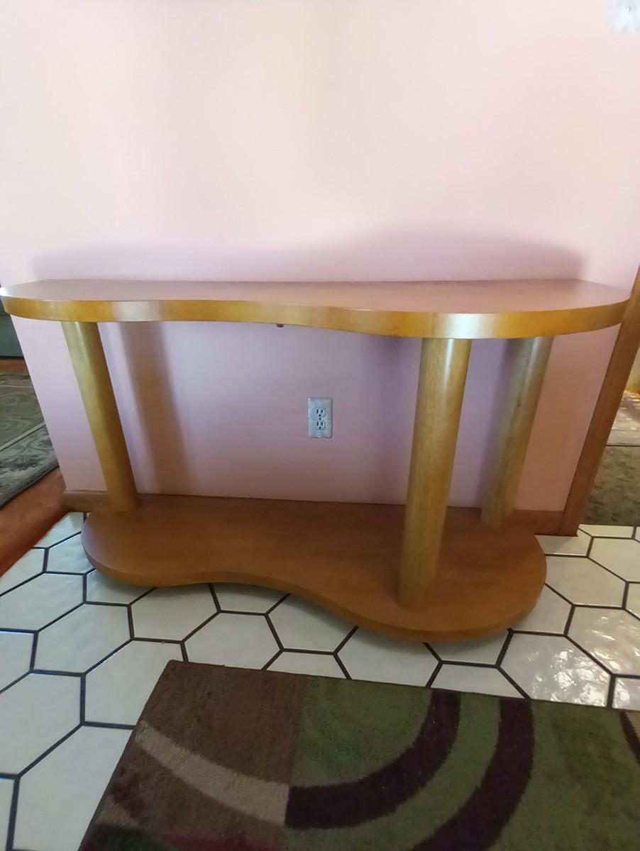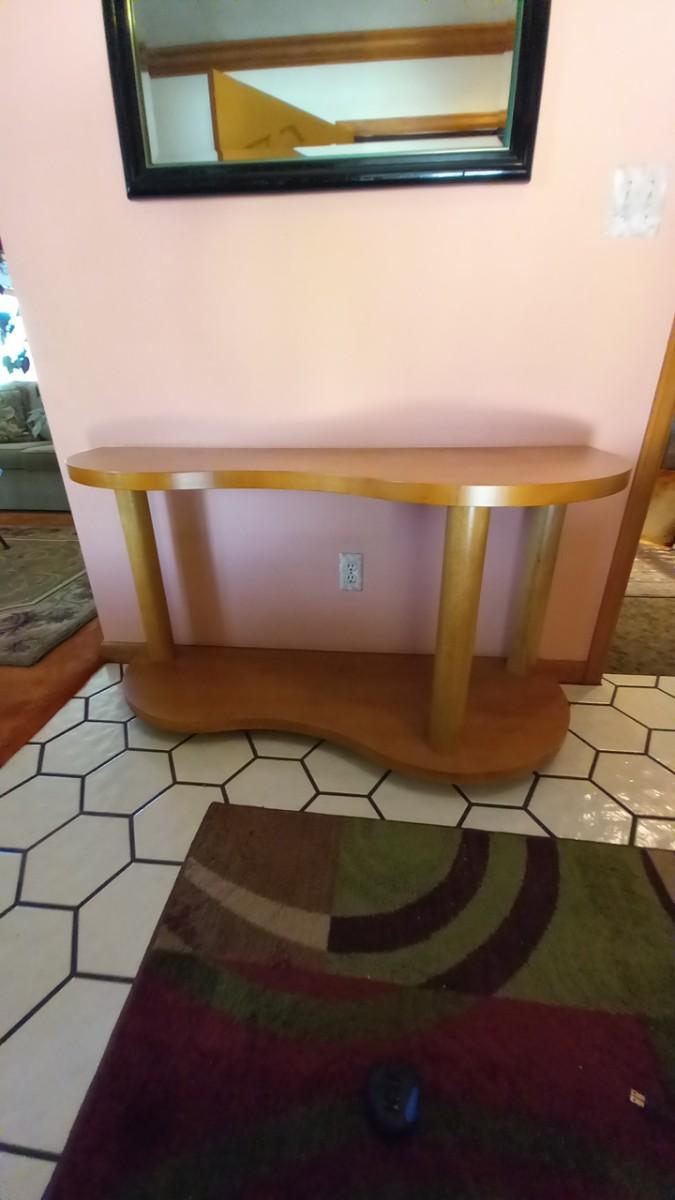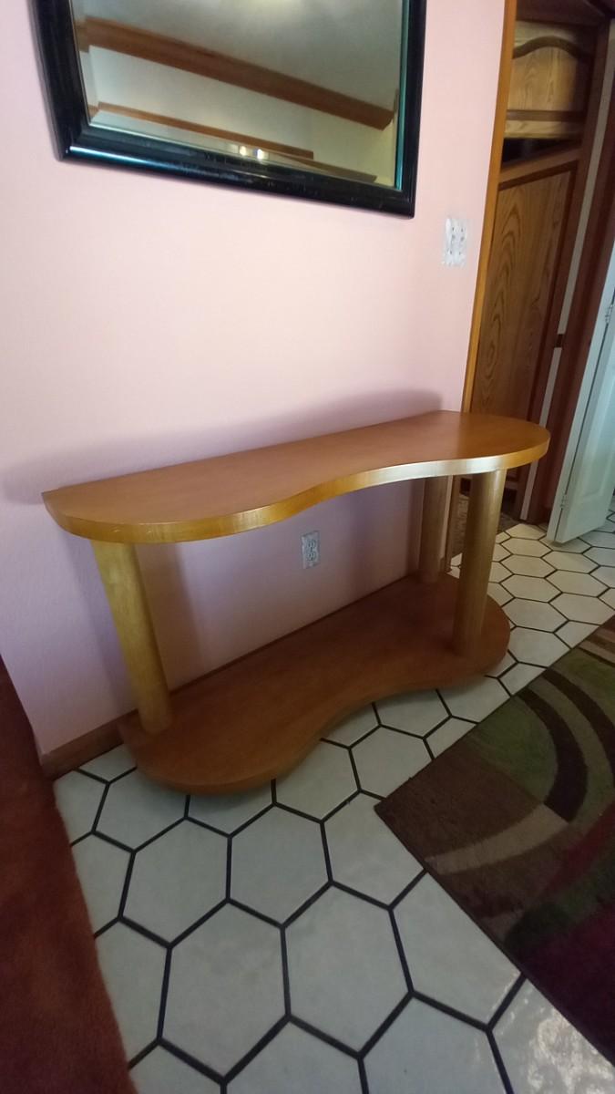 LOT 234  TWO TIER UNIQUELY SHAPED WOODEN ENTRYWAY TABLE