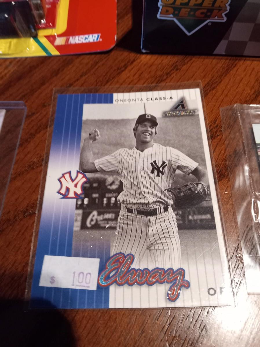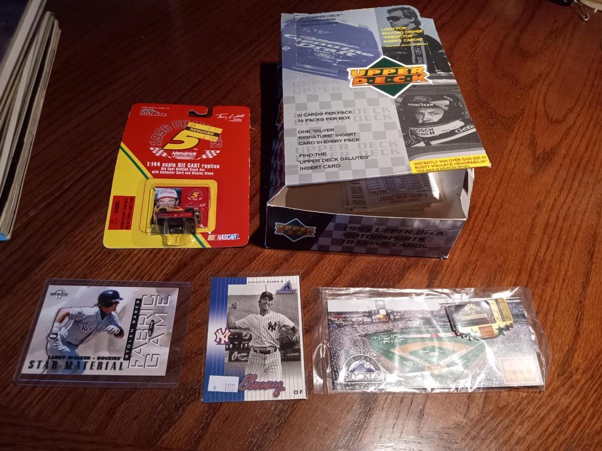 LAPEL OR HAT PINS, JOHN ELWAY'S BASEBALL CARD FROM THE 1 YEAR HE PLAYED IN THE MINORS, LARRY WALKER CARD, PARTIAL BOX OF UPPER DECK MOTORSPORTS TRADING CARDS, MINI TONY LABONTE