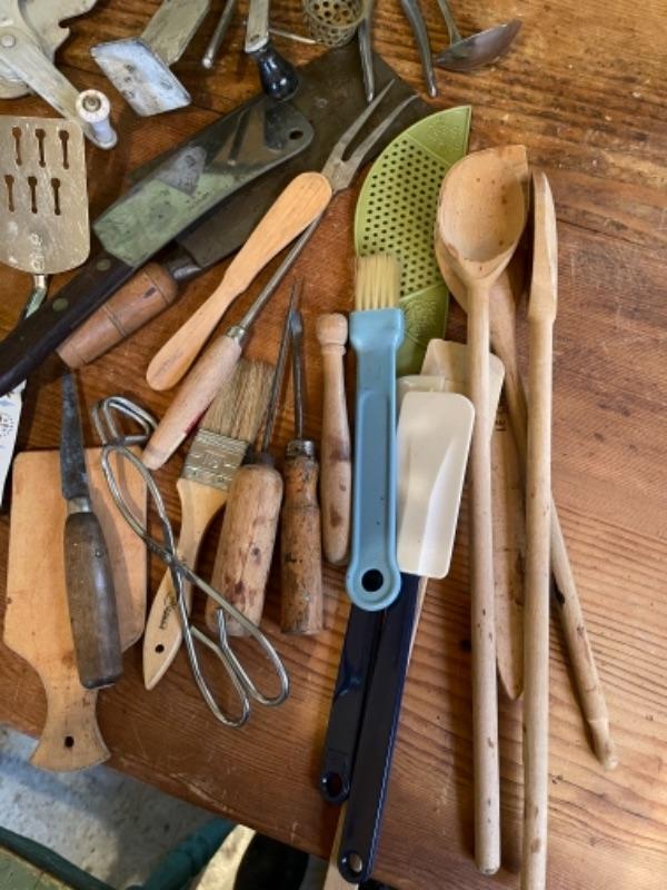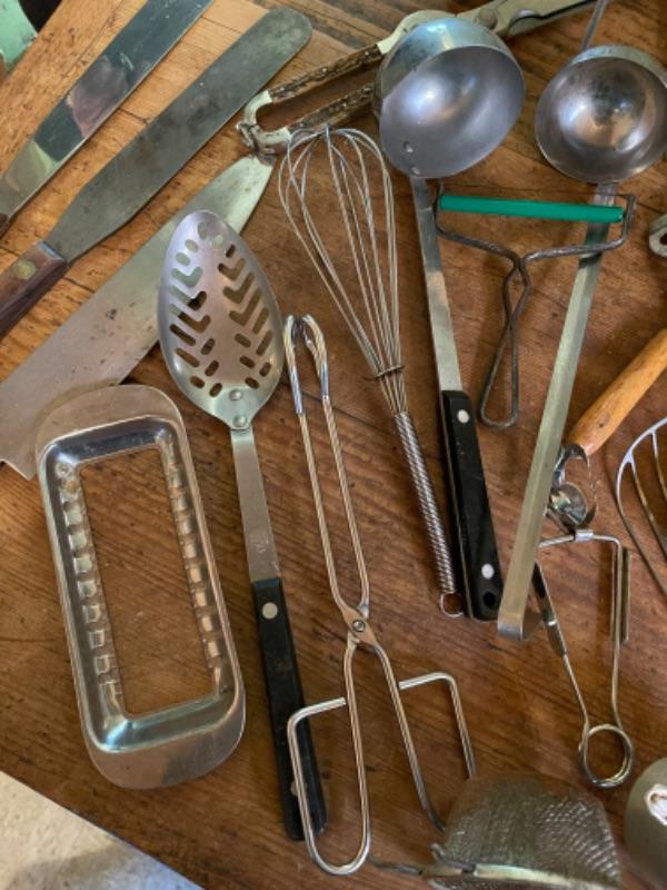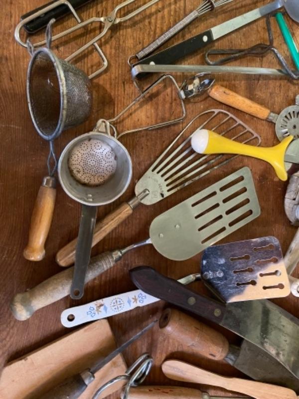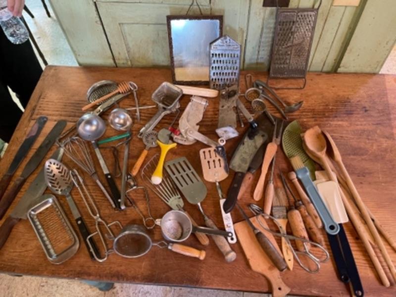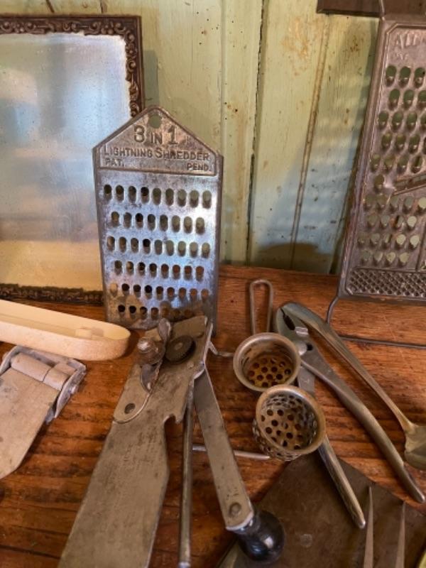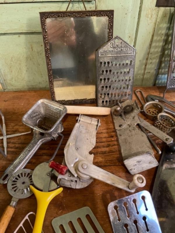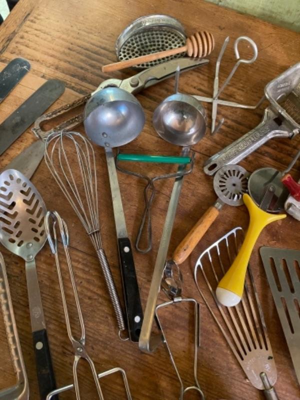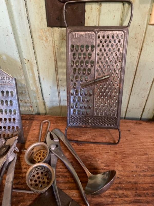 Lot 74K. Vintage cooking utensils“”ladles, graters, shears, butter slicer, cheese slicer, etc.--$65