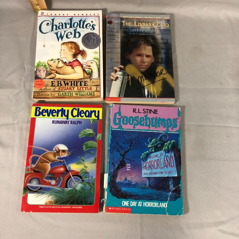 These look like they came from a classroom. They are all in gently read condition (the Goosebumps book has a little more issues with the condition of the cover than the others) and ready to entertain your 4th-8th grader this summer.