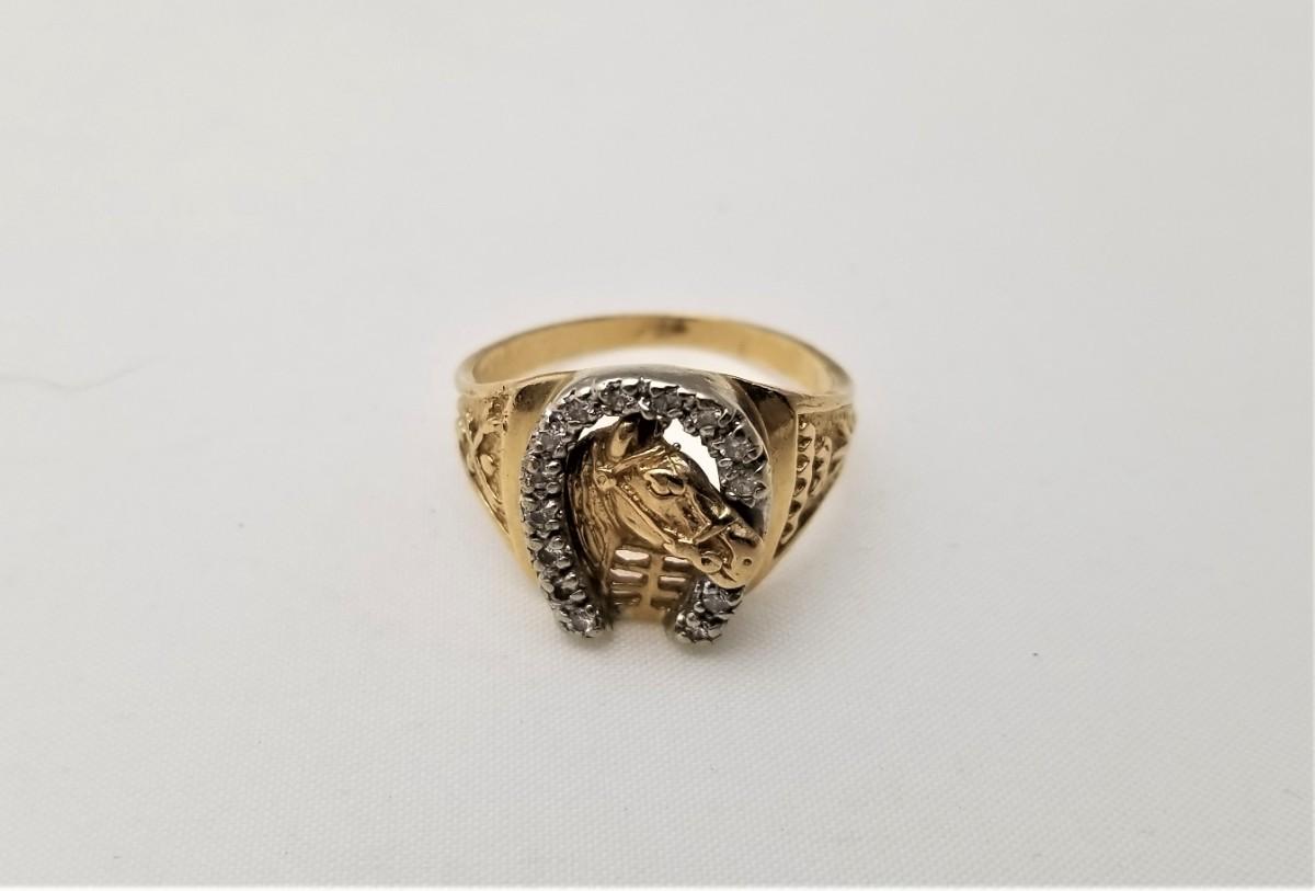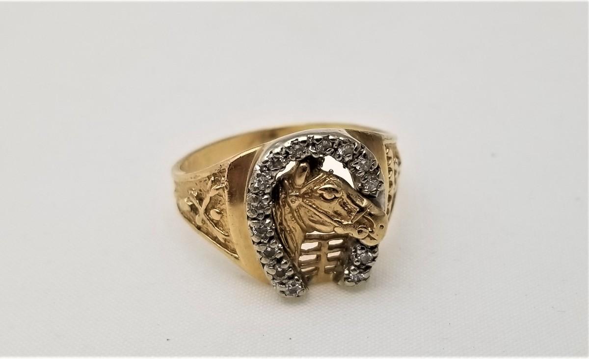 Man's 14kt Yellow Gold ring, size 10, with a horseshoe composed of 12 1 pt. diamonds surrounding a horse's head. This piece was tested by Southern Coin in Metairie. Opening bid is 10% over scrap price. Good used condition.