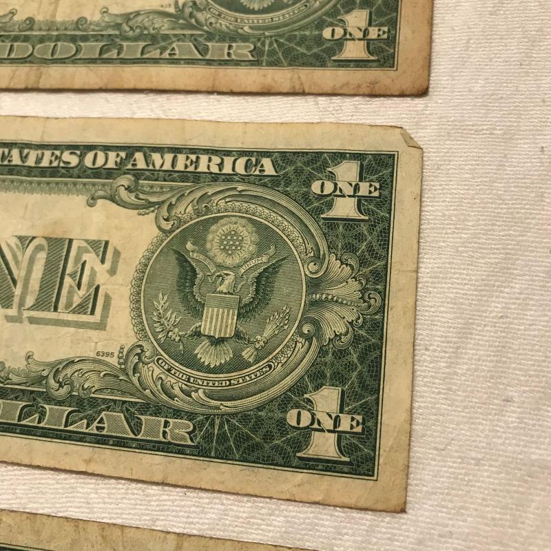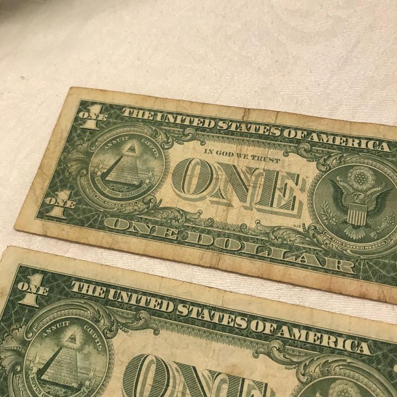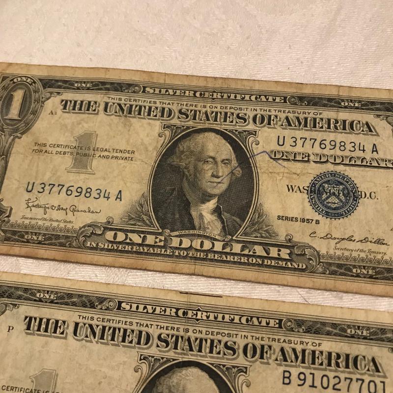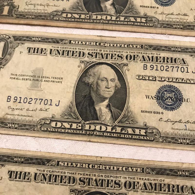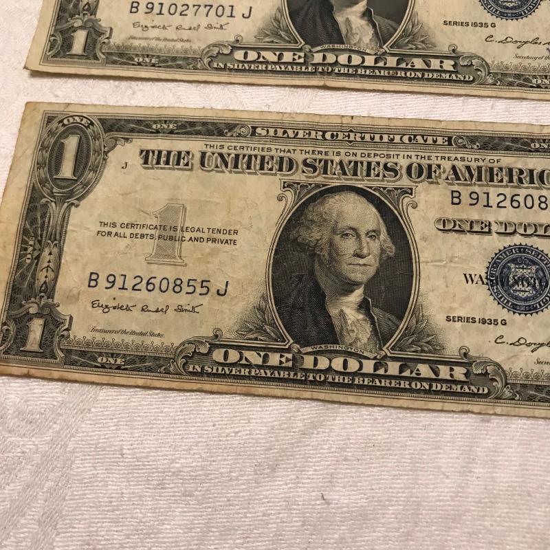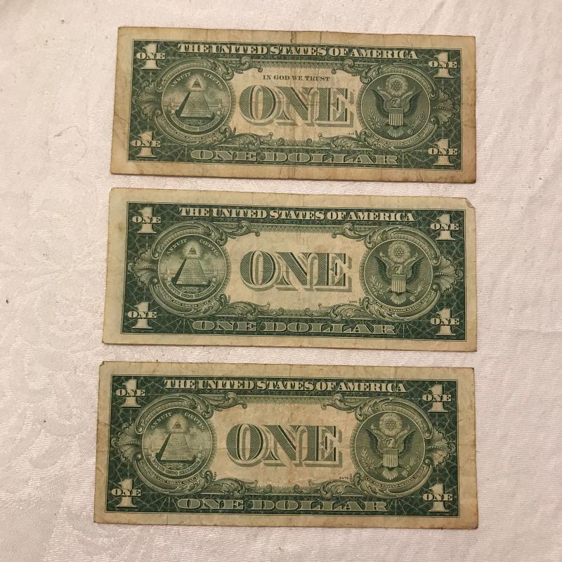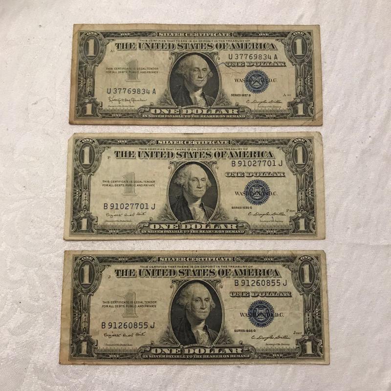 Three silver certificate $1 bills with blue stamp. Two are from 1935 G the year they did NOT have “In God We Trust” on the backside. The third bill is dated 1957. B. Shipping available.