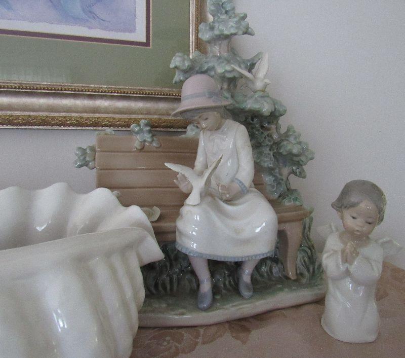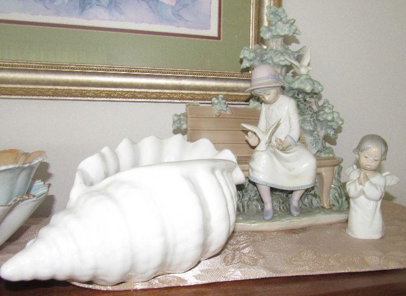 Lot 75- Lladro (2) and Large Porcelain Shell , Girl on bench has several pieces broken and glued, Lladro Angel good cond.