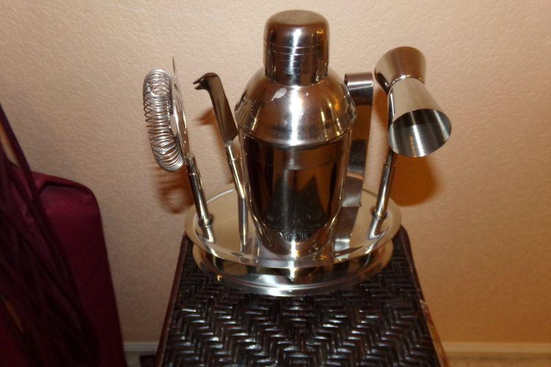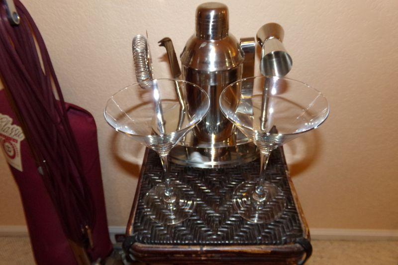 THIS IS A VERY NICE, COMPLETE MARTINI MAKING ESSENTIALS AND GLASSES TOO