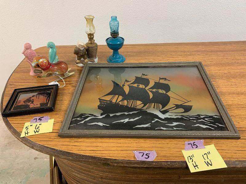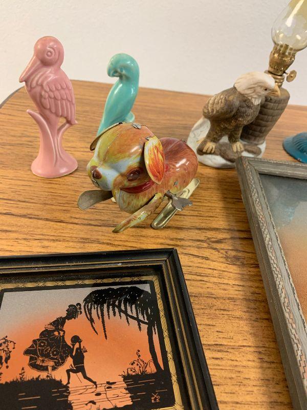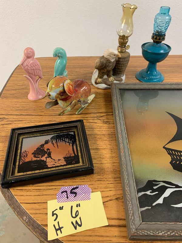2 small oil lamps, vintage toys, pictures, 2 bauer birds and lady statue