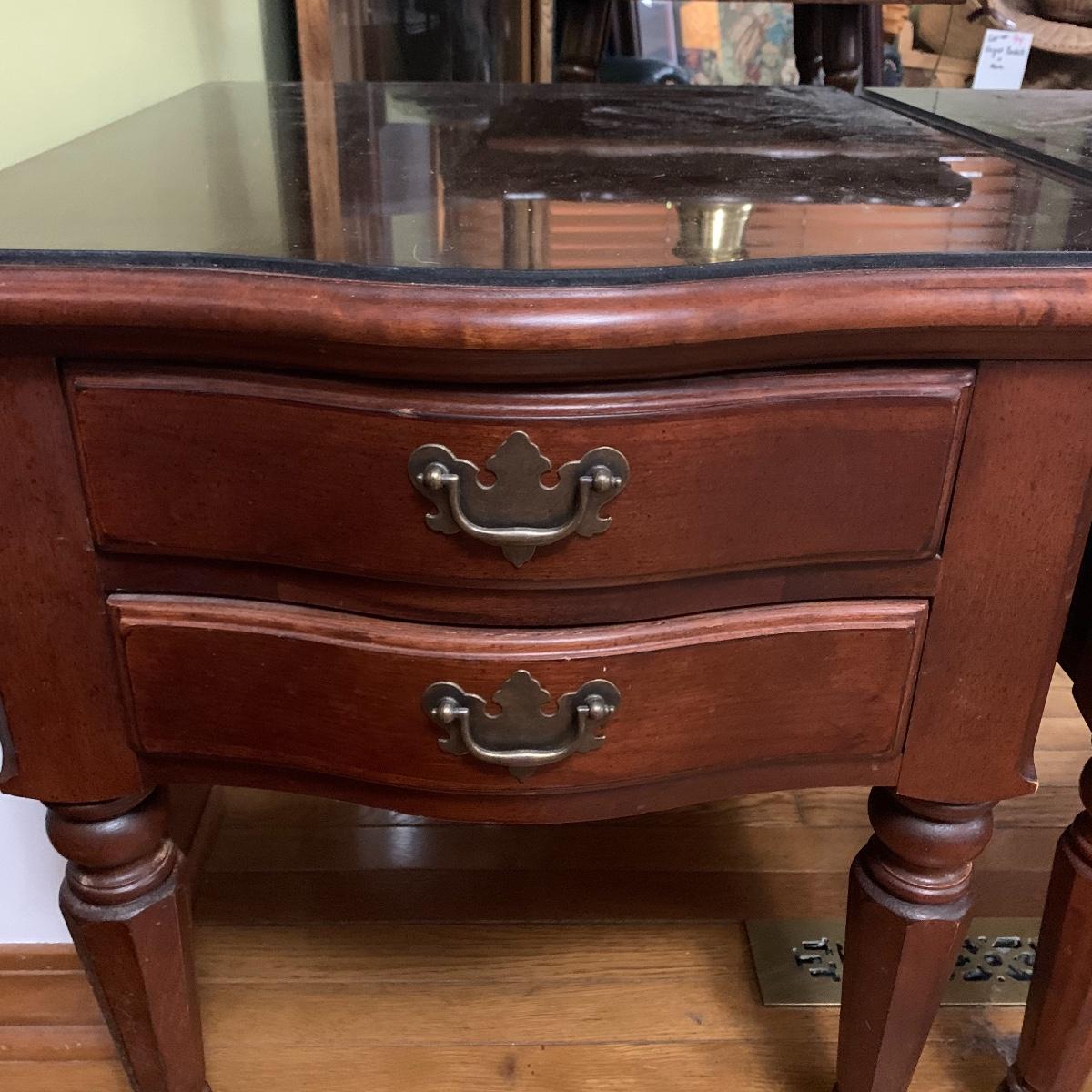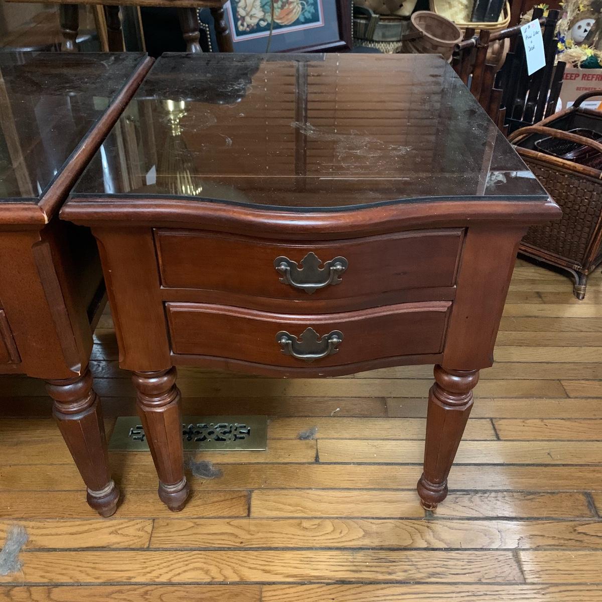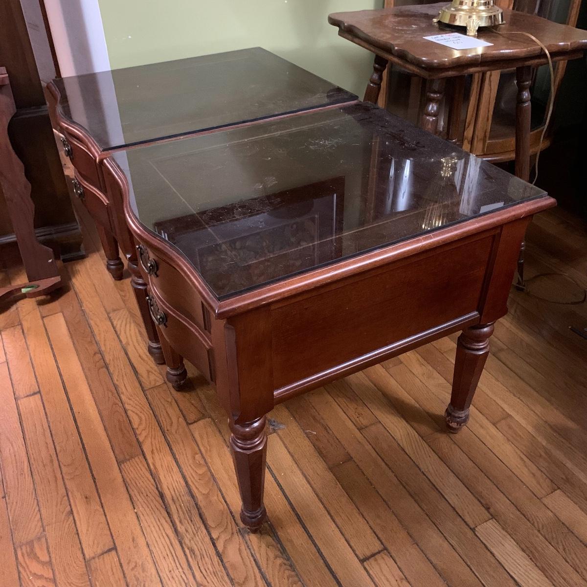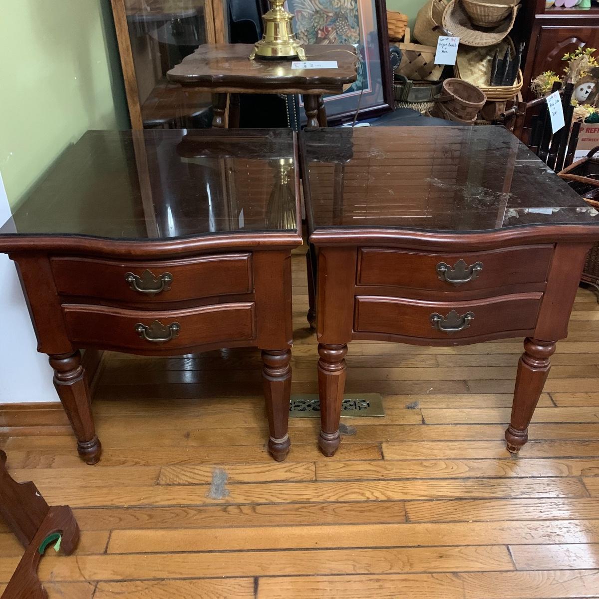 Add these end tables to your living room for a touch of elegance. This pair of cherry tables are manufactured by Riverside Furniture of Fort Smith AR. Both have removable glass, two drawers and measure 22” Wide X 24” tall X 25” deep. They’re both in good condition. Local pickup only.