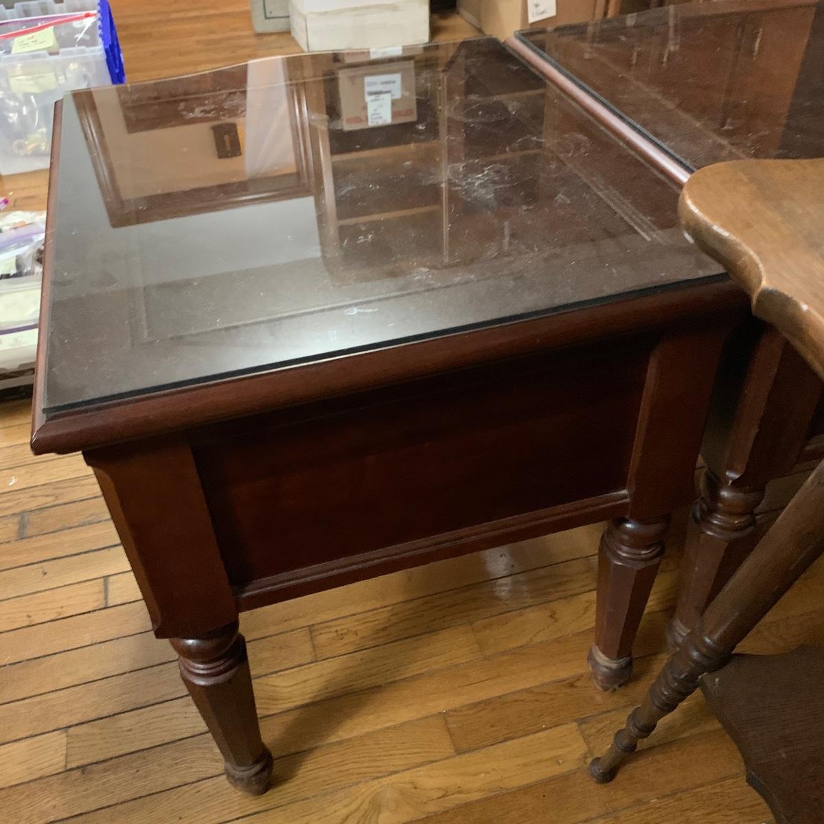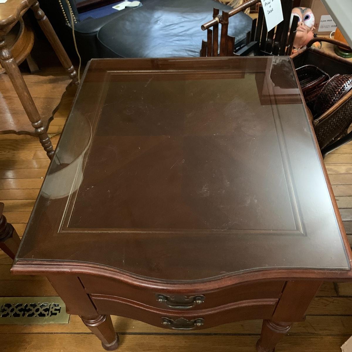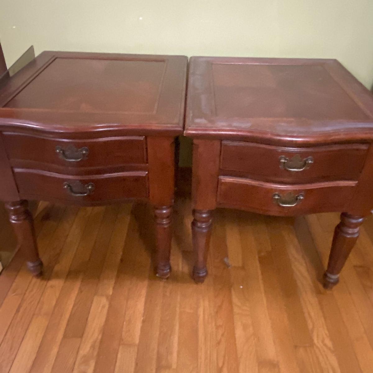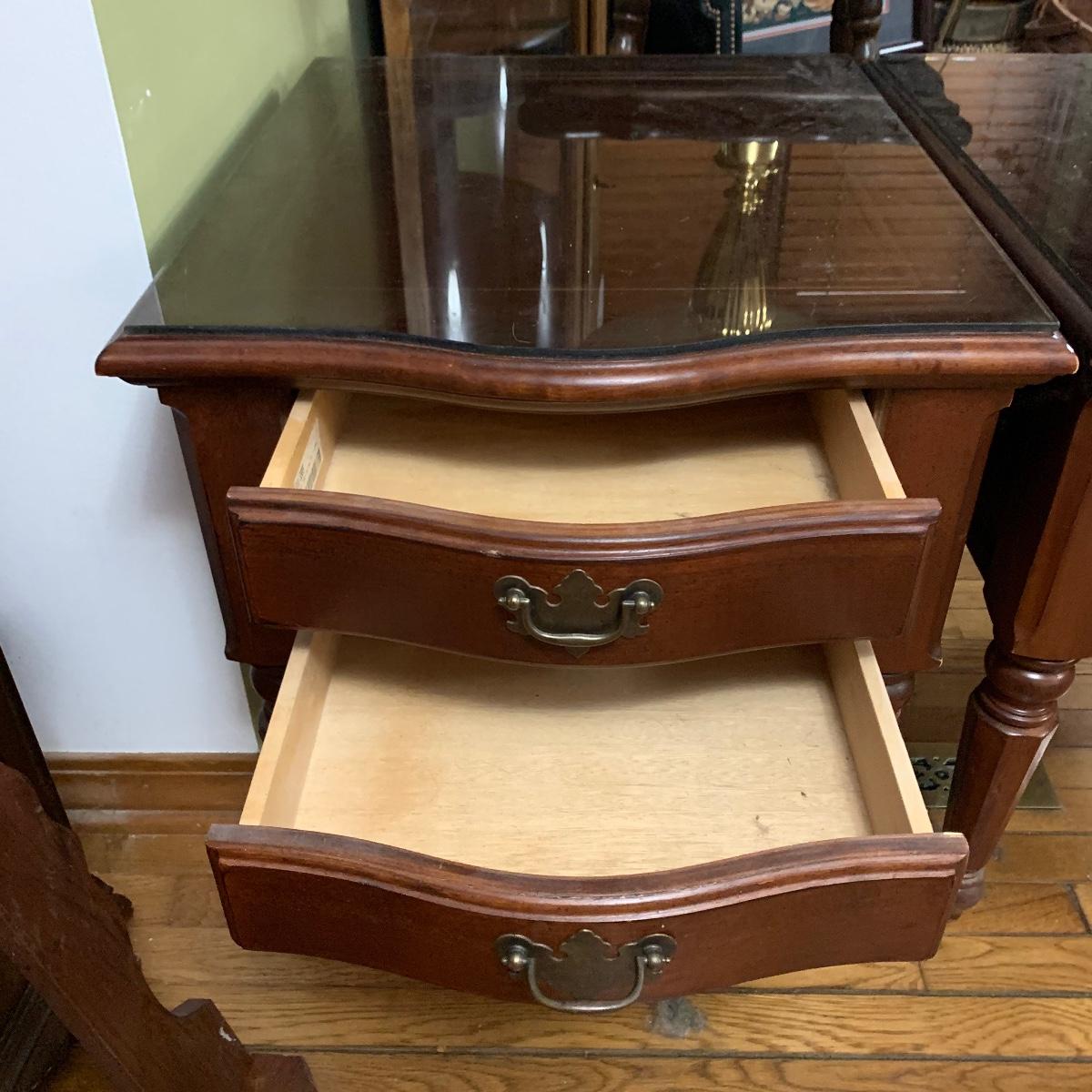Add these end tables to your living room for a touch of elegance. This pair of cherry tables are manufactured by Riverside Furniture of Fort Smith AR. Both have removable glass, two drawers and measure 22” Wide X 24” tall X 25” deep. They’re both in good condition. Local pickup only.