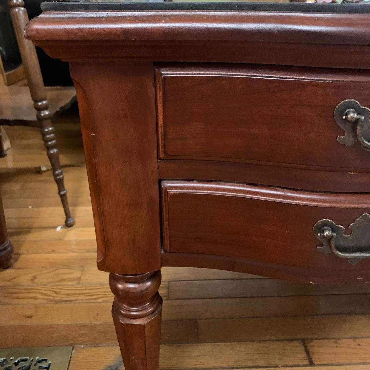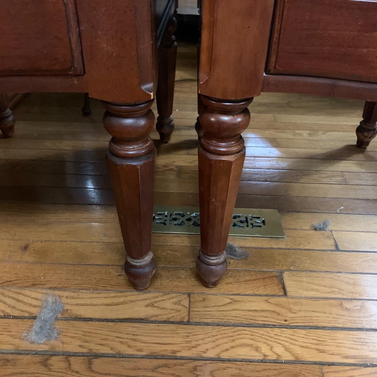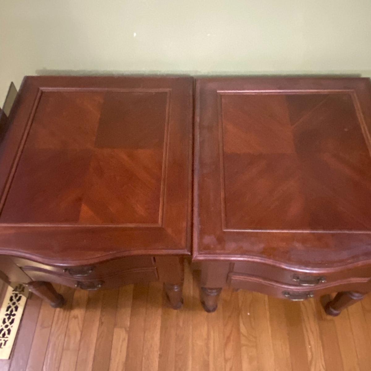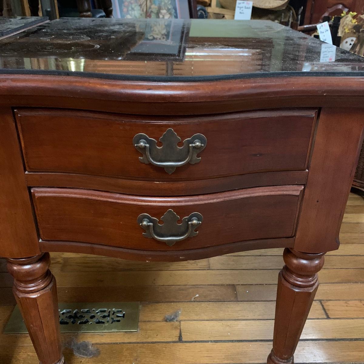 Add these end tables to your living room for a touch of elegance. This pair of cherry tables are manufactured by Riverside Furniture of Fort Smith AR. Both have removable glass, two drawers and measure 22” Wide X 24” tall X 25” deep. They’re both in good condition. Local pickup only.