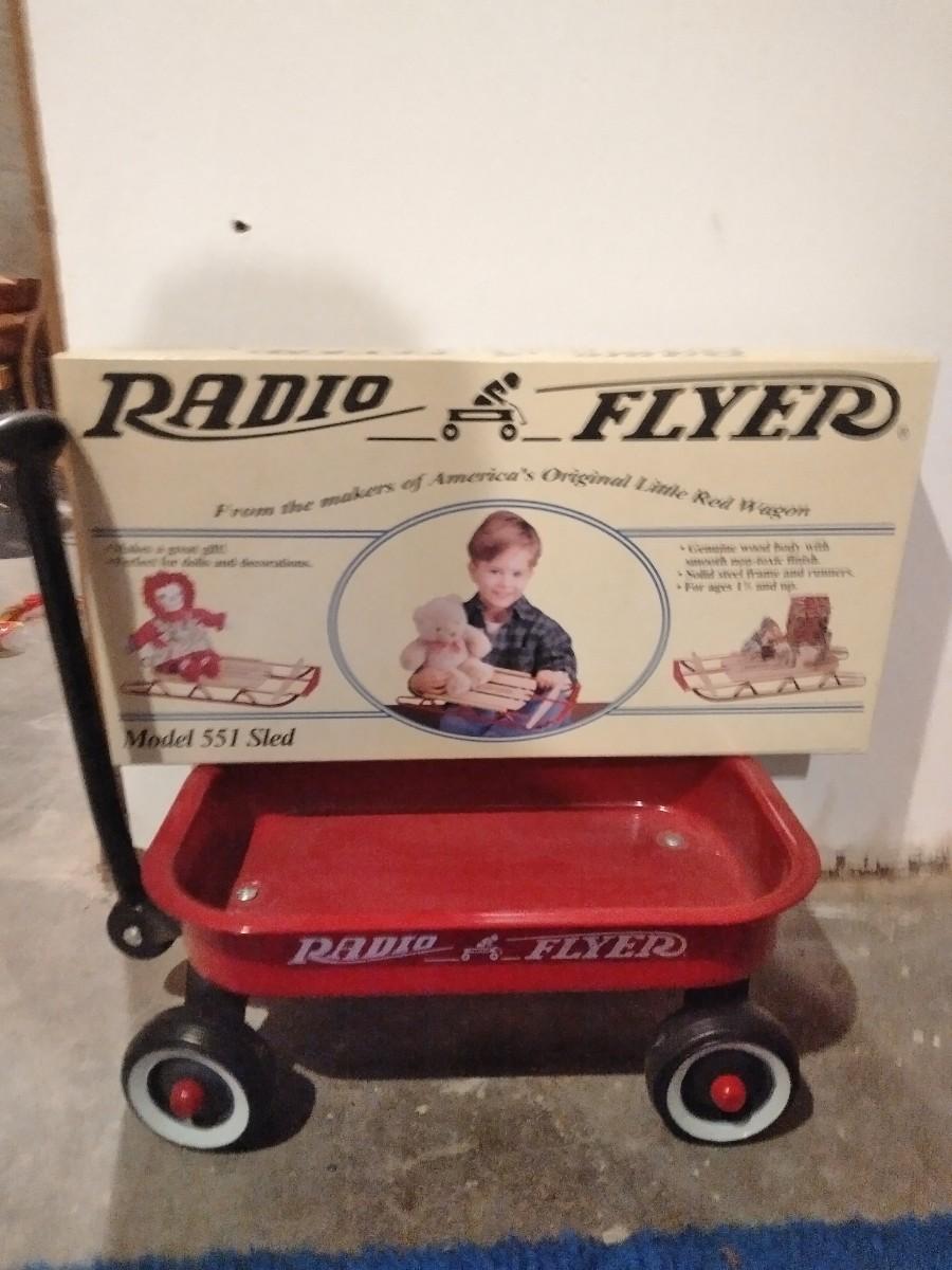 NEW IN THE BOX, MINIATURE DOLL SIZED RADIO FLYER SLED MODEL 551. MINIATURE RADIO FLYER METAL WAGON.