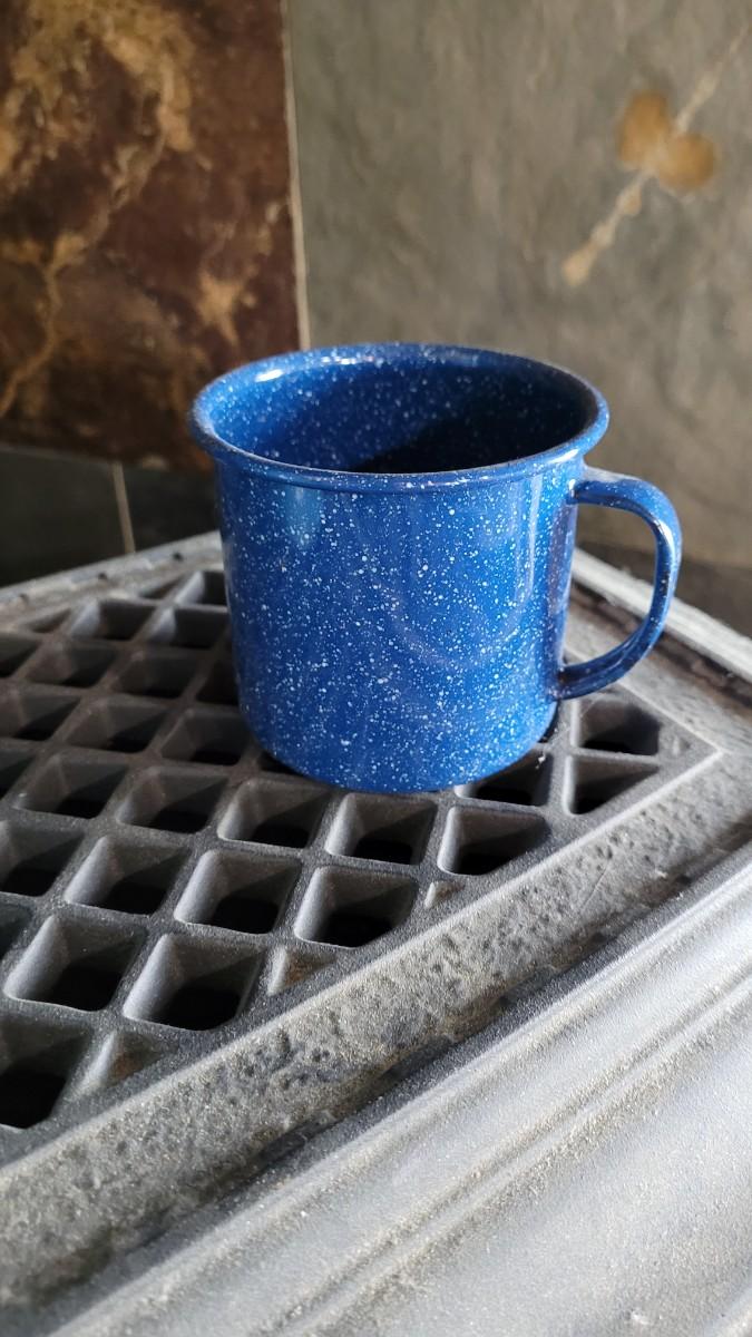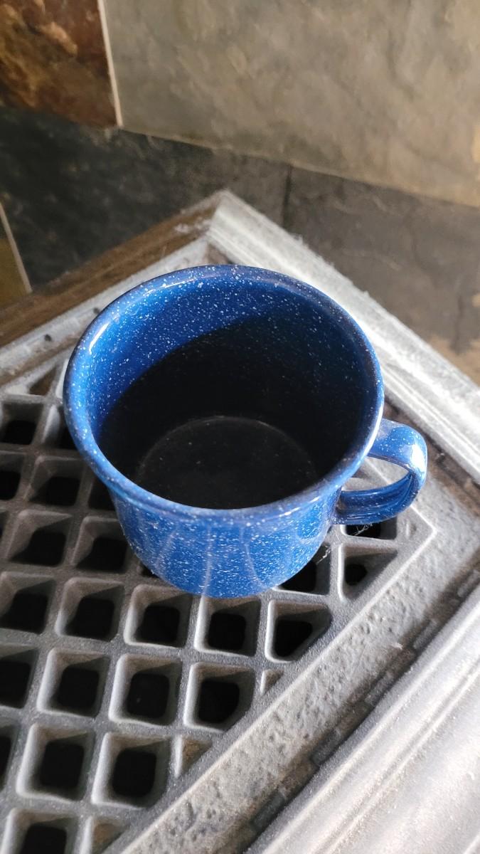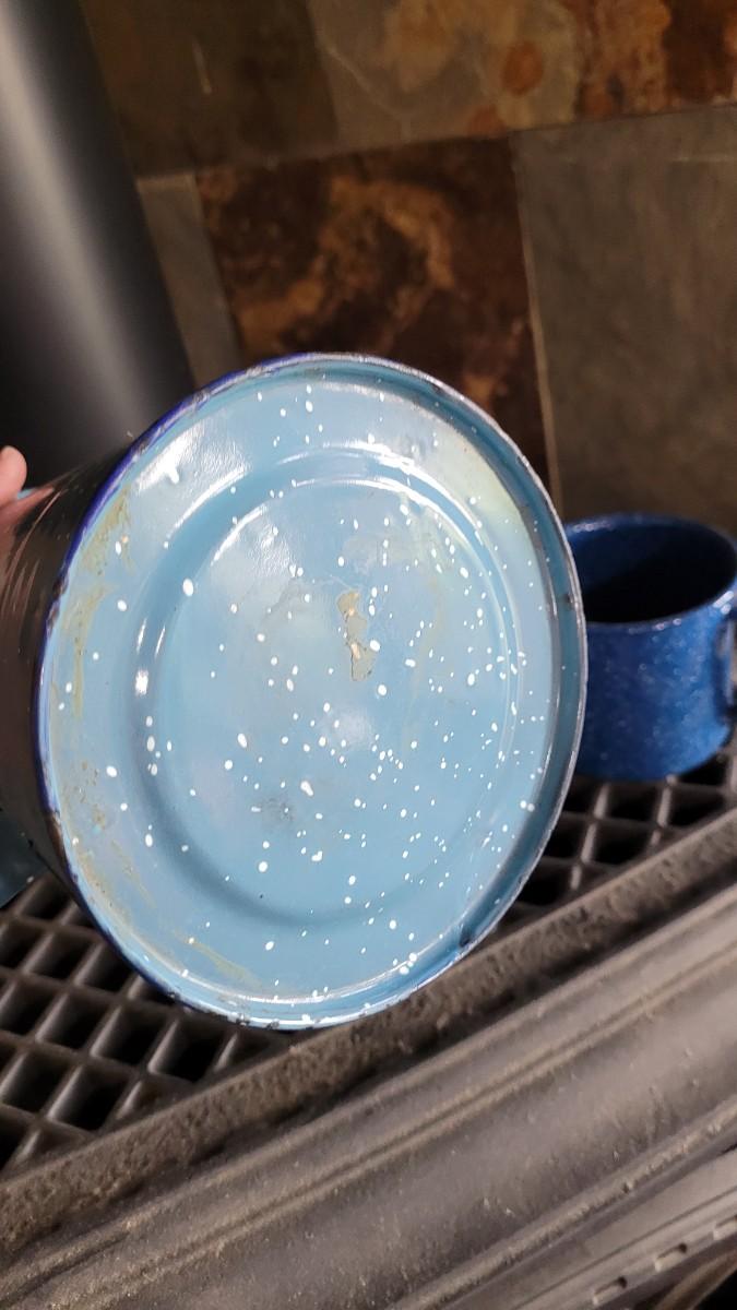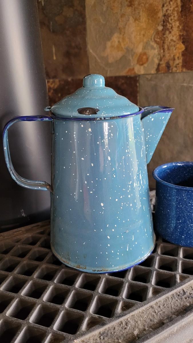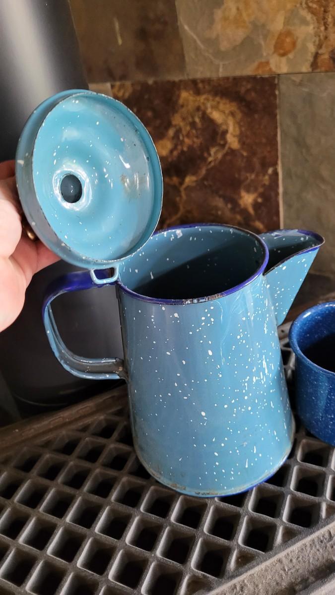 Lot 75: Vintage Enamel Robin's Egg Blue Speckled Coffee Pot and Blue Speckled Coffee Cup