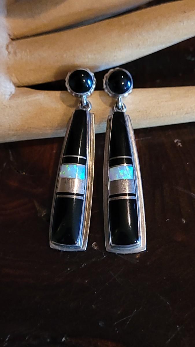 Lot 75: Navajo Sterling Silver, Opal and Onyx Earrings by Webster
