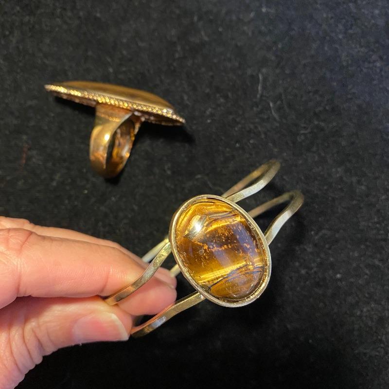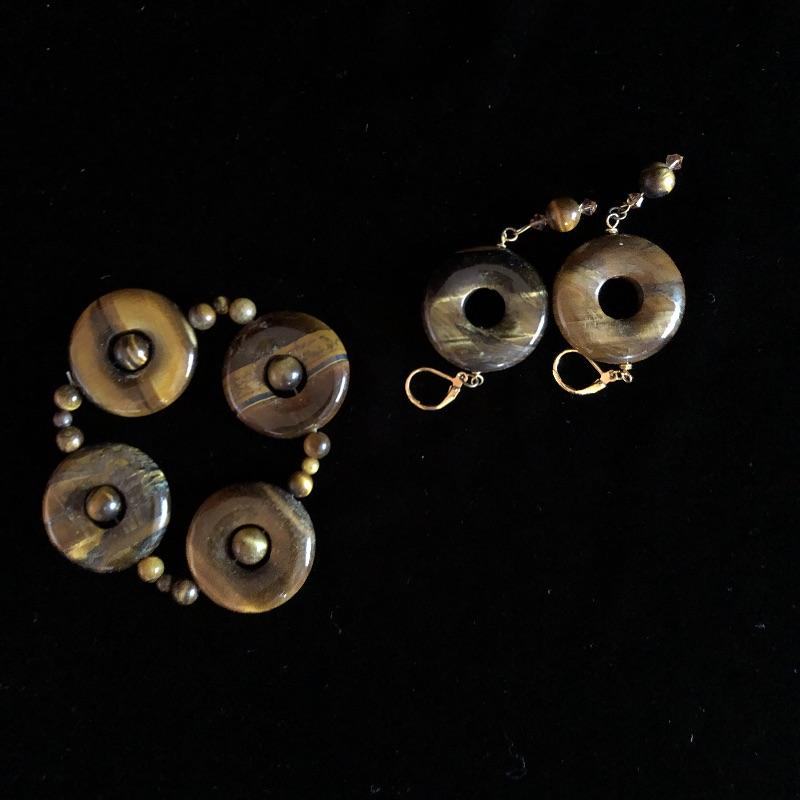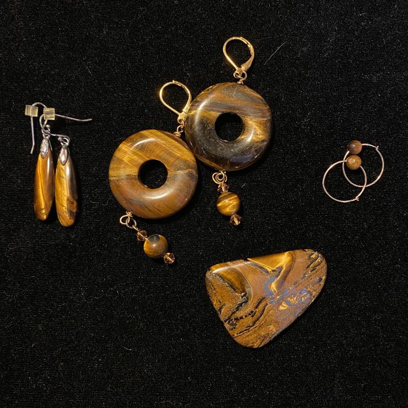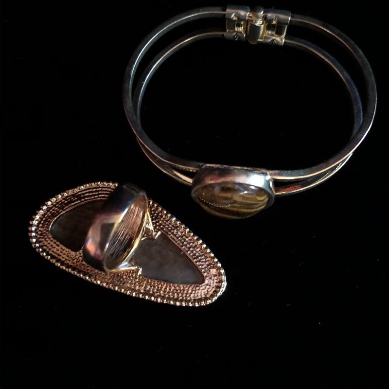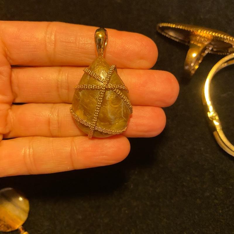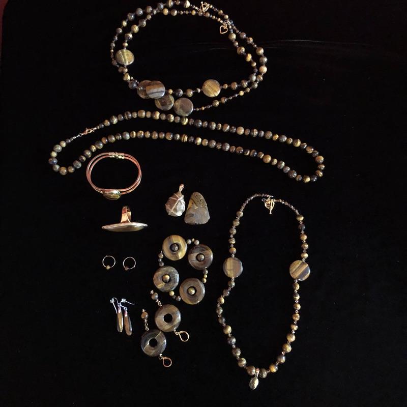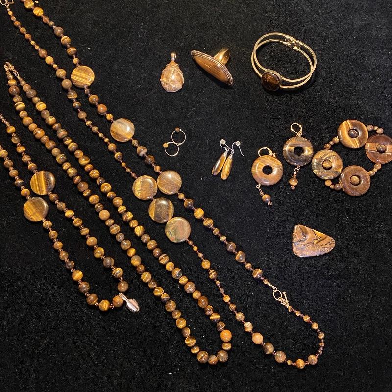 This lot contains many pieces of brown-tinted, gold-accented agate jewelry. It contains three pairs of earrings, two bracelets, a pendant, a ring, three necklaces and one stone. The largest necklace (heart pendant) measures 20.5” stretched out. Shipping available.